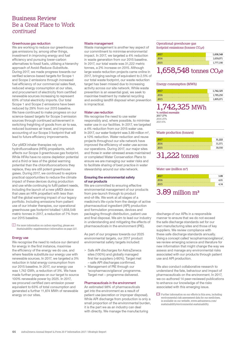 Business Review Be a Great Place to Work continued Greenhouse gas reduction We are working to reduce our greenhouse gas emissions by, among other things, investment in improving energy and fuel efficiency and pursuing lower-carbon alternatives to fossil fuels, utilising a hierarchy approach of Avoid-Reduce-Substitute. During 2017, we made progress towards our verified science-based targets for Scope 1 and Scope 2 emissions through increased fuel efficiency of our commercial sales fleet, reduced energy consumption at our sites, and procurement of electricity from certified renewable sources increasing to represent 63% of total electricity imports. Our total Scope 1 and Scope 2 emissions have been reduced by 29% from our 2015 baseline. We have continued to make progress on our science-based targets for Scope 3 emission sources through continued achievement in switching freighting of goods from air to sea, reduced business air travel, and improved accounting of our Scope 3 footprint that will lead to future efficiency improvements. Waste management Waste management is another key aspect of our commitment to minimise environmental impact. In 2017, we targeted a 4% reduction in waste generation from our 2015 baseline. In 2017, our total waste was 31,222 metric tonnes, a 2% increase on 2015. Although large waste reduction projects came online in 2017, bringing savings of equivalent to 2.5% of our total waste footprint, our waste reduction target has been missed due to increasing activity across our site network. While waste prevention is an essential goal, we seek to maximise treatment by material recycling and avoiding landfill disposal when prevention is impractical. Operational greenhouse gas footprint emissions (tonnes COe) 1,658,548 tonnes COe Energy consumption (MWh) 1,742,325 MWh % certified renewable 2017 27% 2016 25% 2015 6% Water use reduction We recognise the need to use water responsibly and, where possible, to minimise water use in our facilities. In 2017, we targeted a 4% reduction from our 2015 water use. In 2017, our water footprint was 3.89 million m3, a 10% reduction. Water reduction and reuse projects throughout our site network have improved the efficiency of water use across our operations. During 2017, our major sites and those in water-stressed areas maintained or completed Water Conservation Plans to ensure we are managing our water risks and to facilitate sharing of best practice in water stewardship around our site network. Waste production (tonnes) Our pMDI inhaler therapies rely on hydrofluoroalkane (HFA) propellants, which affects our Scope 3 greenhouse gas footprint. While HFAs have no ozone depletion potential and a third or less of the global warming potential than the chlorofluorocarbons they replace, they are still potent greenhouse gases. During 2017, we continued to explore practical opportunities to reduce the climate impact of these devices during production and use while continuing to fulfil patient needs, including the launch of a new pMDI device that uses an HFA propellant with less than half the global warming impact of our legacy portfolio. Including emissions from patient use of our inhaler therapies, our operational greenhouse gas footprint totalled 1,658,548 metric tonnes in 2017, a reduction of 7% from our 2015 baseline. 31,222 tonnes Water use (million m³) Ensuring the environmental safety of our products We are committed to ensuring effective environmental management of our products from pre-launch through to product end-of-life. We work at all stages of a medicine’s life-cycle from the design of active pharmaceutical ingredient (API) production and formulation processes, devices and packaging through distribution, patient use and final disposal. We aim to lead our industry in understanding and mitigating the effects of pharmaceuticals in the environment (PIE). 3.89 million m³ discharge of our APIs in a responsible manner to ensure that we do not exceed the safe discharge standards set for our own manufacturing sites and those of key suppliers. We review compliance with these safe discharge standards annually. Using a concept called ‘ecopharmacovigilance’, we review emerging science and literature for new information that might change the way we assess and manage any environmental risks associated with our products through patient use and API production. For more information on carbon reporting, please see Sustainability: supplementary information on page 227. As part of our progress towards our 2025 environmental targets, our 2017 product environmental safety targets included: Energy use We recognise the need to reduce our demand for energy in the first instance, maximise the efficiency of the energy we do use, and where feasible substitute our energy use with renewable sources. In 2017, we targeted a 3% reduction in total energy consumption from our 2015 baseline. In 2017, our energy use was 1,742 GWh, a reduction of 3%. We have made further progress on our target to source 100% renewable power by 2025. In 2017, we procured certified zero emission power equivalent to 63% of total consumption and generated a further 11,874 MWh of renewable energy on our sites. > Safe API discharges for AstraZeneca sites (100%) and globally managed first tier suppliers (>90%). Target met – safe API discharges confirmed. > Management of PIE through our ‘ecopharmacovigilance’ programme. Target met – programme delivered. We also conduct collaborative research to understand the fate, behaviour and impact of pharmaceuticals on the environment. In 2017, we co-authored 14 peer-reviewed publications to enhance our knowledge of the risks associated with this emerging issue. Pharmaceuticals in the environment An estimated 98% of pharmaceuticals get into the environment as a result of patient use (excretion or improper disposal). While API discharge from production is only a small proportion of the environmental burden, it is the part we as an industry can 