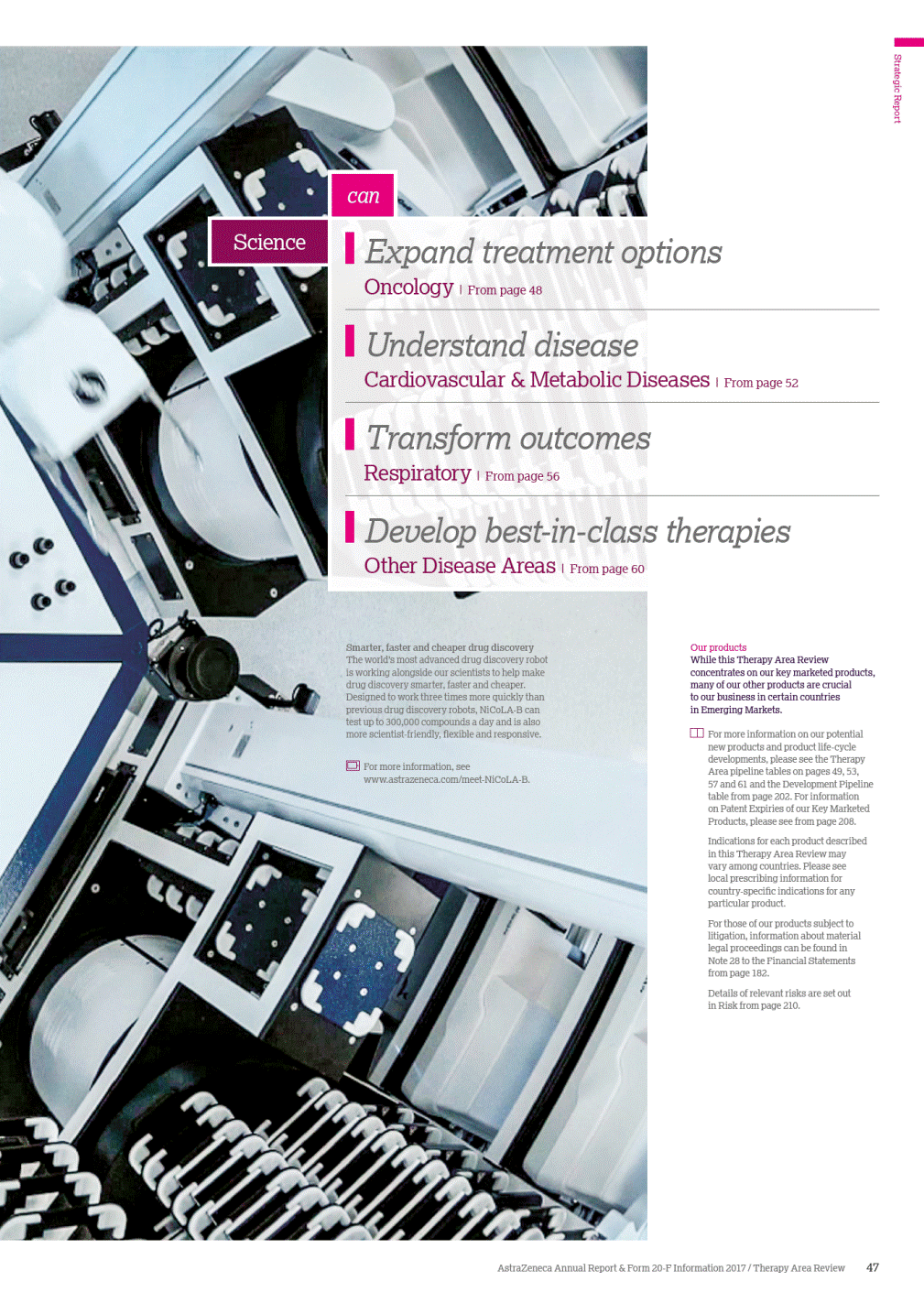 Smarter, faster and cheaper drug discovery The world’s most advanced drug discovery robot is working alongside our scientists to help make drug discovery smarter, faster and cheaper. Designed to work three times more quickly than previous drug discovery robots, NiCoLA-B can test up to 300,000 compounds a day and is also more scientist-friendly, flexible and responsive. Our products While this Therapy Area Review concentrates on our key marketed products, many of our other products are crucial to our business in certain countries in Emerging Markets. For more information on our potential new products and product life-cycle developments, please see the Therapy Area pipeline tables on pages 49, 53, 57 and 61 and the Development Pipeline table from page 202. For information on Patent Expiries of our Key Marketed Products, please see from page 208. For more information, see www.astrazeneca.com/meet-NiCoLA-B. Indications for each product described in this Therapy Area Review may vary among countries. Please see local prescribing information for country-specific indications for any particular product. For those of our products subject to litigation, information about material legal proceedings can be found in Note 28 to the Financial Statements from page 182. Details of relevant risks are set out in Risk from page 210. 47 AstraZeneca Annual Report & Form 20-F Information 2017 / Therapy Area Review Strategic Report can Science Expand treatment options Oncology | From page 48 Understand disease Cardiovascular & Metabolic Diseases | From page 52 Transform outcomes Respiratory | From page 56 Develop best-in-class therapies Other Disease Areas | From page 60