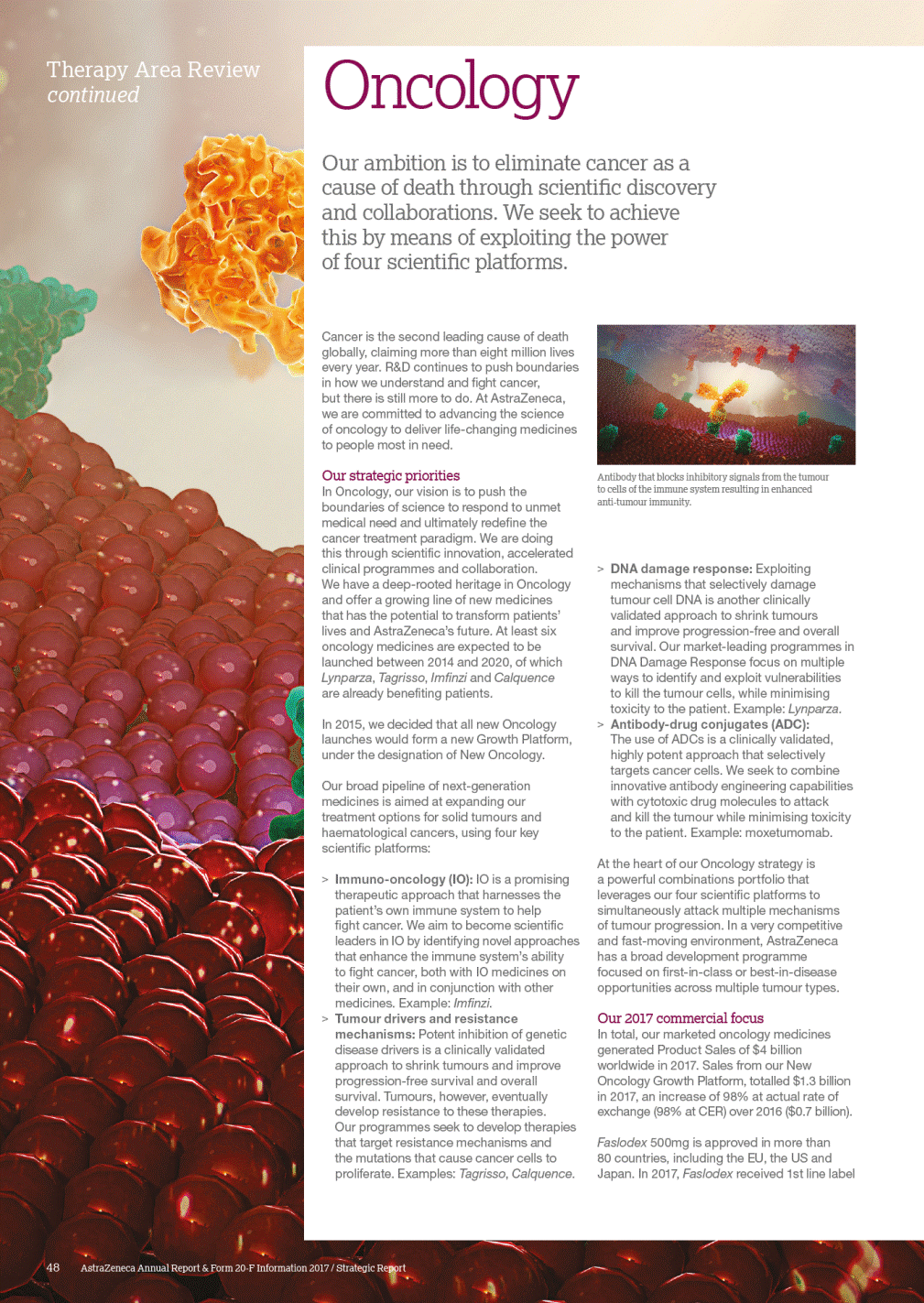 Oncology Our ambition is to eliminate cancer as a cause of death through scientific discovery and collaborations. We seek to achieve this by means of exploiting the power of four scientific platforms. Therapy Area Review continued Cancer is the second leading cause of death globally, claiming more than eight million lives every year. R&D continues to push boundaries in how we understand and fight cancer, but there is still more to do. At AstraZeneca, we are committed to advancing the science of oncology to deliver life-changing medicines to people most in need. Our strategic priorities In Oncology, our vision is to push the boundaries of science to respond to unmet medical need and ultimately redefine the cancer treatment paradigm. We are doing this through scientific innovation, accelerated clinical programmes and collaboration. We have a deep-rooted heritage in Oncology and offer a growing line of new medicines that has the potential to transform patients’ lives and AstraZeneca’s future. At least six oncology medicines are expected to be launched between 2014 and 2020, of which Lynparza, Tagrisso, Imfinzi and Calquence are already benefiting patients. Antibody that blocks inhibitory signals from the tumour to cells of the immune system resulting in enhanced anti-tumour immunity. > DNA damage response: Exploiting mechanisms that selectively damage tumour cell DNA is another clinically validated approach to shrink tumours and improve progression-free and overall survival. Our market-leading programmes in DNA Damage Response focus on multiple ways to identify and exploit vulnerabilities to kill the tumour cells, while minimising toxicity to the patient. Example: Lynparza. > Antibody-drug conjugates (ADC): The use of ADCs is a clinically validated, highly potent approach that selectively targets cancer cells. We seek to combine innovative antibody engineering capabilities with cytotoxic drug molecules to attack and kill the tumour while minimising toxicity to the patient. Example: moxetumomab. In 2015, we decided that all new Oncology launches would form a new Growth Platform, under the designation of New Oncology. Our broad pipeline of next-generation medicines is aimed at expanding our treatment options for solid tumours and haematological cancers, using four key scientific platforms: At the heart of our Oncology strategy is a powerful combinations portfolio that leverages our four scientific platforms to simultaneously attack multiple mechanisms of tumour progression. In a very competitive and fast-moving environment, AstraZeneca has a broad development programme focused on first-in-class or best-in-disease opportunities across multiple tumour types. > Immuno-oncology (IO): IO is a promising therapeutic approach that harnesses the patient’s own immune system to help fight cancer. We aim to become scientific leaders in IO by identifying novel approaches that enhance the immune system’s ability to fight cancer, both with IO medicines on their own, and in conjunction with other medicines. Example: Imfinzi. > Tumour drivers and resistance mechanisms: Potent inhibition of genetic disease drivers is a clinically validated approach to shrink tumours and improve progression-free survival and overall survival. Tumours, however, eventually develop resistance to these therapies. Our programmes seek to develop therapies that target resistance mechanisms and the mutations that cause cancer cells to proliferate. Examples: Tagrisso, Calquence. Our 2017 commercial focus In total, our marketed oncology medicines generated Product Sales of $4 billion worldwide in 2017. Sales from our New Oncology Growth Platform, totalled $1.3 billion in 2017, an increase of 98% at actual rate of exchange (98% at CER) over 2016 ($0.7 billion). Faslodex 500mg is approved in more than 80 countries, including the EU, the US and Japan. In 2017, Faslodex received 1st line label 48 AstraZeneca Annual Report & Form 20-F Information 2017 / Strategic Report