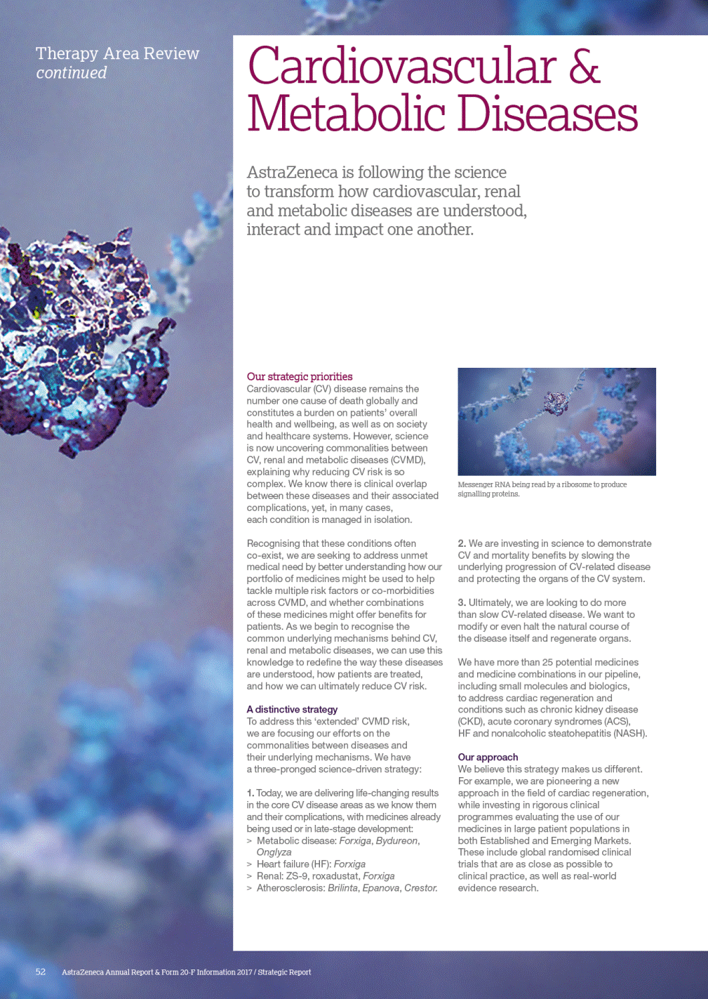 Cardiovascular & Metabolic Diseases AstraZeneca is following the science to transform how cardiovascular, renal and metabolic diseases are understood, interact and impact one another. Therapy Area Review continued Our strategic priorities Cardiovascular (CV) disease remains the number one cause of death globally and constitutes a burden on patients’ overall health and wellbeing, as well as on society and healthcare systems. However, science is now uncovering commonalities between CV, renal and metabolic diseases (CVMD), explaining why reducing CV risk is so complex. We know there is clinical overlap between these diseases and their associated complications, yet, in many cases, each condition is managed in isolation. Messenger RNA being read by a ribosome to produce signalling proteins. Recognising that these conditions often co-exist, we are seeking to address unmet medical need by better understanding how our portfolio of medicines might be used to help tackle multiple risk factors or co-morbidities across CVMD, and whether combinations of these medicines might offer benefits for patients. As we begin to recognise the common underlying mechanisms behind CV, renal and metabolic diseases, we can use this knowledge to redefine the way these diseases are understood, how patients are treated, and how we can ultimately reduce CV risk. 2. We are investing in science to demonstrate CV and mortality benefits by slowing the underlying progression of CV-related disease and protecting the organs of the CV system. 3. Ultimately, we are looking to do more than slow CV-related disease. We want to modify or even halt the natural course of the disease itself and regenerate organs. We have more than 25 potential medicines and medicine combinations in our pipeline, including small molecules and biologics, to address cardiac regeneration and conditions such as chronic kidney disease (CKD), acute coronary syndromes (ACS), HF and nonalcoholic steatohepatitis (NASH). A distinctive strategy To address this ‘extended’ CVMD risk, we are focusing our efforts on the commonalities between diseases and their underlying mechanisms. We have a three-pronged science-driven strategy: Our approach We believe this strategy makes us different. For example, we are pioneering a new approach in the field of cardiac regeneration, while investing in rigorous clinical programmes evaluating the use of our medicines in large patient populations in both Established and Emerging Markets. These include global randomised clinical trials that are as close as possible to clinical practice, as well as real-world evidence research. 1. Today, we are delivering life-changing results in the core CV disease areas as we know them and their complications, with medicines already being used or in late-stage development: > Metabolic disease: Forxiga, Bydureon, Onglyza > Heart failure (HF): Forxiga > Renal: ZS-9, roxadustat, Forxiga > Atherosclerosis: Brilinta, Epanova, Crestor. 52 AstraZeneca Annual Report & Form 20-F Information 2017 / Strategic Report