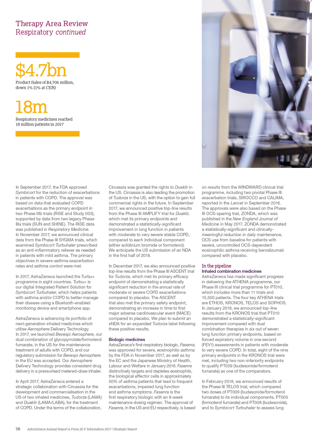Therapy Area Review Respiratory continued $4.7bn Product Sales of $4,706 million, down 1% (1% at CER) 18m Respiratory medicines reached 18 million patients in 2017 In September 2017, the FDA approved Symbicort for the reduction of exacerbations in patients with COPD. The approval was based on data that evaluated COPD exacerbations as the primary endpoint in two Phase IIIb trials (RISE and Study 003), supported by data from two legacy Phase IIIa trials (SUN and SHINE). The RISE data was published in Respiratory Medicine. In November 2017, we announced clinical data from the Phase III SYGMA trials, which examined Symbicort Turbuhaler prescribed as an anti-inflammatory reliever as needed in patients with mild asthma. The primary objectives in severe-asthma exacerbation rates and asthma control were met. Circassia was granted the rights to Duaklir in the US. Circassia is also leading the promotion of Tudorza in the US, with the option to gain full commercial rights in the future. In September 2017, we announced positive top-line results from the Phase III AMPLIFY trial for Duaklir, which met its primary endpoints and demonstrated a statistically-significant improvement in lung function in patients with moderate to very severe stable COPD, compared to each individual component (either aclidinium bromide or formoterol). We anticipate the US submission of an NDA in the first half of 2018. on results from the WINDWARD clinical trial programme, including two pivotal Phase III exacerbation trials, SIROCCO and CALIMA, reported in the Lancet in September 2016. The approvals were also based on the Phase III OCS-sparing trial, ZONDA, which was published in the New England Journal of Medicine in May 2017. ZONDA demonstrated a statistically-significant and clinically-meaningful reduction in daily maintenance, OCS use from baseline for patients with severe, uncontrolled OCS-dependent eosinophilic asthma receiving benralizumab compared with placebo. In the pipeline Inhaled combination medicines AstraZeneca has made significant progress in delivering the ATHENA programme, our Phase III clinical trial programme for PT010, which includes more than 11 trials and 15,500 patients. The four key ATHENA trials are ETHOS, KRONOS, TELOS and SOPHOS. In January 2018, we announced top-line results from the KRONOS trial that PT010 demonstrated a statistically-significant improvement compared with dual combination therapies in six out of seven lung function primary endpoints, based on forced expiratory volume in one second (FEV1) assessments in patients with moderate to very severe COPD. In total, eight of the nine primary endpoints in the KRONOS trial were met, including two non-inferiority endpoints to qualify PT009 (budesonide/formoterol fumarate) as one of the comparators. In December 2017, we also announced positive top-line results from the Phase III ASCENT trial for Tudorza, which met its primary efficacy endpoint of demonstrating a statistically significant reduction in the annual rate of moderate or severe COPD exacerbations compared to placebo. The ASCENT trial also met the primary safety endpoint, demonstrating an increase in time to first major adverse cardiovascular event (MACE) compared to placebo. We plan to submit an sNDA for an expanded Tudorza label following these positive results. In 2017, AstraZeneca launched the Turbu+ programme in eight countries. Turbu+ is our digital Integrated Patient Solution for Symbicort Turbuhaler, which helps patients with asthma and/or COPD to better manage their disease using a Bluetooth-enabled monitoring device and smartphone app. AstraZeneca is advancing its portfolio of next-generation inhaled medicines which utilise Aerosphere Delivery Technology. In 2017, we launched Bevespi Aerosphere, our dual combination of glycopyrrolate/formoterol fumarate, in the US for the maintenance treatment of adults with COPD, and our regulatory submission for Bevespi Aerosphere in the EU was accepted. Our Aerosphere Delivery Technology provides consistent drug delivery in a pressurised metered-dose inhaler. Biologic medicines AstraZeneca’s first respiratory biologic, Fasenra, was approved for severe, eosinophilic asthma by the FDA in November 2017, as well as by the EC and the Japanese Ministry of Health, Labour and Welfare in January 2018. Fasenra distinctively targets and depletes eosinophils, the biological effector cells in approximately 50% of asthma patients that lead to frequent exacerbations, impaired lung function and asthma symptoms. Fasenra is the first respiratory biologic with an 8-week maintenance dosing regimen. The approval of Fasenra, in the US and EU respectively, is based In April 2017, AstraZeneca entered a strategic collaboration with Circassia for the development and commercialisation in the US of two inhaled medicines, Tudorza (LAMA) and Duaklir (LAMA/LABA), for the treatment of COPD. Under the terms of the collaboration, In February 2018, we announced results of the Phase III TELOS trial, which compared two doses of PT009 (budesonide/formoterol fumarate) to its individual components, PT005 (formoterol fumarate) and PT008 (budesonide), and to Symbicort Turbuhaler to assess lung 58 AstraZeneca Annual Report & Form 20-F Information 2017 / Strategic Report