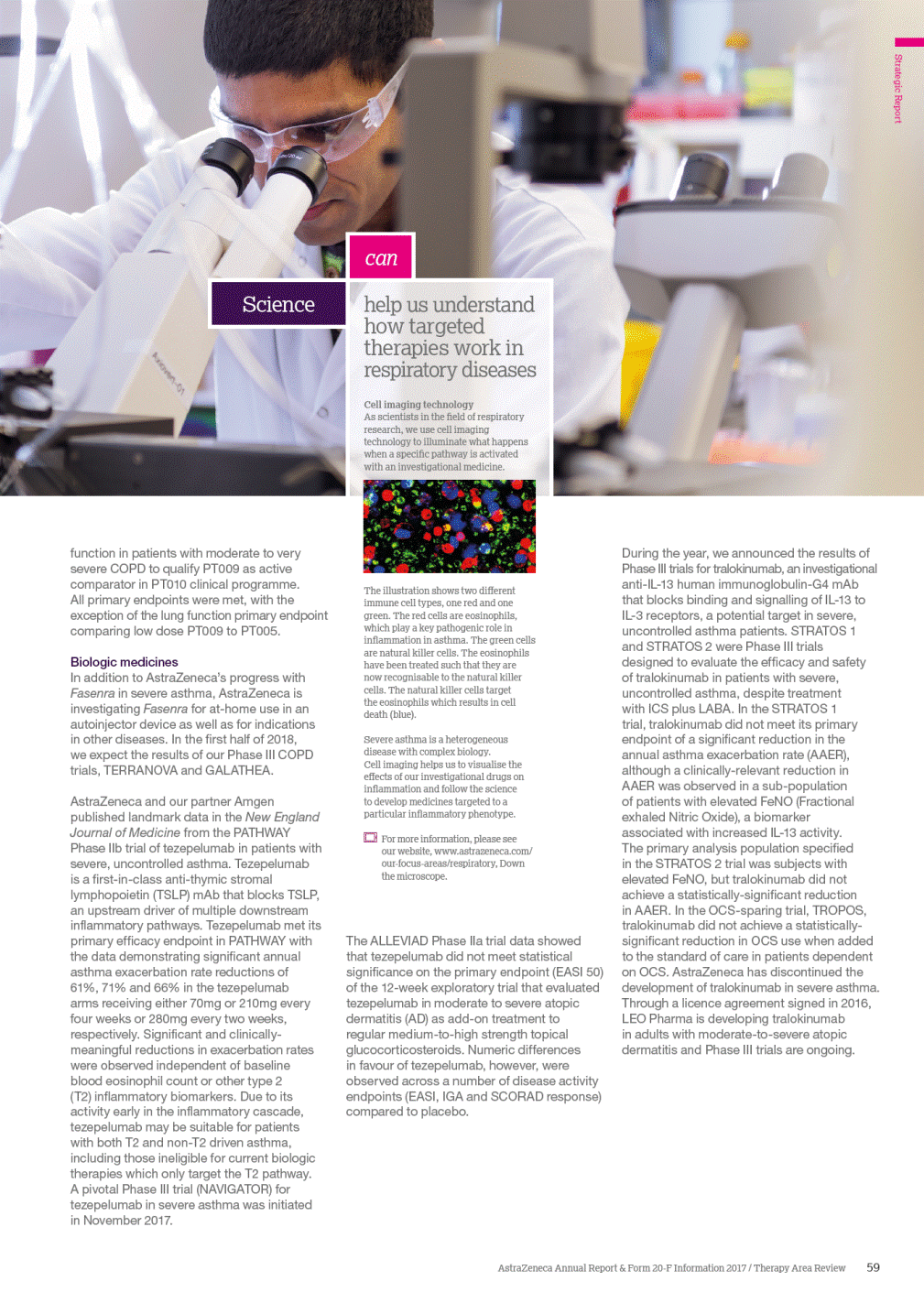 us understand how targeted therapies work in respiratory diseases Cell imaging technology As scientists in the field of respiratory research, we use cell imaging technology to illuminate what happens when a specific pathway is activated with an investigational medicine. function in patients with moderate to very severe COPD to qualify PT009 as active comparator in PT010 clinical programme. All primary endpoints were met, with the exception of the lung function primary endpoint comparing low dose PT009 to PT005. During the year, we announced the results of Phase III trials for tralokinumab, an investigational anti-IL-13 human immunoglobulin-G4 mAb that blocks binding and signalling of IL-13 to IL-3 receptors, a potential target in severe, uncontrolled asthma patients. STRATOS 1 and STRATOS 2 were Phase III trials designed to evaluate the efficacy and safety of tralokinumab in patients with severe, uncontrolled asthma, despite treatment with ICS plus LABA. In the STRATOS 1 trial, tralokinumab did not meet its primary endpoint of a significant reduction in the annual asthma exacerbation rate (AAER), although a clinically-relevant reduction in AAER was observed in a sub-population of patients with elevated FeNO (Fractional exhaled Nitric Oxide), a biomarker associated with increased IL-13 activity. The primary analysis population specified in the STRATOS 2 trial was subjects with elevated FeNO, but tralokinumab did not achieve a statistically-significant reduction in AAER. In the OCS-sparing trial, TROPOS, tralokinumab did not achieve a statistically-significant reduction in OCS use when added to the standard of care in patients dependent on OCS. AstraZeneca has discontinued the development of tralokinumab in severe asthma. Through a licence agreement signed in 2016, LEO Pharma is developing tralokinumab in adults with moderate-to-severe atopic dermatitis and Phase III trials are ongoing. The illustration shows two different immune cell types, one red and one green. The red cells are eosinophils, which play a key pathogenic role in inflammation in asthma. The green cells are natural killer cells. The eosinophils have been treated such that they are now recognisable to the natural killer cells. The natural killer cells target the eosinophils which results in cell death (blue). Biologic medicines In addition to AstraZeneca’s progress with Fasenra in severe asthma, AstraZeneca is investigating Fasenra for at-home use in an autoinjector device as well as for indications in other diseases. In the first half of 2018, we expect the results of our Phase III COPD trials, TERRANOVA and GALATHEA. Severe asthma is a heterogeneous disease with complex biology. Cell imaging helps us to visualise the effects of our investigational drugs on inflammation and follow the science to develop medicines targeted to a particular inflammatory phenotype. AstraZeneca and our partner Amgen published landmark data in the New England Journal of Medicine from the PATHWAY Phase IIb trial of tezepelumab in patients with severe, uncontrolled asthma. Tezepelumab is a first-in-class anti-thymic stromal lymphopoietin (TSLP) mAb that blocks TSLP, an upstream driver of multiple downstream inflammatory pathways. Tezepelumab met its primary efficacy endpoint in PATHWAY with the data demonstrating significant annual asthma exacerbation rate reductions of 61%, 71% and 66% in the tezepelumab arms receiving either 70mg or 210mg every four weeks or 280mg every two weeks, respectively. Significant and clinically-meaningful reductions in exacerbation rates were observed independent of baseline blood eosinophil count or other type 2 (T2) inflammatory biomarkers. Due to its activity early in the inflammatory cascade, tezepelumab may be suitable for patients with both T2 and non-T2 driven asthma, including those ineligible for current biologic therapies which only target the T2 pathway. A pivotal Phase III trial (NAVIGATOR) for tezepelumab in severe asthma was initiated in November 2017. For more information, please see our website, www.astrazeneca.com/ our-focus-areas/respiratory, Down the microscope. The ALLEVIAD Phase IIa trial data showed that tezepelumab did not meet statistical significance on the primary endpoint (EASI 50) of the 12-week exploratory trial that evaluated tezepelumab in moderate to severe atopic dermatitis (AD) as add-on treatment to regular medium-to-high strength topical glucocorticosteroids. Numeric differences in favour of tezepelumab, however, were observed across a number of disease activity endpoints (EASI, IGA and SCORAD response) compared to placebo. 59 AstraZeneca Annual Report & Form 20-F Information 2017 / Therapy Area Review Strategic Report can Science help