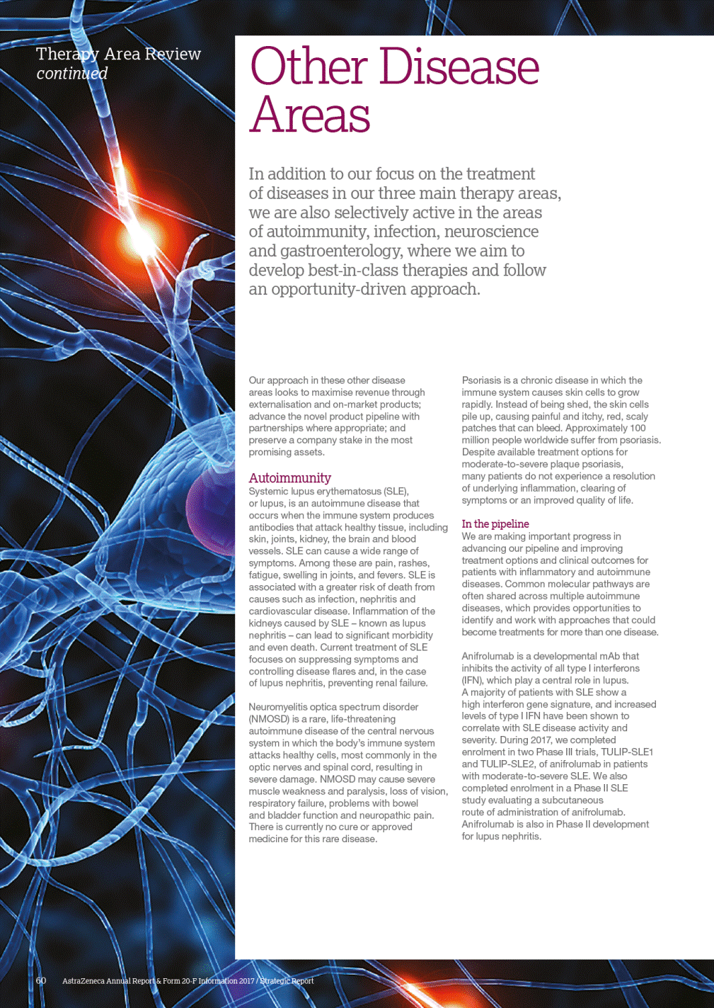 Other Disease Areas In addition to our focus on the treatment of diseases in our three main therapy areas, we are also selectively active in the areas of autoimmunity, infection, neuroscience and gastroenterology, where we aim to develop best-in-class therapies and follow an opportunity-driven approach. Therapy Area Review continued Our approach in these other disease areas looks to maximise revenue through externalisation and on-market products; advance the novel product pipeline with partnerships where appropriate; and preserve a company stake in the most promising assets. Psoriasis is a chronic disease in which the immune system causes skin cells to grow rapidly. Instead of being shed, the skin cells pile up, causing painful and itchy, red, scaly patches that can bleed. Approximately 100 million people worldwide suffer from psoriasis. Despite available treatment options for moderate-to-severe plaque psoriasis, many patients do not experience a resolution of underlying inflammation, clearing of symptoms or an improved quality of life. Autoimmunity Systemic lupus erythematosus (SLE), or lupus, is an autoimmune disease that occurs when the immune system produces antibodies that attack healthy tissue, including skin, joints, kidney, the brain and blood vessels. SLE can cause a wide range of symptoms. Among these are pain, rashes, fatigue, swelling in joints, and fevers. SLE is associated with a greater risk of death from causes such as infection, nephritis and cardiovascular disease. Inflammation of the kidneys caused by SLE – known as lupus nephritis – can lead to significant morbidity and even death. Current treatment of SLE focuses on suppressing symptoms and controlling disease flares and, in the case of lupus nephritis, preventing renal failure. In the pipeline We are making important progress in advancing our pipeline and improving treatment options and clinical outcomes for patients with inflammatory and autoimmune diseases. Common molecular pathways are often shared across multiple autoimmune diseases, which provides opportunities to identify and work with approaches that could become treatments for more than one disease. Anifrolumab is a developmental mAb that inhibits the activity of all type I interferons (IFN), which play a central role in lupus. A majority of patients with SLE show a high interferon gene signature, and increased levels of type I IFN have been shown to correlate with SLE disease activity and severity. During 2017, we completed enrolment in two Phase III trials, TULIP-SLE1 and TULIP-SLE2, of anifrolumab in patients with moderate-to-severe SLE. We also completed enrolment in a Phase II SLE study evaluating a subcutaneous route of administration of anifrolumab. Anifrolumab is also in Phase II development for lupus nephritis. Neuromyelitis optica spectrum disorder (NMOSD) is a rare, life-threatening autoimmune disease of the central nervous system in which the body’s immune system attacks healthy cells, most commonly in the optic nerves and spinal cord, resulting in severe damage. NMOSD may cause severe muscle weakness and paralysis, loss of vision, respiratory failure, problems with bowel and bladder function and neuropathic pain. There is currently no cure or approved medicine for this rare disease. 60 AstraZeneca Annual Report & Form 20-F Information 2017 / Strategic Report