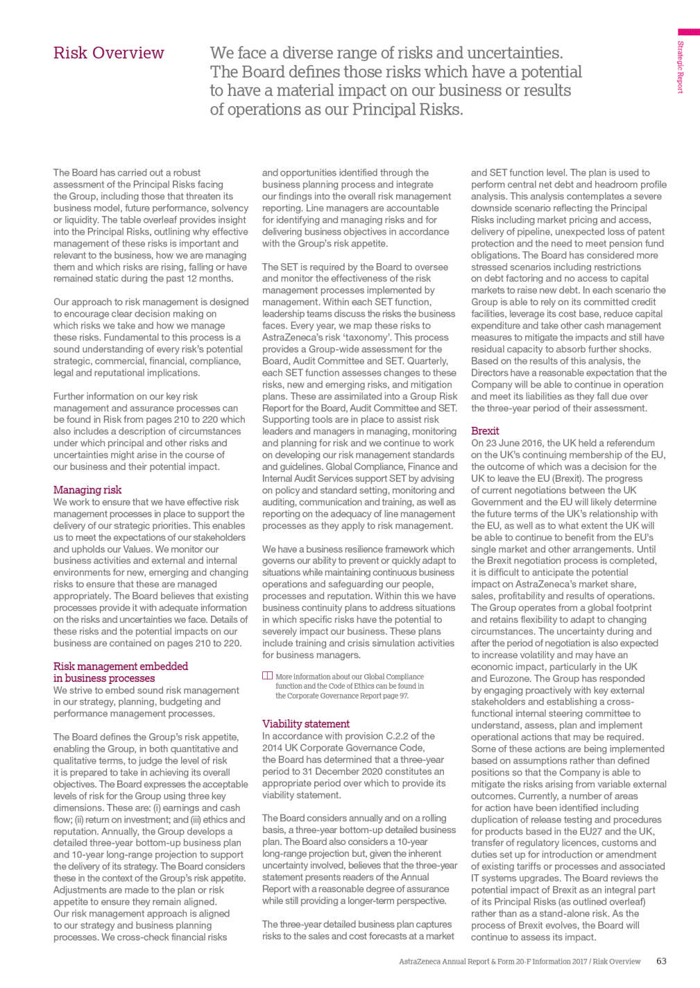 Risk Overview We face a diverse range of risks and uncertainties. The Board defines those risks which have a potential to have a material impact on our business or results of operations as our Principal Risks. The Board has carried out a robust assessment of the Principal Risks facing the Group, including those that threaten its business model, future performance, solvency or liquidity. The table overleaf provides insight into the Principal Risks, outlining why effective management of these risks is important and relevant to the business, how we are managing them and which risks are rising, falling or have remained static during the past 12 months. and opportunities identified through the business planning process and integrate our findings into the overall risk management reporting. Line managers are accountable for identifying and managing risks and for delivering business objectives in accordance with the Group’s risk appetite. and SET function level. The plan is used to perform central net debt and headroom profile analysis. This analysis contemplates a severe downside scenario reflecting the Principal Risks including market pricing and access, delivery of pipeline, unexpected loss of patent protection and the need to meet pension fund obligations. The Board has considered more stressed scenarios including restrictions on debt factoring and no access to capital markets to raise new debt. In each scenario the Group is able to rely on its committed credit facilities, leverage its cost base, reduce capital expenditure and take other cash management measures to mitigate the impacts and still have residual capacity to absorb further shocks. Based on the results of this analysis, the Directors have a reasonable expectation that the Company will be able to continue in operation and meet its liabilities as they fall due over the three-year period of their assessment. The SET is required by the Board to oversee and monitor the effectiveness of the risk management processes implemented by management. Within each SET function, leadership teams discuss the risks the business faces. Every year, we map these risks to AstraZeneca’s risk ‘taxonomy’. This process provides a Group-wide assessment for the Board, Audit Committee and SET. Quarterly, each SET function assesses changes to these risks, new and emerging risks, and mitigation plans. These are assimilated into a Group Risk Report for the Board, Audit Committee and SET. Supporting tools are in place to assist risk leaders and managers in managing, monitoring and planning for risk and we continue to work on developing our risk management standards and guidelines. Global Compliance, Finance and Internal Audit Services support SET by advising on policy and standard setting, monitoring and auditing, communication and training, as well as reporting on the adequacy of line management processes as they apply to risk management. Our approach to risk management is designed to encourage clear decision making on which risks we take and how we manage these risks. Fundamental to this process is a sound understanding of every risk’s potential strategic, commercial, financial, compliance, legal and reputational implications. Further information on our key risk management and assurance processes can be found in Risk from pages 210 to 220 which also includes a description of circumstances under which principal and other risks and uncertainties might arise in the course of our business and their potential impact. Brexit On 23 June 2016, the UK held a referendum on the UK’s continuing membership of the EU, the outcome of which was a decision for the UK to leave the EU (Brexit). The progress of current negotiations between the UK Government and the EU will likely determine the future terms of the UK’s relationship with the EU, as well as to what extent the UK will be able to continue to benefit from the EU’s single market and other arrangements. Until the Brexit negotiation process is completed, it is difficult to anticipate the potential impact on AstraZeneca’s market share, sales, profitability and results of operations. The Group operates from a global footprint and retains flexibility to adapt to changing circumstances. The uncertainty during and after the period of negotiation is also expected to increase volatility and may have an economic impact, particularly in the UK and Eurozone. The Group has responded by engaging proactively with key external stakeholders and establishing a cross-functional internal steering committee to understand, assess, plan and implement operational actions that may be required. Some of these actions are being implemented based on assumptions rather than defined positions so that the Company is able to mitigate the risks arising from variable external outcomes. Currently, a number of areas for action have been identified including duplication of release testing and procedures for products based in the EU27 and the UK, transfer of regulatory licences, customs and duties set up for introduction or amendment of existing tariffs or processes and associated IT systems upgrades. The Board reviews the potential impact of Brexit as an integral part of its Principal Risks (as outlined overleaf) rather than as a stand-alone risk. As the process of Brexit evolves, the Board will continue to assess its impact. Managing risk We work to ensure that we have effective risk management processes in place to support the delivery of our strategic priorities. This enables us to meet the expectations of our stakeholders and upholds our Values. We monitor our business activities and external and internal environments for new, emerging and changing risks to ensure that these are managed appropriately. The Board believes that existing processes provide it with adequate information on the risks and uncertainties we face. Details of these risks and the potential impacts on our business are contained on pages 210 to 220. We have a business 