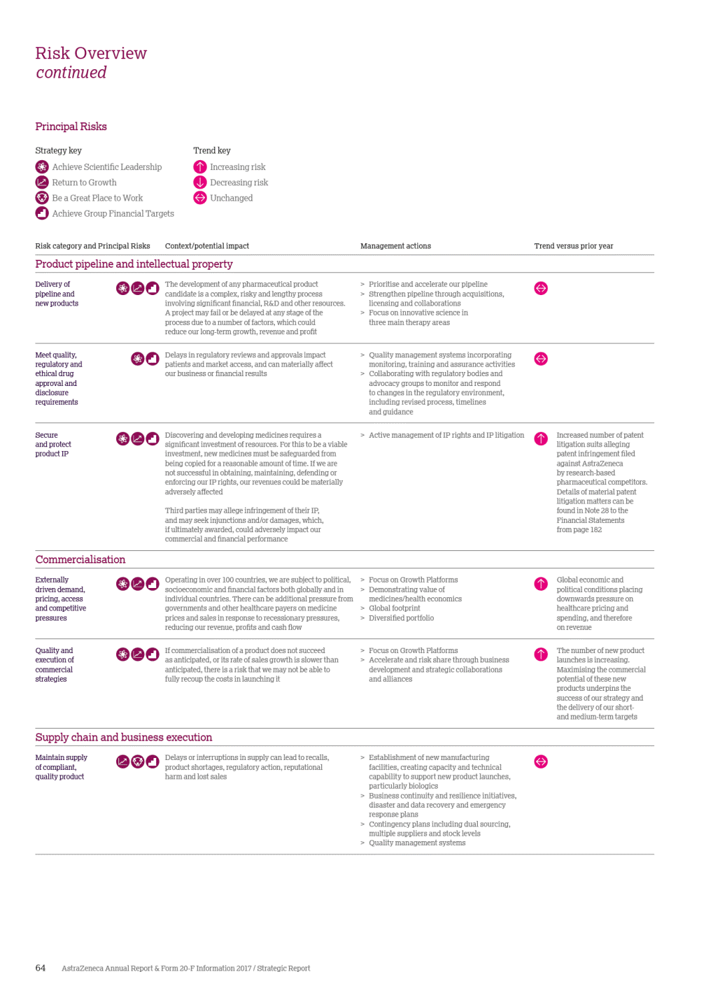 Risk Overview continued Principal Risks Strategy key Achieve Scientific Leadership Return to Growth Be a Great Place to Work Trend key Increasing risk Decreasing risk Unchanged Achieve Group Financial Targets Risk category and Principal Risks Context/potential impact Management actions Trend versus prior year Product pipeline and intellectual property Delivery of pipeline and new products The development of any pharmaceutical product candidate is a complex, risky and lengthy process involving significant financial, R&D and other resources. A project may fail or be delayed at any stage of the process due to a number of factors, which could reduce our long-term growth, revenue and profit > Prioritise and accelerate our pipeline > Strengthen pipeline through acquisitions, licensing and collaborations > Focus on innovative science in three main therapy areas Meet quality, regulatory and ethical drug approval and disclosure requirements Delays in regulatory reviews and approvals impact patients and market access, and can materially affect our business or financial results > Quality management systems incorporating monitoring, training and assurance activities > Collaborating with regulatory bodies and advocacy groups to monitor and respond to changes in the regulatory environment, including revised process, timelines and guidance Secure and protect product IP Discovering and developing medicines requires a significant investment of resources. For this to be a viable investment, new medicines must be safeguarded from being copied for a reasonable amount of time. If we are not successful in obtaining, maintaining, defending or enforcing our IP rights, our revenues could be materially adversely affected > Active management of IP rights and IP litigation Increased number of patent litigation suits alleging patent infringement filed against AstraZeneca by research-based pharmaceutical competitors. Details of material patent litigation matters can be found in Note 28 to the Financial Statements from page 182 Third parties may allege infringement of their IP, and may seek injunctions and/or damages, which, if ultimately awarded, could adversely impact our commercial and financial performance Commercialisation Externally driven demand, pricing, access and competitive pressures Operating in over 100 countries, we are subject to political, socioeconomic and financial factors both globally and in individual countries. There can be additional pressure from governments and other healthcare payers on medicine prices and sales in response to recessionary pressures, reducing our revenue, profits and cash flow > Focus on Growth Platforms > Demonstrating value of medicines/health economics > Global footprint > Diversified portfolio Global economic and political conditions placing downwards pressure on healthcare pricing and spending, and therefore on revenue Quality and execution of commercial strategies If commercialisation of a product does not succeed as anticipated, or its rate of sales growth is slower than anticipated, there is a risk that we may not be able to fully recoup the costs in launching it > Focus on Growth Platforms > Accelerate and risk share through business development and strategic collaborations and alliances The number of new product launches is increasing. Maximising the commercial potential of these new products underpins the success of our strategy and the delivery of our short-and medium-term targets Supply chain and business execution Maintain supply of compliant, quality product Delays or interruptions in supply can lead to recalls, product shortages, regulatory action, reputational harm and lost sales > Establishment of new manufacturing facilities, creating capacity and technical capability to support new product launches, particularly biologics > Business continuity and resilience initiatives, disaster and data recovery and emergency response plans > Contingency plans including dual sourcing, multiple suppliers and stock levels > Quality management systems 64 AstraZeneca Annual Report & Form 20-F Information 2017 / Strategic Report