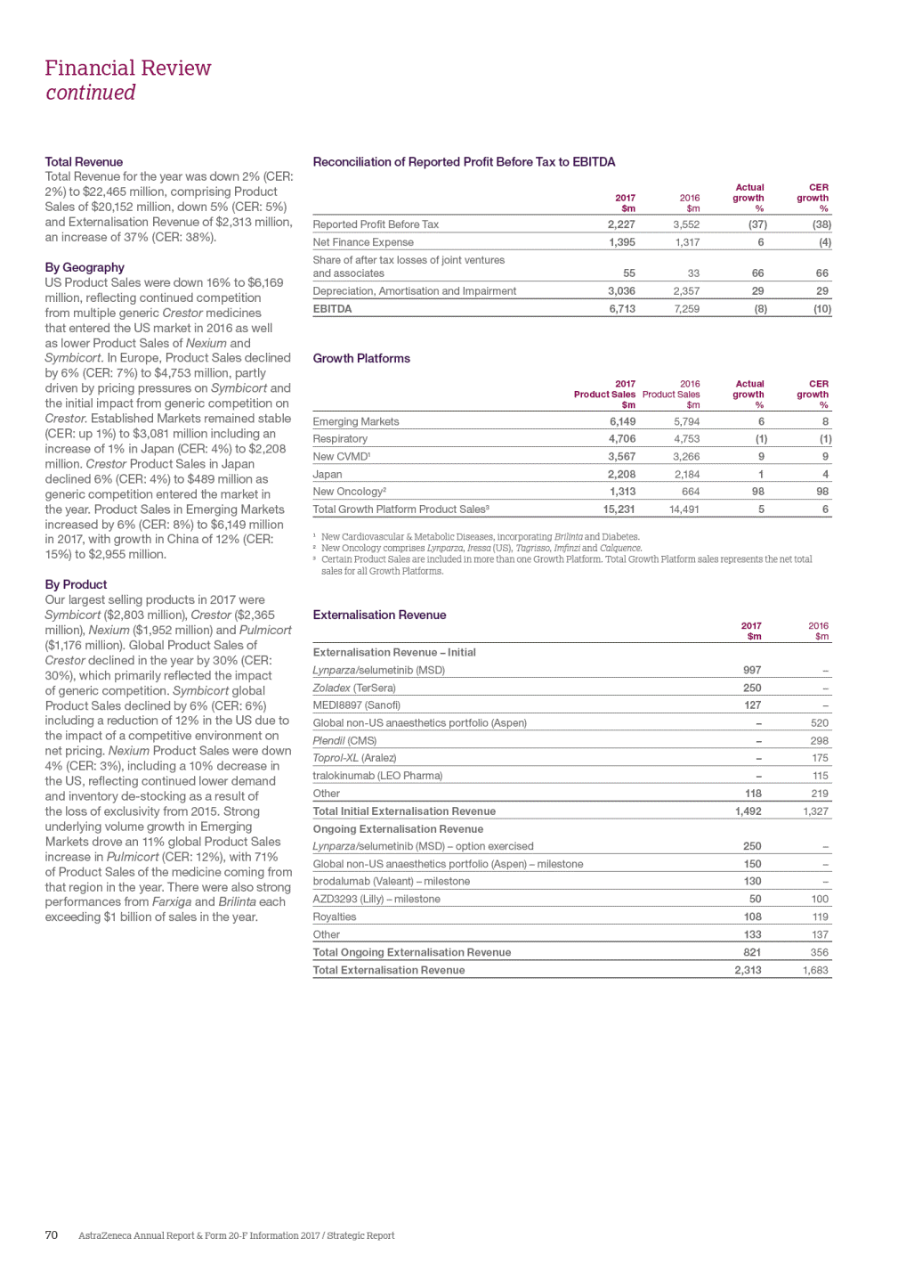 Financial Review continued Total Revenue Total Revenue for the year was down 2% (CER: 2%) to $22,465 million, comprising Product Sales of $20,152 million, down 5% (CER: 5%) and Externalisation Revenue of $2,313 million, an increase of 37% (CER: 38%). Reconciliation of Reported Profit Before Tax to EBITDA Actual growth % CER growth % 2017 $m 2016 $m Reported Profit Before Tax 2,227 3,552 (37) (38) Net Finance Expense 1,395 1,317 6 (4) Share of after tax losses of joint ventures and associates By Geography US Product Sales were down 16% to $6,169 million, reflecting continued competition from multiple generic Crestor medicines that entered the US market in 2016 as well as lower Product Sales of Nexium and Symbicort. In Europe, Product Sales declined by 6% (CER: 7%) to $4,753 million, partly driven by pricing pressures on Symbicort and the initial impact from generic competition on Crestor. Established Markets remained stable (CER: up 1%) to $3,081 million including an increase of 1% in Japan (CER: 4%) to $2,208 million. Crestor Product Sales in Japan declined 6% (CER: 4%) to $489 million as generic competition entered the market in the year. Product Sales in Emerging Markets increased by 6% (CER: 8%) to $6,149 million in 2017, with growth in China of 12% (CER: 15%) to $2,955 million. 55 33 66 66 Depreciation, Amortisation and Impairment 3,036 2,357 29 29 EBITDA 6,713 7,259 (8) (10) Growth Platforms 2017 2016 Actual growth % CER growth % Product Sales Product Sales $m $m Emerging Markets 6,149 5,794 6 8 Respiratory 4,706 4,753 (1) (1) New CVMD1 3,567 3,266 9 9 Japan 2,208 2,184 1 4 New Oncology2 1,313 664 98 98 Total Growth Platform Product Sales3 15,231 14,491 5 6 1 New Cardiovascular & Metabolic Diseases, incorporating Brilinta and Diabetes. 2 New Oncology comprises Lynparza, Iressa (US), Tagrisso, Imfinzi and Calquence. 3 Certain Product Sales are included in more than one Growth Platform. Total Growth Platform sales represents the net total sales for all Growth Platforms. By Product Our largest selling products in 2017 were Symbicort ($2,803 million), Crestor ($2,365 million), Nexium ($1,952 million) and Pulmicort ($1,176 million). Global Product Sales of Crestor declined in the year by 30% (CER: 30%), which primarily reflected the impact of generic competition. Symbicort global Product Sales declined by 6% (CER: 6%) including a reduction of 12% in the US due to the impact of a competitive environment on net pricing. Nexium Product Sales were down 4% (CER: 3%), including a 10% decrease in the US, reflecting continued lower demand and inventory de-stocking as a result of the loss of exclusivity from 2015. Strong underlying volume growth in Emerging Markets drove an 11% global Product Sales increase in Pulmicort (CER: 12%), with 71% of Product Sales of the medicine coming from that region in the year. There were also strong performances from Farxiga and Brilinta each exceeding $1 billion of sales in the year. Externalisation Revenue 2017 $m 2016 $m Externalisation Revenue – Initial Lynparza/selumetinib (MSD) 997 – Zoladex (TerSera) 250 – MEDI8897 (Sanofi) 127 – Global non-US anaesthetics portfolio (Aspen) – 520 Plendil (CMS) – 298 Toprol-XL (Aralez) – 175 tralokinumab (LEO Pharma) – 115 Other 118 219 Total Initial Externalisation Revenue 1,492 1,327 Ongoing Externalisation Revenue Lynparza/selumetinib (MSD) – option exercised 250 – Global non-US anaesthetics portfolio (Aspen) – milestone 150 – brodalumab (Valeant) – milestone 130 – AZD3293 (Lilly) – milestone 50 100 Royalties 108 119 Other 133 137 Total Ongoing Externalisation Revenue 821 356 Total Externalisation Revenue 2,313 1,683 70 AstraZeneca Annual Report & Form 20-F Information 2017 / Strategic Report