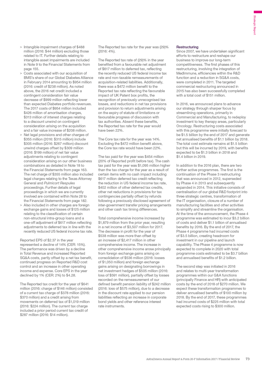 > Intangible impairment charges of $488 million (2016: $44 million) excluding those related to IT. Further details relating to intangible asset impairments are included in Note 9 to the Financial Statements from page 155. > Costs associated with our acquisition of BMS’s share of our Global Diabetes Alliance in February 2014 amounting to $954 million (2016: credit of $238 million). As noted above, the 2016 net credit included a contingent consideration fair value decrease of $999 million reflecting lower than expected Diabetes portfolio revenues. The 2017 costs of $954 million included $426 million of amortisation charges, $313 million of interest charges relating to a discount unwind on contingent consideration arising on the acquisition and a fair value increase of $208 million. > Net legal provisions and other charges of $355 million (2016: $315 million) include $305 million (2016: $267 million) discount unwind charges offset by $309 million (2016: $199 million) of net fair value adjustments relating to contingent consideration arising on our other business combinations as detailed in Note 18 to the Financial Statements from page 163. The net charge of $355 million also included legal charges relating to the Texas Attorney General and Pulmicort Respules proceedings. Further details of legal proceedings in which we are currently involved are contained within Note 28 to the Financial Statements from page 182. > Also included in other charges are foreign exchange gains and losses of $125 million relating to the classification of certain non-structural intra-group loans and a one-off adjustment of $617 million reflecting adjustments to deferred tax in line with the recently reduced US federal income tax rate. The Reported tax rate for the year was (29)% (2016: 4%). Restructuring Since 2007, we have undertaken significant efforts to restructure and reshape our business to improve our long-term competitiveness. The first phases of this restructuring, involving the integration of MedImmune, efficiencies within the R&D function and a reduction in SG&A costs, were completed in 2011. The targeted commercial restructuring announced in 2015 has also been successfully completed with a total cost of $151 million. The Reported tax rate of (29)% in the year benefited from a favourable net adjustment of $617 million to deferred tax, reflecting the recently reduced US federal income tax rate and non-taxable remeasurements of acquisition-related liabilities. Additionally, there was a $472 million benefit to the Reported tax rate reflecting the favourable impact of UK Patent box profits, the recognition of previously unrecognised tax losses, and reductions in net tax provisions and provision to return adjustments arising on the expiry of statute of limitations or favourable progress of discussion with tax authorities. Absent these benefits, the Reported tax rate for the year would have been 22%. In 2016, we announced plans to advance our strategy through sharper focus by streamlining operations, primarily in Commercial and Manufacturing, to redeploy investment to key therapy areas, particularly Oncology. Restructuring costs associated with this programme were initially forecast to be $1.5 billion by the end of 2017 and generate net annualised benefits of $1.1 billion by 2018. The total cost estimate remains at $1.5 billion but this will be incurred by 2019, with benefits expected to be $1.3 billion in 2018 and $1.4 billion in 2019. The Core tax rate for the year was 14%. Excluding the $472 million benefit above, the Core tax rate would have been 22%. The tax paid for the year was $454 million (20% of Reported profit before tax). The cash tax paid for the year was $1,095 million higher than the tax charge for the year as a result of certain items with no cash impact including $617 million deferred tax credit reflecting the reduction in US federal income tax rate, $402 million of other deferred tax credits, other net reductions in provisions for tax contingencies partially offset by refunds following a previously disclosed agreement of inter-government transfer pricing arrangements and other cash tax timing differences. In addition to the 2016 plan, there are two further active programmes. The first is the continuation of the Phase 3 restructuring that was announced in 2012, superseded by Phase 4 in 2013 and subsequently expanded in 2014. This initiative consists of centralisation of our global R&D footprint into three strategic centres, transformation of the IT organisation, closure of a number of manufacturing facilities and other activities to simplify and streamline the organisation. At the time of the announcement, the Phase 4 programme was estimated to incur $3.2 billion of costs and deliver $1.1 billion of annualised benefits by 2016. By the end of 2017, the Phase 4 programme had incurred costs of $3.5 billion, creating headroom for investment in our pipeline and launch capability. The Phase 4 programme is now expected to complete in 2020 with total programme costs estimated to be $3.7 billion and annualised benefits of $1.2 billion. Total comprehensive income increased by $1,879 million from the prior year, resulting in a net income of $3,507 million for 2017. The decrease in profit for the year of $538 million was more than offset by an increase of $2,417 million in other comprehensive income. The increase in other comprehensive income arose principally from foreign exchange gains arising on consolidation of $536 million (2016: losses of $1,050 million) and foreign exchange gains arising on designating borrowings in net investment hedges of $505 million (2016: loss of $591 million), partially offset by losses recorded on the remeasurement of our defined benefit pension liability of $242 million (2016: loss of $575 million), due to a decrease in the discount rate applied to our pension liabilities reflecting an increase in corporate bond yields and other reference interest rate instruments. Report