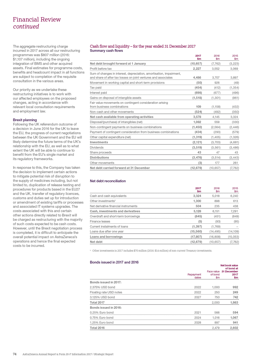Financial Review continued Cash flow and liquidity – for the year ended 31 December 2017 Summary cash flows 2017 $m The aggregate restructuring charge incurred in 2017 across all our restructuring programmes was $807 million (2016: $1,107 million), including the ongoing integration of BMS and other acquired assets. Final estimates for programme costs, benefits and headcount impact in all functions are subject to completion of the requisite consultation in the various areas. 2016 $m 2015 $m Net debt brought forward at 1 January (10,657) (7,762) (3,223) Profit before tax 2,227 3,552 3,069 Sum of changes in interest, depreciation, amortisation, impairment, and share of after tax losses on joint ventures and associates 4,486 3,707 3,897 Movement in working capital and short-term provisions (50) 926 (49) Tax paid (454) (412) (1,354) Our priority as we undertake these restructuring initiatives is to work with our affected employees on the proposed changes, acting in accordance with relevant local consultation requirements and employment law. Interest paid (698) (677) (496) Gains on disposal of intangible assets (1,518) (1,301) (961) Fair value movements on contingent consideration arising from business combinations 109 (1,158) (432) Non-cash and other movements (524) (492) (350) Net cash available from operating activities 3,578 4,145 3,324 Brexit planning Following the UK referendum outcome of a decision in June 2016 for the UK to leave the EU, the progress of current negotiations between the UK Government and the EU will likely determine the future terms of the UK’s relationship with the EU, as well as to what extent the UK will be able to continue to benefit from the EU’s single market and its regulatory frameworks. Disposal/(purchase) of intangibles (net) 1,082 559 (330) Non-contingent payments on business combinations (1,450) (2,564) (2,446) Payment of contingent consideration from business combinations (434) (293) (579) Other capital expenditure (net) (1,319) (1,405) (1,326) Investments (2,121) (3,703) (4,681) Dividends (3,519) (3,561) (3,486) Share proceeds 43 47 43 Distributions (3,476) (3,514) (3,443) Other movements (3) 177 261 In response to this, the Company has taken the decision to implement certain actions to mitigate potential risk of disruption to the supply of medicines including, but not limited to, duplication of release testing and procedures for products based in the EU27 and the UK, transfer of regulatory licences, customs and duties set up for introduction or amendment of existing tariffs or processes and associated IT systems upgrades. The costs associated with this and certain other actions directly related to Brexit will be charged as restructuring with the majority of such costs expected to be cash costs. However, until the Brexit negotiation process is completed, it is difficult to anticipate the overall potential impact on AstraZeneca’s operations and hence the final expected costs to be incurred. Net debt carried forward at 31 December (12,679) (10,657) (7,762) Net debt reconciliation 2017 $m 2016 $m 2015 $m Cash and cash equivalents 3,324 5,018 6,240 Other investments1 1,300 898 613 Net derivative financial instruments 504 235 438 Cash, investments and derivatives 5,128 6,151 7,291 Overdraft and short-term borrowings (845) (451) (849) Finance leases (5) (93) (95) Current instalments of loans (1,397) (1,769) – Loans due after one year (15,560) (14,495) (14,109) Loans and borrowings (17,807) (16,808) (15,053) Net debt (12,679) (10,657) (7,762) 1 Other investments in 2017 includes $70 million (2016: $14 million) of non-current Treasury investments. Bonds issued in 2017 and 2016 Net book value of bond at Face value 31 December Repayment dates of bond $m 2017 $m Bonds issued in 2017: 2.375% USD bond 2022 1,000 992 Floating rate USD notes 2022 250 249 3.125% USD bond 2027 750 742 Total 2017 2,000 1,983 Bonds issued in 2016: 0.25% Euro bond 2021 566 594 0.75% Euro bond 2024 1,016 1,067 1.25% Euro bond 2028 897 941 Total 2016 2,479 2,602 74 AstraZeneca Annual Report & Form 20-F Information 2017 / Strategic Report