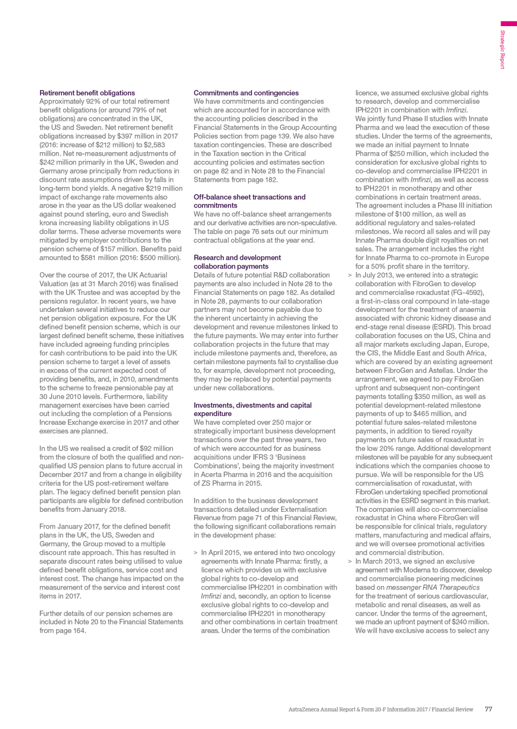 Retirement benefit obligations Approximately 92% of our total retirement benefit obligations (or around 79% of net obligations) are concentrated in the UK, the US and Sweden. Net retirement benefit obligations increased by $397 million in 2017 (2016: increase of $212 million) to $2,583 million. Net re-measurement adjustments of $242 million primarily in the UK, Sweden and Germany arose principally from reductions in discount rate assumptions driven by falls in long-term bond yields. A negative $219 million impact of exchange rate movements also arose in the year as the US dollar weakened against pound sterling, euro and Swedish krona increasing liability obligations in US dollar terms. These adverse movements were mitigated by employer contributions to the pension scheme of $157 million. Benefits paid amounted to $581 million (2016: $500 million). Commitments and contingencies We have commitments and contingencies which are accounted for in accordance with the accounting policies described in the Financial Statements in the Group Accounting Policies section from page 139. We also have taxation contingencies. These are described in the Taxation section in the Critical accounting policies and estimates section on page 82 and in Note 28 to the Financial Statements from page 182. licence, we assumed exclusive global rights to research, develop and commercialise IPH2201 in combination with Imfinzi. We jointly fund Phase II studies with Innate Pharma and we lead the execution of these studies. Under the terms of the agreements, we made an initial payment to Innate Pharma of $250 million, which included the consideration for exclusive global rights to co-develop and commercialise IPH2201 in combination with Imfinzi, as well as access to IPH2201 in monotherapy and other combinations in certain treatment areas. The agreement includes a Phase III initiation milestone of $100 million, as well as additional regulatory and sales-related milestones. We record all sales and will pay Innate Pharma double digit royalties on net sales. The arrangement includes the right for Innate Pharma to co-promote in Europe for a 50% profit share in the territory. > In July 2013, we entered into a strategic collaboration with FibroGen to develop and commercialise roxadustat (FG-4592), a first-in-class oral compound in late-stage development for the treatment of anaemia associated with chronic kidney disease and end-stage renal disease (ESRD). This broad collaboration focuses on the US, China and all major markets excluding Japan, Europe, the CIS, the Middle East and South Africa, which are covered by an existing agreement between FibroGen and Astellas. Under the arrangement, we agreed to pay FibroGen upfront and subsequent non-contingent payments totalling $350 million, as well as potential development-related milestone payments of up to $465 million, and potential future sales-related milestone payments, in addition to tiered royalty payments on future sales of roxadustat in the low 20% range. Additional development milestones will be payable for any subsequent indications which the companies choose to pursue. We will be responsible for the US commercialisation of roxadustat, with FibroGen undertaking specified promotional activities in the ESRD segment in this market. The companies will also co-commercialise roxadustat in China where FibroGen will be responsible for clinical trials, regulatory matters, manufacturing and medical affairs, and we will oversee promotional activities and commercial distribution. > In March 2013, we signed an exclusive agreement with Moderna to discover, develop and commercialise pioneering medicines based on messenger RNA Therapeutics for the treatment of serious cardiovascular, metabolic and renal diseases, as well as cancer. Under the terms of the agreement, we made an upfront payment of $240 million. We will have exclusive access to select any Off-balance sheet transactions and commitments We have no off-balance sheet arrangements and our derivative activities are non-speculative. The table on page 76 sets out our minimum contractual obligations at the year end. Research and development collaboration payments Details of future potential R&D collaboration payments are also included in Note 28 to the Financial Statements on page 182. As detailed in Note 28, payments to our collaboration partners may not become payable due to the inherent uncertainty in achieving the development and revenue milestones linked to the future payments. We may enter into further collaboration projects in the future that may include milestone payments and, therefore, as certain milestone payments fail to crystallise due to, for example, development not proceeding, they may be replaced by potential payments under new collaborations. Over the course of 2017, the UK Actuarial Valuation (as at 31 March 2016) was finalised with the UK Trustee and was accepted by the pensions regulator. In recent years, we have undertaken several initiatives to reduce our net pension obligation exposure. For the UK defined benefit pension scheme, which is our largest defined benefit scheme, these initiatives have included agreeing funding principles for cash contributions to be paid into the UK pension scheme to target a level of assets in excess of the current expected cost of providing benefits, and, in 2010, amendments to the scheme to freeze pensionable pay at 30 June 2010 levels. Furthermore, liability management exercises have been carried out including the completion of a Pensions Increase Exchange exercise in 2017 and other exercises are planned. Investments, divestments and capital expenditure We have completed over 250 major or strategically important business development transactions over the past three years, two of which were accounted for as business acquisitions under IFRS 3 ‘Business Combinations’, being the majority investment in Acerta Pharma in 2016 and the acquisition of ZS Pharma in 2015. In the US we realis