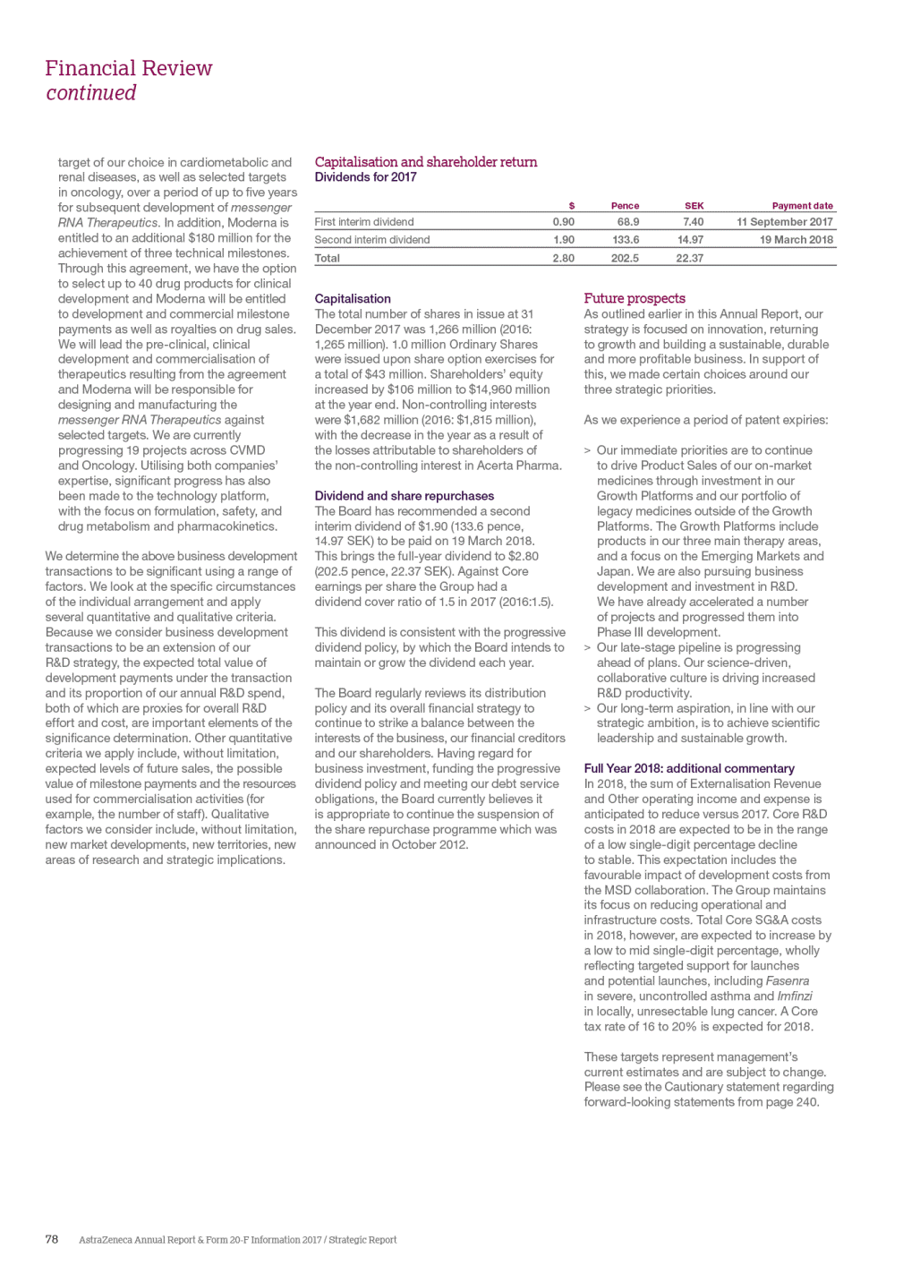Financial Review continued Capitalisation and shareholder return Dividends for 2017 target of our choice in cardiometabolic and renal diseases, as well as selected targets in oncology, over a period of up to five years for subsequent development of messenger RNA Therapeutics. In addition, Moderna is entitled to an additional $180 million for the achievement of three technical milestones. Through this agreement, we have the option to select up to 40 drug products for clinical development and Moderna will be entitled to development and commercial milestone payments as well as royalties on drug sales. We will lead the pre-clinical, clinical development and commercialisation of therapeutics resulting from the agreement and Moderna will be responsible for designing and manufacturing the messenger RNA Therapeutics against selected targets. We are currently progressing 19 projects across CVMD and Oncology. Utilising both companies’ expertise, significant progress has also been made to the technology platform, with the focus on formulation, safety, and drug metabolism and pharmacokinetics. $ Pence SEK Payment date First interim dividend 0.90 68.9 7.40 11 September 2017 Second interim dividend 1.90 133.6 14.97 19 March 2018 Total 2.80 202.5 22.37 Future prospects As outlined earlier in this Annual Report, our strategy is focused on innovation, returning to growth and building a sustainable, durable and more profitable business. In support of this, we made certain choices around our three strategic priorities. Capitalisation The total number of shares in issue at 31 December 2017 was 1,266 million (2016: 1,265 million). 1.0 million Ordinary Shares were issued upon share option exercises for a total of $43 million. Shareholders’ equity increased by $106 million to $14,960 million at the year end. Non-controlling interests were $1,682 million (2016: $1,815 million), with the decrease in the year as a result of the losses attributable to shareholders of the non-controlling interest in Acerta Pharma. As we experience a period of patent expiries: > Our immediate priorities are to continue to drive Product Sales of our on-market medicines through investment in our Growth Platforms and our portfolio of legacy medicines outside of the Growth Platforms. The Growth Platforms include products in our three main therapy areas, and a focus on the Emerging Markets and Japan. We are also pursuing business development and investment in R&D. We have already accelerated a number of projects and progressed them into Phase III development. > Our late-stage pipeline is progressing ahead of plans. Our science-driven, collaborative culture is driving increased R&D productivity. > Our long-term aspiration, in line with our strategic ambition, is to achieve scientific leadership and sustainable growth. Dividend and share repurchases The Board has recommended a second interim dividend of $1.90 (133.6 pence, 14.97 SEK) to be paid on 19 March 2018. This brings the full-year dividend to $2.80 (202.5 pence, 22.37 SEK). Against Core earnings per share the Group had a dividend cover ratio of 1.5 in 2017 (2016:1.5). We determine the above business development transactions to be significant using a range of factors. We look at the specific circumstances of the individual arrangement and apply several quantitative and qualitative criteria. Because we consider business development transactions to be an extension of our R&D strategy, the expected total value of development payments under the transaction and its proportion of our annual R&D spend, both of which are proxies for overall R&D effort and cost, are important elements of the significance determination. Other quantitative criteria we apply include, without limitation, expected levels of future sales, the possible value of milestone payments and the resources used for commercialisation activities (for example, the number of staff). Qualitative factors we consider include, without limitation, new market developments, new territories, new areas of research and strategic implications. This dividend is consistent with the progressive dividend policy, by which the Board intends to maintain or grow the dividend each year. The Board regularly reviews its distribution policy and its overall financial strategy to continue to strike a balance between the interests of the business, our financial creditors and our shareholders. Having regard for business investment, funding the progressive dividend policy and meeting our debt service obligations, the Board currently believes it is appropriate to continue the suspension of the share repurchase programme which was announced in October 2012. Full Year 2018: additional commentary In 2018, the sum of Externalisation Revenue and Other operating income and expense is anticipated to reduce versus 2017. Core R&D costs in 2018 are expected to be in the range of a low single-digit percentage decline to stable. This expectation includes the favourable impact of development costs from the MSD collaboration. The Group maintains its focus on reducing operational and infrastructure costs. Total Core SG&A costs in 2018, however, are expected to increase by a low to mid single-digit percentage, wholly reflecting targeted support for launches and potential launches, including Fasenra in severe, uncontrolled asthma and Imfinzi in locally, unresectable lung cancer. A Core tax rate of 16 to 20% is expected for 2018. These targets represent management’s current estimates and are subject to change. Please see the Cautionary statement regarding forward-looking statements from page 240. 78 AstraZeneca Annual Report & Form 20-F Information 2017 / Strategic Report