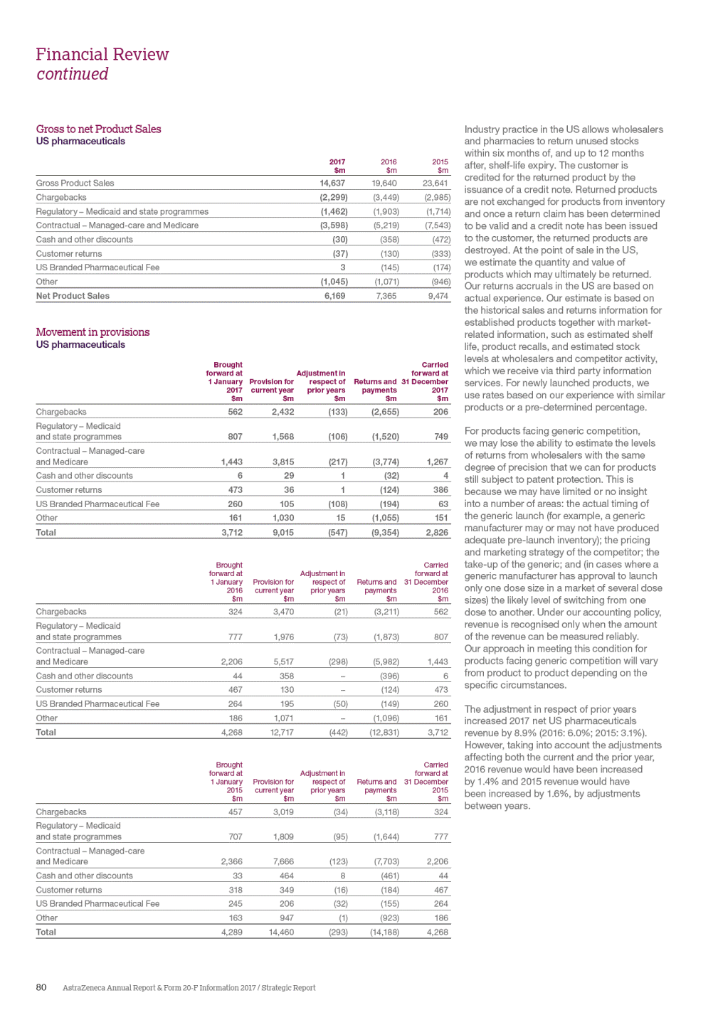 Financial Review continued Gross to net Product Sales US pharmaceuticals Industry practice in the US allows wholesalers and pharmacies to return unused stocks within six months of, and up to 12 months after, shelf-life expiry. The customer is credited for the returned product by the issuance of a credit note. Returned products are not exchanged for products from inventory and once a return claim has been determined to be valid and a credit note has been issued to the customer, the returned products are destroyed. At the point of sale in the US, we estimate the quantity and value of products which may ultimately be returned. Our returns accruals in the US are based on actual experience. Our estimate is based on the historical sales and returns information for established products together with market-related information, such as estimated shelf life, product recalls, and estimated stock levels at wholesalers and competitor activity, which we receive via third party information services. For newly launched products, we use rates based on our experience with similar products or a pre-determined percentage. 2017 $m 2016 $m 2015 $m Gross Product Sales 14,637 19,640 23,641 Chargebacks (2,299) (3,449) (2,985) Regulatory – Medicaid and state programmes (1,462) (1,903) (1,714) Contractual – Managed-care and Medicare (3,598) (5,219) (7,543) Cash and other discounts (30) (358) (472) Customer returns (37) (130) (333) US Branded Pharmaceutical Fee 3 (145) (174) Other (1,045) (1,071) (946) Net Product Sales 6,169 7,365 9,474 Movement in provisions US pharmaceuticals Brought forward at 1 January 2017 $m Carried forward at Returns and 31 December Adjustment in respect of prior years $m Provision for current year $m payments $m 2017 $m Chargebacks 562 2,432 (133) (2,655) 206 Regulatory – Medicaid and state programmes For products facing generic competition, we may lose the ability to estimate the levels of returns from wholesalers with the same degree of precision that we can for products still subject to patent protection. This is because we may have limited or no insight into a number of areas: the actual timing of the generic launch (for example, a generic manufacturer may or may not have produced adequate pre-launch inventory); the pricing and marketing strategy of the competitor; the take-up of the generic; and (in cases where a generic manufacturer has approval to launch only one dose size in a market of several dose sizes) the likely level of switching from one dose to another. Under our accounting policy, revenue is recognised only when the amount of the revenue can be measured reliably. Our approach in meeting this condition for products facing generic competition will vary from product to product depending on the specific circumstances. 807 1,568 (106) (1,520) 749 Contractual – Managed-care and Medicare 1,443 3,815 (217) (3,774) 1,267 Cash and other discounts 6 29 1 (32) 4 Customer returns 473 36 1 (124) 386 US Branded Pharmaceutical Fee 260 105 (108) (194) 63 Other 161 1,030 15 (1,055) 151 Total 3,712 9,015 (547) (9,354) 2,826 Brought forward at 1 January 2016 $m Carried forward at 31 December 2016 $m Adjustment in respect of prior years $m Provision for current year $m Returns and payments $m C hargebacks 324 3,470 (21) (3,211) 562 Regulatory – Medicaid and state programmes 777 1,976 (73) (1,873) 807 Contractual – Managed-care and Medicare 2,206 5,517 (298) (5,982) 1,443 Cash and other discounts 44 358 – (396) 6 Customer returns 467 130 – (124) 473 US Branded Pharmaceutical Fee 264 195 (50) (149) 260 The adjustment in respect of prior years increased 2017 net US pharmaceuticals revenue by 8.9% (2016: 6.0%; 2015: 3.1%). However, taking into account the adjustments affecting both the current and the prior year, 2016 revenue would have been increased by 1.4% and 2015 revenue would have been increased by 1.6%, by adjustments between years. Other 186 1,071 – (1,096) 161 Total 4,268 12,717 (442) (12,831) 3,712 Brought forward at 1 January 2015 $m Carried forward at 31 December 2015 $m Adjustment in respect of prior years $m Provision for current year $m Returns and payments $m Chargebacks 457 3,019 (34) (3,118) 324 Regulatory – Medicaid and state programmes 707 1,809 (95) (1,644) 777 Contractual – Managed-care and Medicare 2,366 7,666 (123) (7,703) 2,206 Cash and other discounts 33 464 8 (461) 44 Customer returns 318 349 (16) (184) 467 US Branded Pharmaceutical Fee 245 206 (32) (155) 264 Other 163 947 (1) (923) 186 Total 4,289 14,460 (293) (14,188) 4,268 80 AstraZeneca Annual Report & Form 20-F Information 2017 / Strategic Report