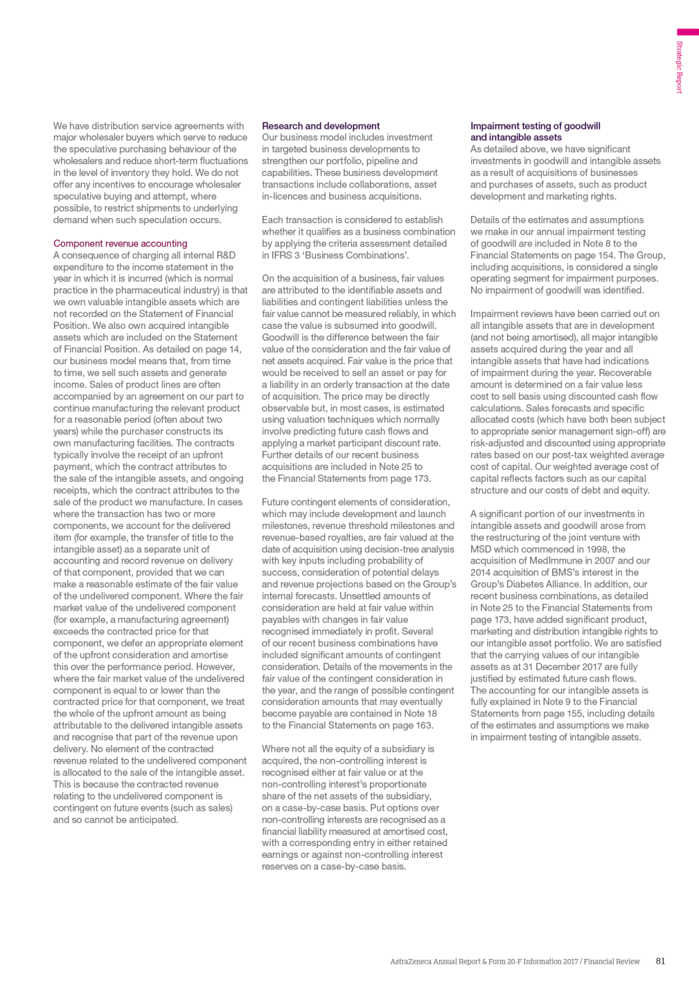 We have distribution service agreements with major wholesaler buyers which serve to reduce the speculative purchasing behaviour of the wholesalers and reduce short-term fluctuations in the level of inventory they hold. We do not offer any incentives to encourage wholesaler speculative buying and attempt, where possible, to restrict shipments to underlying demand when such speculation occurs. Research and development Our business model includes investment in targeted business developments to strengthen our portfolio, pipeline and capabilities. These business development transactions include collaborations, asset in-licences and business acquisitions. Impairment testing of goodwill and intangible assets As detailed above, we have significant investments in goodwill and intangible assets as a result of acquisitions of businesses and purchases of assets, such as product development and marketing rights. Each transaction is considered to establish whether it qualifies as a business combination by applying the criteria assessment detailed in IFRS 3 ‘Business Combinations’. Details of the estimates and assumptions we make in our annual impairment testing of goodwill are included in Note 8 to the Financial Statements on page 154. The Group, including acquisitions, is considered a single operating segment for impairment purposes. No impairment of goodwill was identified. Component revenue accounting A consequence of charging all internal R&D expenditure to the income statement in the year in which it is incurred (which is normal practice in the pharmaceutical industry) is that we own valuable intangible assets which are not recorded on the Statement of Financial Position. We also own acquired intangible assets which are included on the Statement of Financial Position. As detailed on page 14, our business model means that, from time to time, we sell such assets and generate income. Sales of product lines are often accompanied by an agreement on our part to continue manufacturing the relevant product for a reasonable period (often about two years) while the purchaser constructs its own manufacturing facilities. The contracts typically involve the receipt of an upfront payment, which the contract attributes to the sale of the intangible assets, and ongoing receipts, which the contract attributes to the sale of the product we manufacture. In cases where the transaction has two or more components, we account for the delivered item (for example, the transfer of title to the intangible asset) as a separate unit of accounting and record revenue on delivery of that component, provided that we can make a reasonable estimate of the fair value of the undelivered component. Where the fair market value of the undelivered component (for example, a manufacturing agreement) exceeds the contracted price for that component, we defer an appropriate element of the upfront consideration and amortise this over the performance period. However, where the fair market value of the undelivered component is equal to or lower than the contracted price for that component, we treat the whole of the upfront amount as being attributable to the delivered intangible assets and recognise that part of the revenue upon delivery. No element of the contracted revenue related to the undelivered component is allocated to the sale of the intangible asset. This is because the contracted revenue relating to the undelivered component is contingent on future events (such as sales) and so cannot be anticipated. On the acquisition of a business, fair values are attributed to the identifiable assets and liabilities and contingent liabilities unless the fair value cannot be measured reliably, in which case the value is subsumed into goodwill. Goodwill is the difference between the fair value of the consideration and the fair value of net assets acquired. Fair value is the price that would be received to sell an asset or pay for a liability in an orderly transaction at the date of acquisition. The price may be directly observable but, in most cases, is estimated using valuation techniques which normally involve predicting future cash flows and applying a market participant discount rate. Further details of our recent business acquisitions are included in Note 25 to the Financial Statements from page 173. Impairment reviews have been carried out on all intangible assets that are in development (and not being amortised), all major intangible assets acquired during the year and all intangible assets that have had indications of impairment during the year. Recoverable amount is determined on a fair value less cost to sell basis using discounted cash flow calculations. Sales forecasts and specific allocated costs (which have both been subject to appropriate senior management sign-off) are risk-adjusted and discounted using appropriate rates based on our post-tax weighted average cost of capital. Our weighted average cost of capital reflects factors such as our capital structure and our costs of debt and equity. Future contingent elements of consideration, which may include development and launch milestones, revenue threshold milestones and revenue-based royalties, are fair valued at the date of acquisition using decision-tree analysis with key inputs including probability of success, consideration of potential delays and revenue projections based on the Group’s internal forecasts. Unsettled amounts of consideration are held at fair value within payables with changes in fair value recognised immediately in profit. Several of our recent business combinations have included significant amounts of contingent consideration. Details of the movements in the fair value of the contingent consideration in the year, and the range of possible contingent consideration amounts that may eventually become payable are contained in Note 18 to the Financial Statements on page 163. A significant portion of our investments in intangible assets and goodwill arose from t