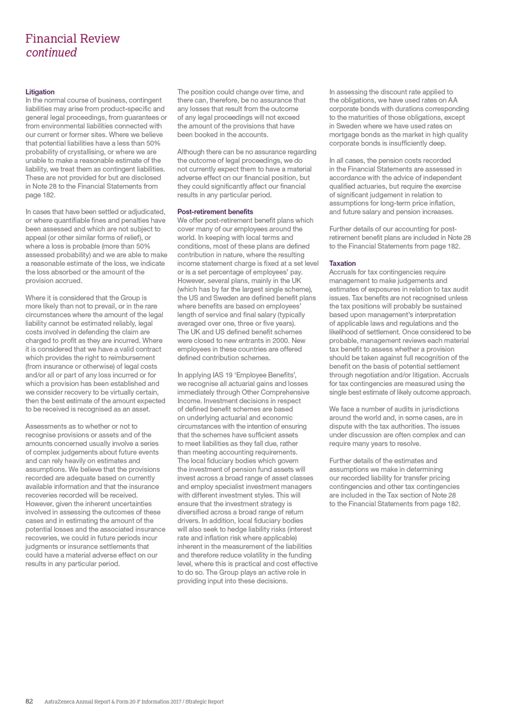 Financial Review continued Litigation In the normal course of business, contingent liabilities may arise from product-specific and general legal proceedings, from guarantees or from environmental liabilities connected with our current or former sites. Where we believe that potential liabilities have a less than 50% probability of crystallising, or where we are unable to make a reasonable estimate of the liability, we treat them as contingent liabilities. These are not provided for but are disclosed in Note 28 to the Financial Statements from page 182. The position could change over time, and there can, therefore, be no assurance that any losses that result from the outcome of any legal proceedings will not exceed the amount of the provisions that have been booked in the accounts. In assessing the discount rate applied to the obligations, we have used rates on AA corporate bonds with durations corresponding to the maturities of those obligations, except in Sweden where we have used rates on mortgage bonds as the market in high quality corporate bonds is insufficiently deep. Although there can be no assurance regarding the outcome of legal proceedings, we do not currently expect them to have a material adverse effect on our financial position, but they could significantly affect our financial results in any particular period. In all cases, the pension costs recorded in the Financial Statements are assessed in accordance with the advice of independent qualified actuaries, but require the exercise of significant judgement in relation to assumptions for long-term price inflation, and future salary and pension increases. In cases that have been settled or adjudicated, or where quantifiable fines and penalties have been assessed and which are not subject to appeal (or other similar forms of relief), or where a loss is probable (more than 50% assessed probability) and we are able to make a reasonable estimate of the loss, we indicate the loss absorbed or the amount of the provision accrued. Post-retirement benefits We offer post-retirement benefit plans which cover many of our employees around the world. In keeping with local terms and conditions, most of these plans are defined contribution in nature, where the resulting income statement charge is fixed at a set level or is a set percentage of employees’ pay. However, several plans, mainly in the UK (which has by far the largest single scheme), the US and Sweden are defined benefit plans where benefits are based on employees’ length of service and final salary (typically averaged over one, three or five years). The UK and US defined benefit schemes were closed to new entrants in 2000. New employees in these countries are offered defined contribution schemes. Further details of our accounting for post-retirement benefit plans are included in Note 28 to the Financial Statements from page 182. Taxation Accruals for tax contingencies require management to make judgements and estimates of exposures in relation to tax audit issues. Tax benefits are not recognised unless the tax positions will probably be sustained based upon management’s interpretation of applicable laws and regulations and the likelihood of settlement. Once considered to be probable, management reviews each material tax benefit to assess whether a provision should be taken against full recognition of the benefit on the basis of potential settlement through negotiation and/or litigation. Accruals for tax contingencies are measured using the single best estimate of likely outcome approach. Where it is considered that the Group is more likely than not to prevail, or in the rare circumstances where the amount of the legal liability cannot be estimated reliably, legal costs involved in defending the claim are charged to profit as they are incurred. Where it is considered that we have a valid contract which provides the right to reimbursement (from insurance or otherwise) of legal costs and/or all or part of any loss incurred or for which a provision has been established and we consider recovery to be virtually certain, then the best estimate of the amount expected to be received is recognised as an asset. In applying IAS 19 ‘Employee Benefits’, we recognise all actuarial gains and losses immediately through Other Comprehensive Income. Investment decisions in respect of defined benefit schemes are based on underlying actuarial and economic circumstances with the intention of ensuring that the schemes have sufficient assets to meet liabilities as they fall due, rather than meeting accounting requirements. The local fiduciary bodies which govern the investment of pension fund assets will invest across a broad range of asset classes and employ specialist investment managers with different investment styles. This will ensure that the investment strategy is diversified across a broad range of return drivers. In addition, local fiduciary bodies will also seek to hedge liability risks (interest rate and inflation risk where applicable) inherent in the measurement of the liabilities and therefore reduce volatility in the funding level, where this is practical and cost effective to do so. The Group plays an active role in providing input into these decisions. We face a number of audits in jurisdictions around the world and, in some cases, are in dispute with the tax authorities. The issues under discussion are often complex and can require many years to resolve. Assessments as to whether or not to recognise provisions or assets and of the amounts concerned usually involve a series of complex judgements about future events and can rely heavily on estimates and assumptions. We believe that the provisions recorded are adequate based on currently available information and that the insurance recoveries recorded will be received. However, given the inherent uncertainties involved in assessing the outcomes of these cases and in estimating the amount of the potential losses and the associated in