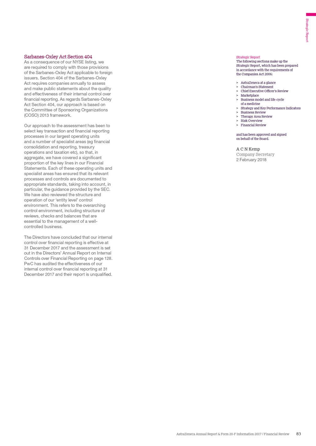 Sarbanes-Oxley Act Section 404 As a consequence of our NYSE listing, we are required to comply with those provisions of the Sarbanes-Oxley Act applicable to foreign issuers. Section 404 of the Sarbanes-Oxley Act requires companies annually to assess and make public statements about the quality and effectiveness of their internal control over financial reporting. As regards Sarbanes-Oxley Act Section 404, our approach is based on the Committee of Sponsoring Organizations (COSO) 2013 framework. Strategic Report The following sections make up the Strategic Report, which has been prepared in accordance with the requirements of the Companies Act 2006: > > > > > AstraZeneca at a glance Chairman’s Statement Chief Executive Officer’s Review Marketplace Business model and life-cycle of a medicine Strategy and Key Performance Indicators Business Review Therapy Area Review Risk Overview Financial Review > > > > > Our approach to the assessment has been to select key transaction and financial reporting processes in our largest operating units and a number of specialist areas (eg financial consolidation and reporting, treasury operations and taxation etc), so that, in aggregate, we have covered a significant proportion of the key lines in our Financial Statements. Each of these operating units and specialist areas has ensured that its relevant processes and controls are documented to appropriate standards, taking into account, in particular, the guidance provided by the SEC. We have also reviewed the structure and operation of our ‘entity level’ control environment. This refers to the overarching control environment, including structure of reviews, checks and balances that are essential to the management of a well-controlled business. and has been approved and signed on behalf of the Board. A C N Kemp Company Secretary 2 February 2018 The Directors have concluded that our internal control over financial reporting is effective at 31 December 2017 and the assessment is set out in the Directors’ Annual Report on Internal Controls over Financial Reporting on page 128. PwC has audited the effectiveness of our internal control over financial reporting at 31 December 2017 and their report is unqualified. 83 AstraZeneca Annual Report & Form 20-F Information 2017 / Financial Review Strategic Report