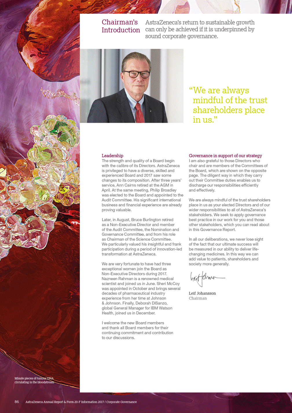 Chairman’s Introduction AstraZeneca’s return to sustainable growth can only be achieved if it is underpinned by sound corporate governance. “We are always mindful of the trust shareholders place in us.” Leadership The strength and quality of a Board begin with the calibre of its Directors. AstraZeneca is privileged to have a diverse, skilled and experienced Board and 2017 saw some changes to its composition. After three years’ service, Ann Cairns retired at the AGM in April. At the same meeting, Philip Broadley was elected to the Board and appointed to the Audit Committee. His significant international business and financial experience are already proving valuable. Governance in support of our strategy I am also grateful to those Directors who chair and are members of the Committees of the Board, which are shown on the opposite page. The diligent way in which they carry out their Committee duties enables us to discharge our responsibilities efficiently and effectively. We are always mindful of the trust shareholders place in us as your elected Directors and of our wider responsibilities to all of AstraZeneca’s stakeholders. We seek to apply governance best practice in our work for you and those other stakeholders, which you can read about in this Governance Report. Later, in August, Bruce Burlington retired as a Non-Executive Director and member of the Audit Committee, the Nomination and Governance Committee, and from his role as Chairman of the Science Committee. We particularly valued his insightful and frank participation during a period of innovation-led transformation at AstraZeneca. In all our deliberations, we never lose sight of the fact that our ultimate success will be measured in our ability to deliver life-changing medicines. In this way we can add value to patients, shareholders and society more generally. We are very fortunate to have had three exceptional women join the Board as Non-Executive Directors during 2017. Nazneen Rahman is a renowned medical scientist and joined us in June. Sheri McCoy was appointed in October and brings several decades of pharmaceutical industry experience from her time at Johnson & Johnson. Finally, Deborah DiSanzo, global General Manager for IBM Watson Health, joined us in December. Leif Johansson Chairman I welcome the new Board members and thank all Board members for their continuing commitment and contribution to our discussions. Minute pieces of tumour DNA circulating in the bloodstream 86 AstraZeneca Annual Report & Form 20-F Information 2017 / Corporate Governance