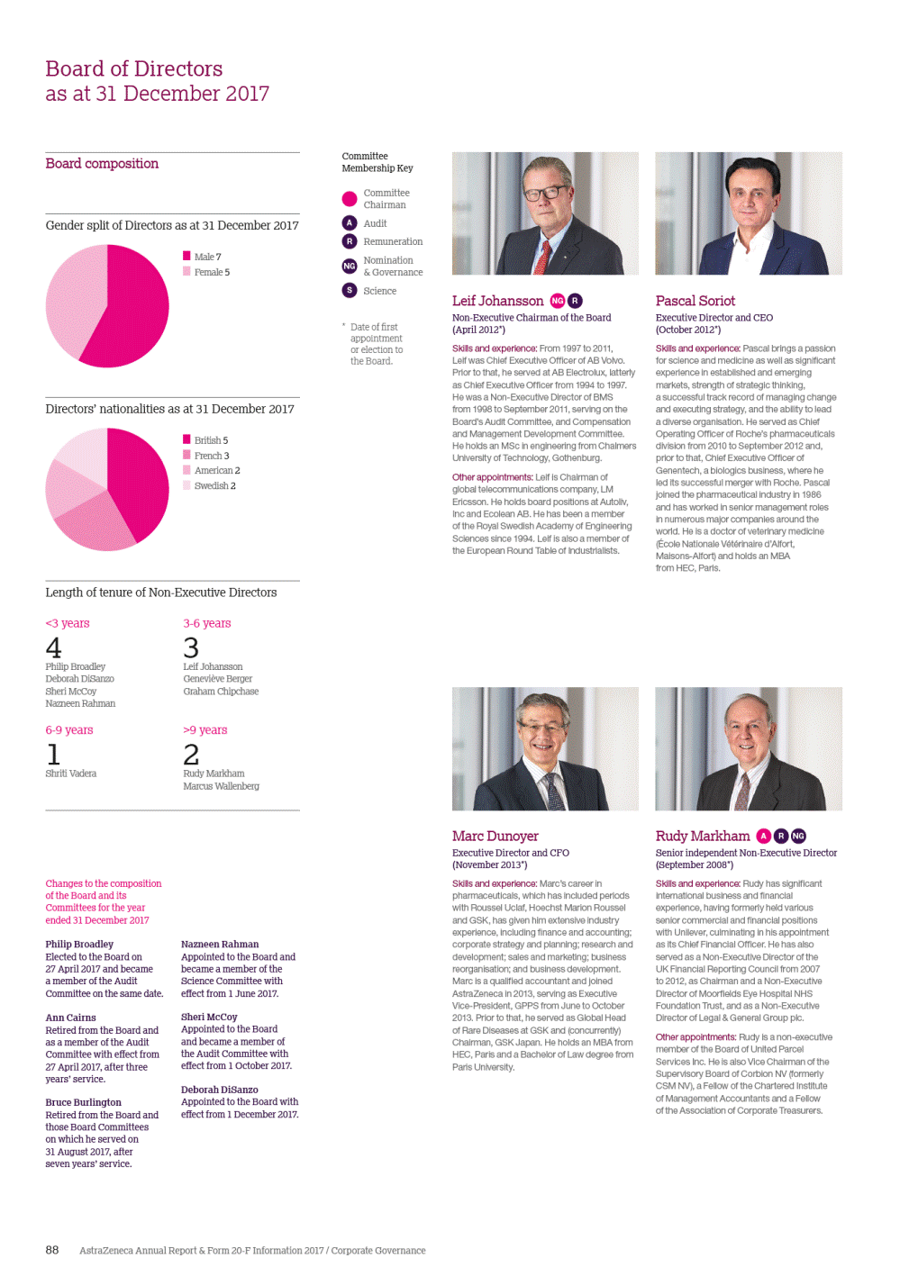 Board of Directors as at 31 December 2017 Committee Membership Key Board composition Committee Chairman A Audit R Remuneration Gender split of Directors as at 31 December 2017 Male 7 Female 5 Nomination & Governance NG S Science Leif Johansson Pascal Soriot Executive Director and CEO (October 2012*) Skills and experience: Pascal brings a passion for science and medicine as well as significant experience in established and emerging markets, strength of strategic thinking, a successful track record of managing change and executing strategy, and the ability to lead a diverse organisation. He served as Chief Operating Officer of Roche’s pharmaceuticals division from 2010 to September 2012 and, prior to that, Chief Executive Officer of Genentech, a biologics business, where he led its successful merger with Roche. Pascal joined the pharmaceutical industry in 1986 and has worked in senior management roles in numerous major companies around the world. He is a doctor of veterinary medicine (École Nationale Vétérinaire d’Alfort, Maisons-Alfort) and holds an MBA from HEC, Paris. NG R Non-Executive Chairman of the Board (April 2012*) Skills and experience: From 1997 to 2011, Leif was Chief Executive Officer of AB Volvo. Prior to that, he served at AB Electrolux, latterly as Chief Executive Officer from 1994 to 1997. He was a Non-Executive Director of BMS from 1998 to September 2011, serving on the Board’s Audit Committee, and Compensation and Management Development Committee. He holds an MSc in engineering from Chalmers University of Technology, Gothenburg. Other appointments: Leif is Chairman of global telecommunications company, LM Ericsson. He holds board positions at Autoliv, Inc and Ecolean AB. He has been a member of the Royal Swedish Academy of Engineering Sciences since 1994. Leif is also a member of the European Round Table of Industrialists. * D ate of first appointment or election to the Board. Directors’ nationalities as at 31 December 2017 British 5 French 3 American 2 Swedish 2 Length of tenure of Non-Executive Directors <3 years 3-6 years 4 Philip Broadley Deborah DiSanzo Sheri McCoy Nazneen Rahman 3 Leif Johansson Geneviève Berger Graham Chipchase 6-9 years >9 years 1 Shriti Vadera 2 Rudy Markham Marcus Wallenberg Marc Dunoyer Executive Director and CFO (November 2013*) Skills and experience: Marc’s career in pharmaceuticals, which has included periods with Roussel Uclaf, Hoechst Marion Roussel and GSK, has given him extensive industry experience, including finance and accounting; corporate strategy and planning; research and development; sales and marketing; business reorganisation; and business development. Marc is a qualified accountant and joined AstraZeneca in 2013, serving as Executive Vice-President, GPPS from June to October 2013. Prior to that, he served as Global Head of Rare Diseases at GSK and (concurrently) Chairman, GSK Japan. He holds an MBA from HEC, Paris and a Bachelor of Law degree from Paris University. Rudy Markham A R NG Senior independent Non-Executive Director (September 2008*) Skills and experience: Rudy has significant international business and financial experience, having formerly held various senior commercial and financial positions with Unilever, culminating in his appointment as its Chief Financial Officer. He has also served as a Non-Executive Director of the UK Financial Reporting Council from 2007 to 2012, as Chairman and a Non-Executive Director of Moorfields Eye Hospital NHS Foundation Trust, and as a Non-Executive Director of Legal & General Group plc. Other appointments: Rudy is a non-executive member of the Board of United Parcel Services Inc. He is also Vice Chairman of the Supervisory Board of Corbion NV (formerly CSM NV), a Fellow of the Chartered Institute of Management Accountants and a Fellow of the Association of Corporate Treasurers. Changes to the composition of the Board and its Committees for the year ended 31 December 2017 Philip Broadley Elected to the Board on 27 April 2017 and became a member of the Audit Committee on the same date. Nazneen Rahman Appointed to the Board and became a member of the Science Committee with effect from 1 June 2017. Sheri McCoy Appointed to the Board and became a member of the Audit Committee with effect from 1 October 2017. Ann Cairns Retired from the Board and as a member of the Audit Committee with effect from 27 April 2017, after three years’ service. Deborah DiSanzo Appointed to the Board with effect from 1 December 2017. Bruce Burlington Retired from the Board and those Board Committees on which he served on 31 August 2017, after seven years’ service. 88 AstraZeneca Annual Report & Form 20-F Information 2017 / Corporate Governance