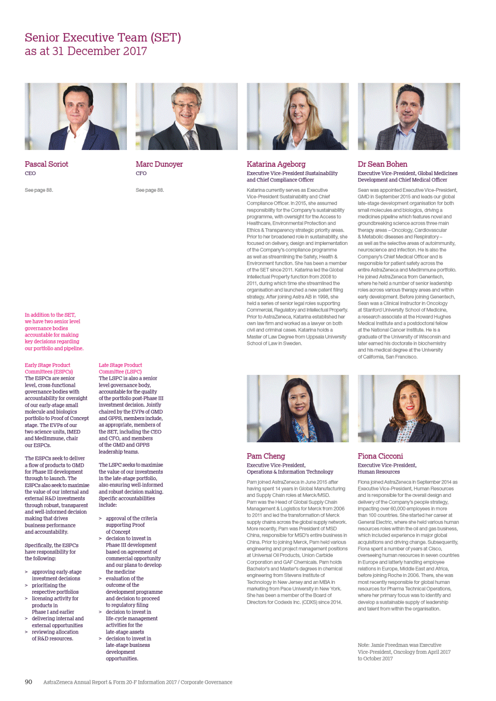 Senior Executive Team (SET) as at 31 December 2017 Pascal Soriot CEO Marc Dunoyer CFO Katarina Ageborg Executive Vice-President Sustainability and Chief Compliance Officer Katarina currently serves as Executive Vice-President Sustainability and Chief Compliance Officer. In 2015, she assumed responsibility for the Company’s sustainability programme, with oversight for the Access to Healthcare, Environmental Protection and Ethics & Transparency strategic priority areas. Prior to her broadened role in sustainability, she focused on delivery, design and implementation of the Company’s compliance programme as well as streamlining the Safety, Health & Environment function. She has been a member of the SET since 2011. Katarina led the Global Intellectual Property function from 2008 to 2011, during which time she streamlined the organisation and launched a new patent filing strategy. After joining Astra AB in 1998, she held a series of senior legal roles supporting Commercial, Regulatory and Intellectual Property. Prior to AstraZeneca, Katarina established her own law firm and worked as a lawyer on both civil and criminal cases. Katarina holds a Master of Law Degree from Uppsala University School of Law in Sweden. Dr Sean Bohen Executive Vice-President, Global Medicines Development and Chief Medical Officer Sean was appointed Executive Vice-President, GMD in September 2015 and leads our global late-stage development organisation for both small molecules and biologics, driving a medicines pipeline which features novel and groundbreaking science across three main therapy areas – Oncology, Cardiovascular & Metabolic diseases and Respiratory – as well as the selective areas of autoimmunity, neuroscience and infection. He is also the Company’s Chief Medical Officer and is responsible for patient safety across the entire AstraZeneca and MedImmune portfolio. He joined AstraZeneca from Genentech, where he held a number of senior leadership roles across various therapy areas and within early development. Before joining Genentech, Sean was a Clinical Instructor in Oncology at Stanford University School of Medicine, a research associate at the Howard Hughes Medical Institute and a postdoctoral fellow at the National Cancer Institute. He is a graduate of the University of Wisconsin and later earned his doctorate in biochemistry and his medical degree at the University of California, San Francisco. See page 88. See page 88. In addition to the SET, we have two senior level governance bodies accountable for making key decisions regarding our portfolio and pipeline. Early Stage Product Committees (ESPCs) The ESPCs are senior level, cross-functional governance bodies with accountability for oversight of our early-stage small molecule and biologics portfolio to Proof of Concept stage. The EVPs of our two science units, IMED and MedImmune, chair our ESPCs. Late Stage Product Committee (LSPC) The LSPC is also a senior level governance body, accountable for the quality of the portfolio post-Phase III investment decision. Jointly chaired by the EVPs of GMD and GPPS, members include, as appropriate, members of the SET, including the CEO and CFO, and members of the GMD and GPPS leadership teams. Pam Cheng Executive Vice-President, Operations & Information Technology Pam joined AstraZeneca in June 2015 after having spent 14 years in Global Manufacturing and Supply Chain roles at Merck/MSD. Pam was the Head of Global Supply Chain Management & Logistics for Merck from 2006 to 2011 and led the transformation of Merck supply chains across the global supply network. More recently, Pam was President of MSD China, responsible for MSD’s entire business in China. Prior to joining Merck, Pam held various engineering and project management positions at Universal Oil Products, Union Carbide Corporation and GAF Chemicals. Pam holds Bachelor’s and Master’s degrees in chemical engineering from Stevens Institute of Technology in New Jersey and an MBA in marketing from Pace University in New York. She has been a member of the Board of Directors for Codexis Inc. (CDXS) since 2014. Fiona Cicconi Executive Vice-President, Human Resources Fiona joined AstraZeneca in September 2014 as Executive Vice-President, Human Resources and is responsible for the overall design and delivery of the Company’s people strategy, impacting over 60,000 employees in more than 100 countries. She started her career at General Electric, where she held various human resources roles within the oil and gas business, which included experience in major global acquisitions and driving change. Subsequently, Fiona spent a number of years at Cisco, overseeing human resources in seven countries in Europe and latterly handling employee relations in Europe, Middle East and Africa, before joining Roche in 2006. There, she was most recently responsible for global human resources for Pharma Technical Operations, where her primary focus was to identify and develop a sustainable supply of leadership and talent from within the organisation. The ESPCs seek to deliver a flow of products to GMD for Phase III development through to launch. The ESPCs also seek to maximise the value of our internal and external R&D investments through robust, transparent and well-informed decision making that drives business performance and accountability. The LSPC seeks to maximise the value of our investments in the late-stage portfolio, also ensuring well-informed and robust decision making. Specific accountabilities include: > approval of the criteria supporting Proof of Concept decision to invest in Phase III development based on agreement of commercial opportunity and our plans to develop the medicine evaluation of the outcome of the development programme and decision to proceed to regulatory filing decision to invest in life-cycle management activities for the late-stage assets decision to invest in late-stage business development opportunities. > Specifically, the ESPCs have re