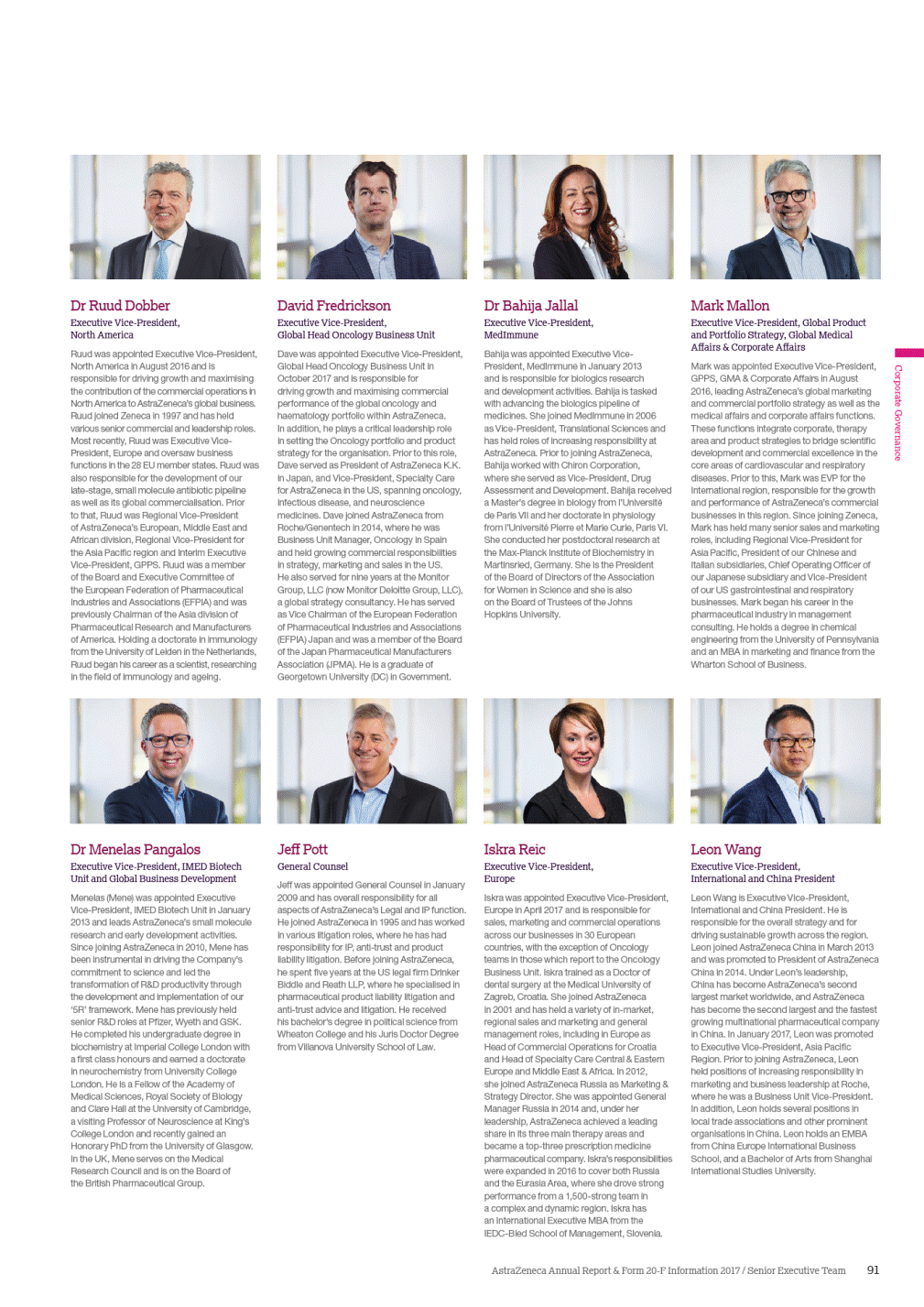 Dr Ruud Dobber Executive Vice-President, North America Ruud was appointed Executive Vice-President, North America in August 2016 and is responsible for driving growth and maximising the contribution of the commercial operations in North America to AstraZeneca’s global business. Ruud joined Zeneca in 1997 and has held various senior commercial and leadership roles. Most recently, Ruud was Executive Vice-President, Europe and oversaw business functions in the 28 EU member states. Ruud was also responsible for the development of our late-stage, small molecule antibiotic pipeline as well as its global commercialisation. Prior to that, Ruud was Regional Vice-President of AstraZeneca’s European, Middle East and African division, Regional Vice-President for the Asia Pacific region and Interim Executive Vice-President, GPPS. Ruud was a member of the Board and Executive Committee of the European Federation of Pharmaceutical Industries and Associations (EFPIA) and was previously Chairman of the Asia division of Pharmaceutical Research and Manufacturers of America. Holding a doctorate in immunology from the University of Leiden in the Netherlands, Ruud began his career as a scientist, researching in the field of immunology and ageing. David Fredrickson Executive Vice-President, Global Head Oncology Business Unit Dave was appointed Executive Vice-President, Global Head Oncology Business Unit in October 2017 and is responsible for driving growth and maximising commercial performance of the global oncology and haematology portfolio within AstraZeneca. In addition, he plays a critical leadership role in setting the Oncology portfolio and product strategy for the organisation. Prior to this role, Dave served as President of AstraZeneca K.K. in Japan, and Vice-President, Specialty Care for AstraZeneca in the US, spanning oncology, infectious disease, and neuroscience medicines. Dave joined AstraZeneca from Roche/Genentech in 2014, where he was Business Unit Manager, Oncology in Spain and held growing commercial responsibilities in strategy, marketing and sales in the US. He also served for nine years at the Monitor Group, LLC (now Monitor Deloitte Group, LLC), a global strategy consultancy. He has served as Vice Chairman of the European Federation of Pharmaceutical Industries and Associations (EFPIA) Japan and was a member of the Board of the Japan Pharmaceutical Manufacturers Association (JPMA). He is a graduate of Georgetown University (DC) in Government. Dr Bahija Jallal Executive Vice-President, MedImmune Bahija was appointed Executive Vice-President, MedImmune in January 2013 and is responsible for biologics research and development activities. Bahija is tasked with advancing the biologics pipeline of medicines. She joined MedImmune in 2006 as Vice-President, Translational Sciences and has held roles of increasing responsibility at AstraZeneca. Prior to joining AstraZeneca, Bahija worked with Chiron Corporation, where she served as Vice-President, Drug Assessment and Development. Bahija received a Master’s degree in biology from l’Université de Paris VII and her doctorate in physiology from l’Université Pierre et Marie Curie, Paris VI. She conducted her postdoctoral research at the Max-Planck Institute of Biochemistry in Martinsried, Germany. She is the President of the Board of Directors of the Association for Women in Science and she is also on the Board of Trustees of the Johns Hopkins University. Mark Mallon Executive Vice-President, Global Product and Portfolio Strategy, Global Medical Affairs & Corporate Affairs Mark was appointed Executive Vice-President, GPPS, GMA & Corporate Affairs in August 2016, leading AstraZeneca’s global marketing and commercial portfolio strategy as well as the medical affairs and corporate affairs functions. These functions integrate corporate, therapy area and product strategies to bridge scientific development and commercial excellence in the core areas of cardiovascular and respiratory diseases. Prior to this, Mark was EVP for the International region, responsible for the growth and performance of AstraZeneca’s commercial businesses in this region. Since joining Zeneca, Mark has held many senior sales and marketing roles, including Regional Vice-President for Asia Pacific, President of our Chinese and Italian subsidiaries, Chief Operating Officer of our Japanese subsidiary and Vice-President of our US gastrointestinal and respiratory businesses. Mark began his career in the pharmaceutical industry in management consulting. He holds a degree in chemical engineering from the University of Pennsylvania and an MBA in marketing and finance from the Wharton School of Business. Dr Menelas Pangalos Executive Vice-President, IMED Biotech Unit and Global Business Development Menelas (Mene) was appointed Executive Vice-President, IMED Biotech Unit in January 2013 and leads AstraZeneca’s small molecule research and early development activities. Since joining AstraZeneca in 2010, Mene has been instrumental in driving the Company’s commitment to science and led the transformation of R&D productivity through the development and implementation of our ‘5R’ framework. Mene has previously held senior R&D roles at Pfizer, Wyeth and GSK. He completed his undergraduate degree in biochemistry at Imperial College London with a first class honours and earned a doctorate in neurochemistry from University College London. He is a Fellow of the Academy of Medical Sciences, Royal Society of Biology and Clare Hall at the University of Cambridge, a visiting Professor of Neuroscience at King’s College London and recently gained an Honorary PhD from the University of Glasgow. In the UK, Mene serves on the Medical Research Council and is on the Board of the British Pharmaceutical Group. Jeff Pott General Counsel Jeff was appointed General Counsel in January 2009 and has overall responsibility for all aspects of AstraZeneca’s Legal and IP function. He joined AstraZeneca 