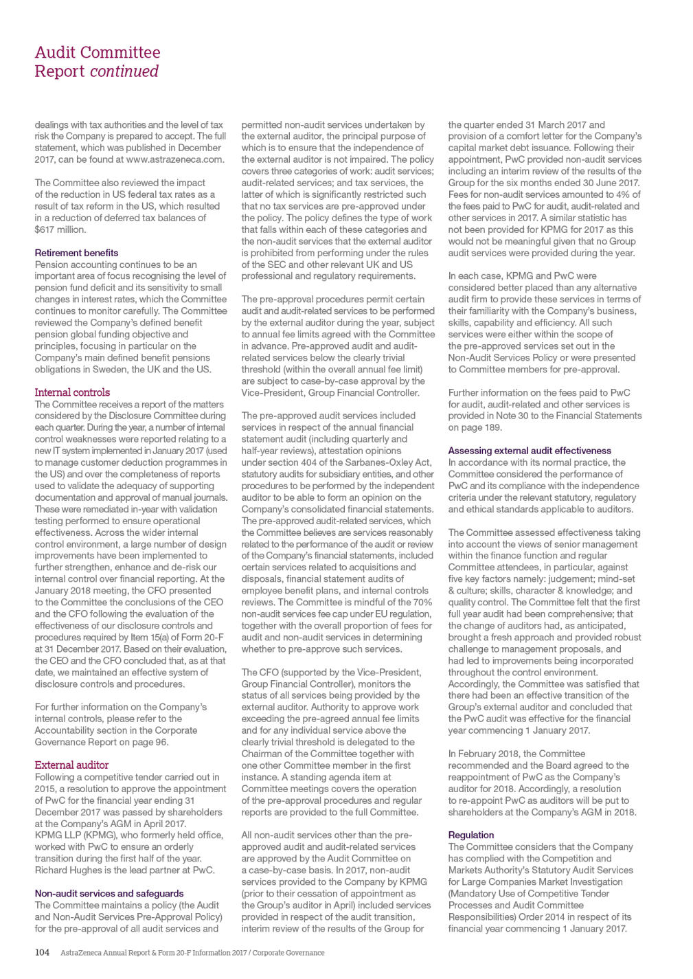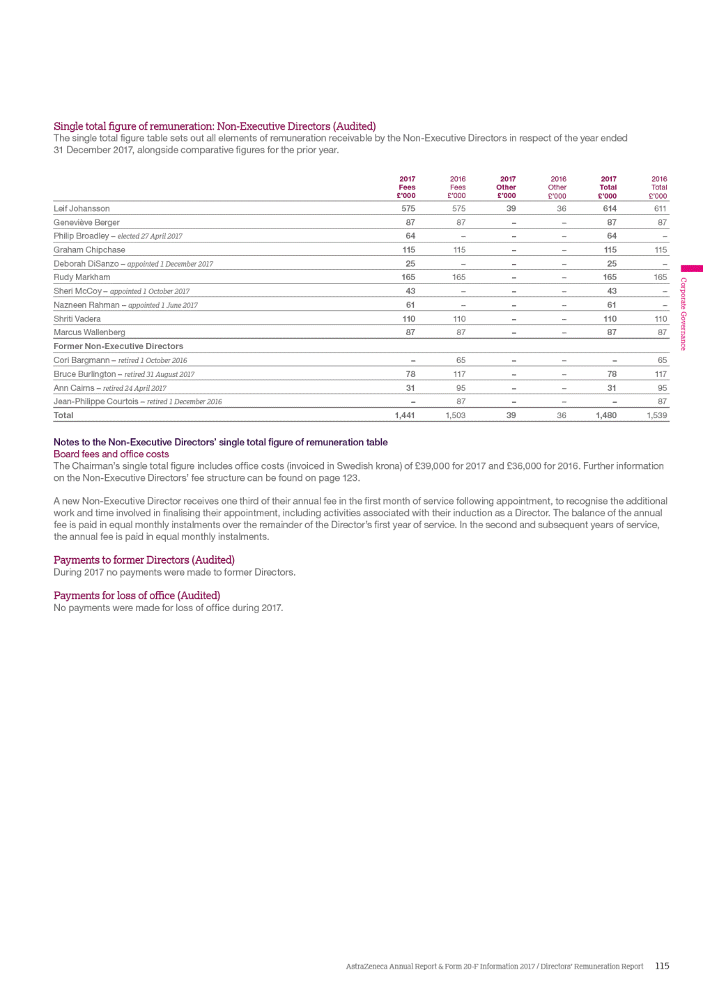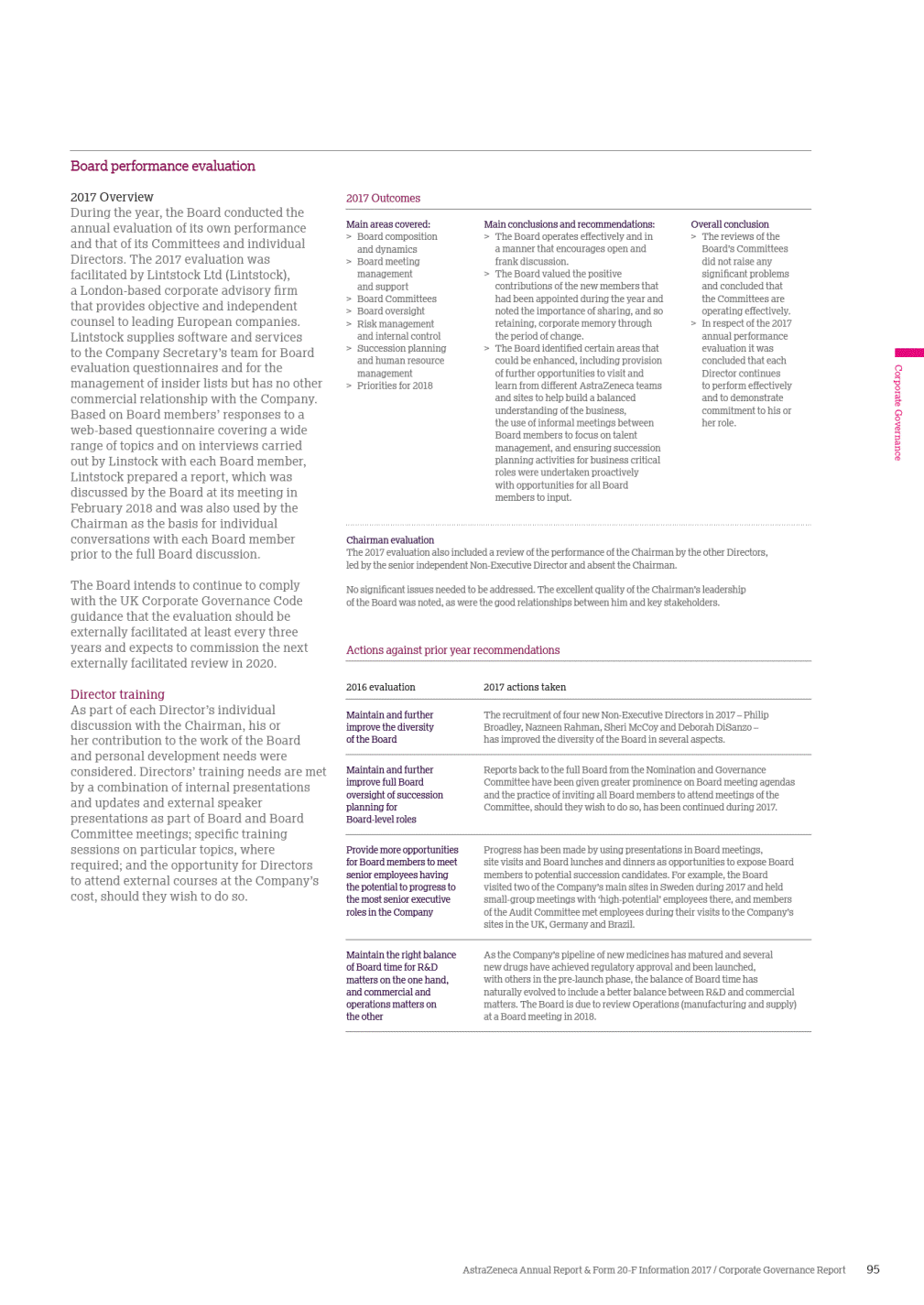 Board performance evaluation 2017 Overview During the year, the Board conducted the annual evaluation of its own performance and that of its Committees and individual Directors. The 2017 evaluation was facilitated by Lintstock Ltd (Lintstock), a London-based corporate advisory firm that provides objective and independent counsel to leading European companies. Lintstock supplies software and services to the Company Secretary’s team for Board evaluation questionnaires and for the management of insider lists but has no other commercial relationship with the Company. Based on Board members’ responses to a web-based questionnaire covering a wide range of topics and on interviews carried out by Linstock with each Board member, Lintstock prepared a report, which was discussed by the Board at its meeting in February 2018 and was also used by the Chairman as the basis for individual conversations with each Board member prior to the full Board discussion. 2017 Outcomes Main areas covered: > Board composition and dynamics > Board meeting management and support > Board Committees > Board oversight > Risk management and internal control > Succession planning and human resource management > Priorities for 2018 Main conclusions and recommendations: > The Board operates effectively and in a manner that encourages open and frank discussion. > The Board valued the positive contributions of the new members that had been appointed during the year and noted the importance of sharing, and so retaining, corporate memory through the period of change. > The Board identified certain areas that could be enhanced, including provision of further opportunities to visit and learn from different AstraZeneca teams and sites to help build a balanced understanding of the business, the use of informal meetings between Board members to focus on talent management, and ensuring succession planning activities for business critical roles were undertaken proactively with opportunities for all Board members to input. Overall conclusion > The reviews of the Board’s Committees did not raise any significant problems and concluded that the Committees are operating effectively. > In respect of the 2017 annual performance evaluation it was concluded that each Director continues to perform effectively and to demonstrate commitment to his or her role. Chairman evaluation The 2017 evaluation also included a review of the performance of the Chairman by the other Directors, led by the senior independent Non-Executive Director and absent the Chairman. The Board intends to continue to comply with the UK Corporate Governance Code guidance that the evaluation should be externally facilitated at least every three years and expects to commission the next externally facilitated review in 2020. No significant issues needed to be addressed. The excellent quality of the Chairman’s leadership of the Board was noted, as were the good relationships between him and key stakeholders. Actions against prior year recommendations 2016 evaluation 2017 actions taken Director training As part of each Director’s individual discussion with the Chairman, his or her contribution to the work of the Board and personal development needs were considered. Directors’ training needs are met by a combination of internal presentations and updates and external speaker presentations as part of Board and Board Committee meetings; specific training sessions on particular topics, where required; and the opportunity for Directors to attend external courses at the Company’s cost, should they wish to do so. Maintain and further improve the diversity of the Board The recruitment of four new Non-Executive Directors in 2017 – Philip Broadley, Nazneen Rahman, Sheri McCoy and Deborah DiSanzo – has improved the diversity of the Board in several aspects. Maintain and further improve full Board oversight of succession planning for Board-level roles Reports back to the full Board from the Nomination and Governance Committee have been given greater prominence on Board meeting agendas and the practice of inviting all Board members to attend meetings of the Committee, should they wish to do so, has been continued during 2017. Provide more opportunities for Board members to meet senior employees having the potential to progress to the most senior executive roles in the Company Progress has been made by using presentations in Board meetings, site visits and Board lunches and dinners as opportunities to expose Board members to potential succession candidates. For example, the Board visited two of the Company’s main sites in Sweden during 2017 and held small-group meetings with ‘high-potential’ employees there, and members of the Audit Committee met employees during their visits to the Company’s sites in the UK, Germany and Brazil. Maintain the right balance of Board time for R&D matters on the one hand, and commercial and operations matters on the other As the Company’s pipeline of new medicines has matured and several new drugs have achieved regulatory approval and been launched, with others in the pre-launch phase, the balance of Board time has naturally evolved to include a better balance between R&D and commercial matters. The Board is due to review Operations (manufacturing and supply) at a Board meeting in 2018. 95 AstraZeneca Annual Report & Form 20-F Information 2017 / Corporate Governance Report Corporate Governance