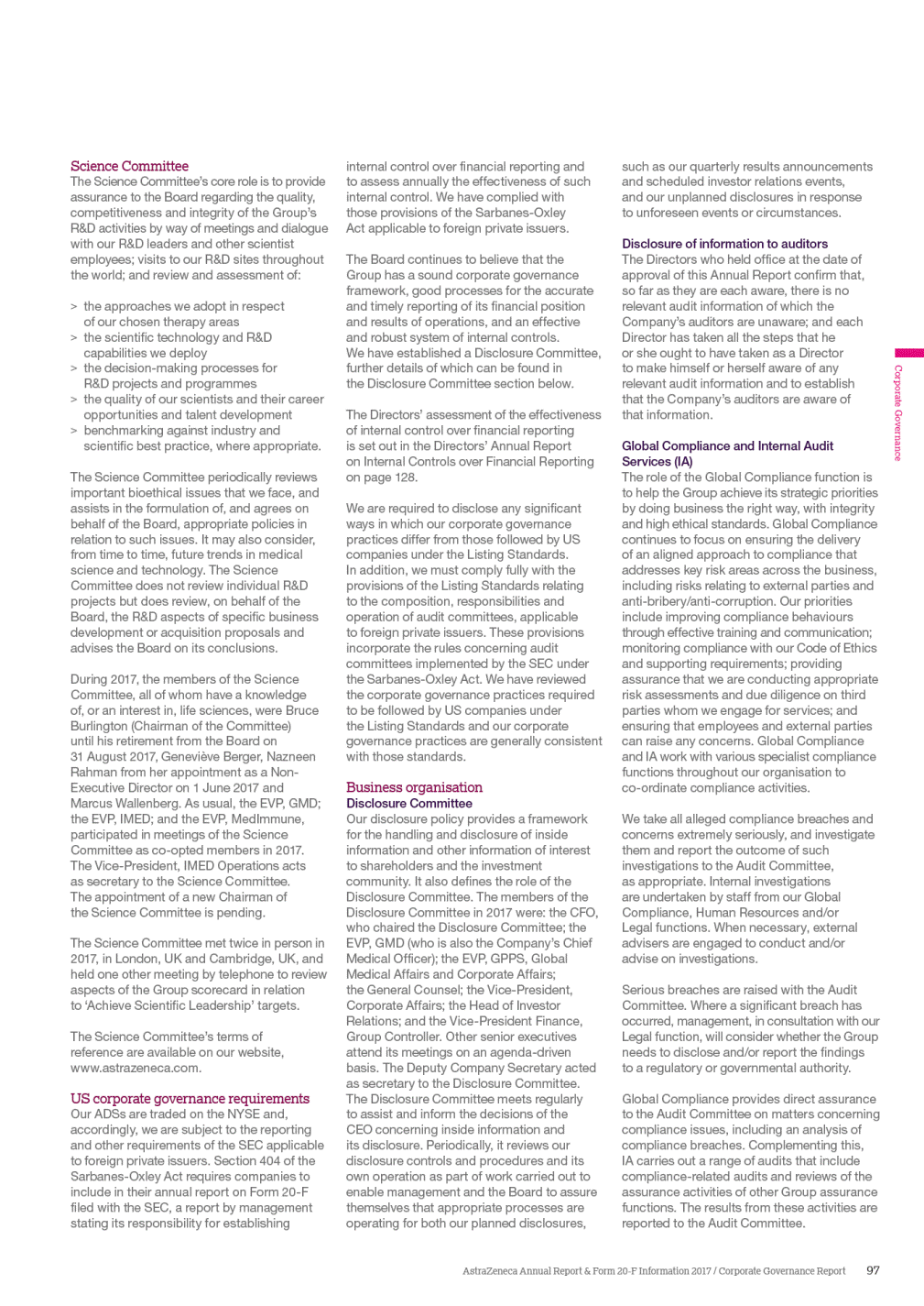 Science Committee The Science Committee’s core role is to provide assurance to the Board regarding the quality, competitiveness and integrity of the Group’s R&D activities by way of meetings and dialogue with our R&D leaders and other scientist employees; visits to our R&D sites throughout the world; and review and assessment of: internal control over financial reporting and to assess annually the effectiveness of such internal control. We have complied with those provisions of the Sarbanes-Oxley Act applicable to foreign private issuers. such as our quarterly results announcements and scheduled investor relations events, and our unplanned disclosures in response to unforeseen events or circumstances. Disclosure of information to auditors The Directors who held office at the date of approval of this Annual Report confirm that, so far as they are each aware, there is no relevant audit information of which the Company’s auditors are unaware; and each Director has taken all the steps that he or she ought to have taken as a Director to make himself or herself aware of any relevant audit information and to establish that the Company’s auditors are aware of that information. The Board continues to believe that the Group has a sound corporate governance framework, good processes for the accurate and timely reporting of its financial position and results of operations, and an effective and robust system of internal controls. We have established a Disclosure Committee, further details of which can be found in the Disclosure Committee section below. > the approaches we adopt in respect of our chosen therapy areas > the scientific technology and R&D capabilities we deploy > the decision-making processes for R&D projects and programmes > the quality of our scientists and their career opportunities and talent development > benchmarking against industry and scientific best practice, where appropriate. The Directors’ assessment of the effectiveness of internal control over financial reporting is set out in the Directors’ Annual Report on Internal Controls over Financial Reporting on page 128. Global Compliance and Internal Audit Services (IA) The role of the Global Compliance function is to help the Group achieve its strategic priorities by doing business the right way, with integrity and high ethical standards. Global Compliance continues to focus on ensuring the delivery of an aligned approach to compliance that addresses key risk areas across the business, including risks relating to external parties and anti-bribery/anti-corruption. Our priorities include improving compliance behaviours through effective training and communication; monitoring compliance with our Code of Ethics and supporting requirements; providing assurance that we are conducting appropriate risk assessments and due diligence on third parties whom we engage for services; and ensuring that employees and external parties can raise any concerns. Global Compliance and IA work with various specialist compliance functions throughout our organisation to co-ordinate compliance activities. The Science Committee periodically reviews important bioethical issues that we face, and assists in the formulation of, and agrees on behalf of the Board, appropriate policies in relation to such issues. It may also consider, from time to time, future trends in medical science and technology. The Science Committee does not review individual R&D projects but does review, on behalf of the Board, the R&D aspects of specific business development or acquisition proposals and advises the Board on its conclusions. We are required to disclose any significant ways in which our corporate governance practices differ from those followed by US companies under the Listing Standards. In addition, we must comply fully with the provisions of the Listing Standards relating to the composition, responsibilities and operation of audit committees, applicable to foreign private issuers. These provisions incorporate the rules concerning audit committees implemented by the SEC under the Sarbanes-Oxley Act. We have reviewed the corporate governance practices required to be followed by US companies under the Listing Standards and our corporate governance practices are generally consistent with those standards. During 2017, the members of the Science Committee, all of whom have a knowledge of, or an interest in, life sciences, were Bruce Burlington (Chairman of the Committee) until his retirement from the Board on 31 August 2017, Geneviève Berger, Nazneen Rahman from her appointment as a Non-Executive Director on 1 June 2017 and Marcus Wallenberg. As usual, the EVP, GMD; the EVP, IMED; and the EVP, MedImmune, participated in meetings of the Science Committee as co-opted members in 2017. The Vice-President, IMED Operations acts as secretary to the Science Committee. The appointment of a new Chairman of the Science Committee is pending. Business organisation Disclosure Committee Our disclosure policy provides a framework for the handling and disclosure of inside information and other information of interest to shareholders and the investment community. It also defines the role of the Disclosure Committee. The members of the Disclosure Committee in 2017 were: the CFO, who chaired the Disclosure Committee; the EVP, GMD (who is also the Company’s Chief Medical Officer); the EVP, GPPS, Global Medical Affairs and Corporate Affairs; the General Counsel; the Vice-President, Corporate Affairs; the Head of Investor Relations; and the Vice-President Finance, Group Controller. Other senior executives attend its meetings on an agenda-driven basis. The Deputy Company Secretary acted as secretary to the Disclosure Committee. The Disclosure Committee meets regularly to assist and inform the decisions of the CEO concerning inside information and its disclosure. Periodically, it reviews our disclosure controls and procedures and its own operation as part of work carried out to enable m