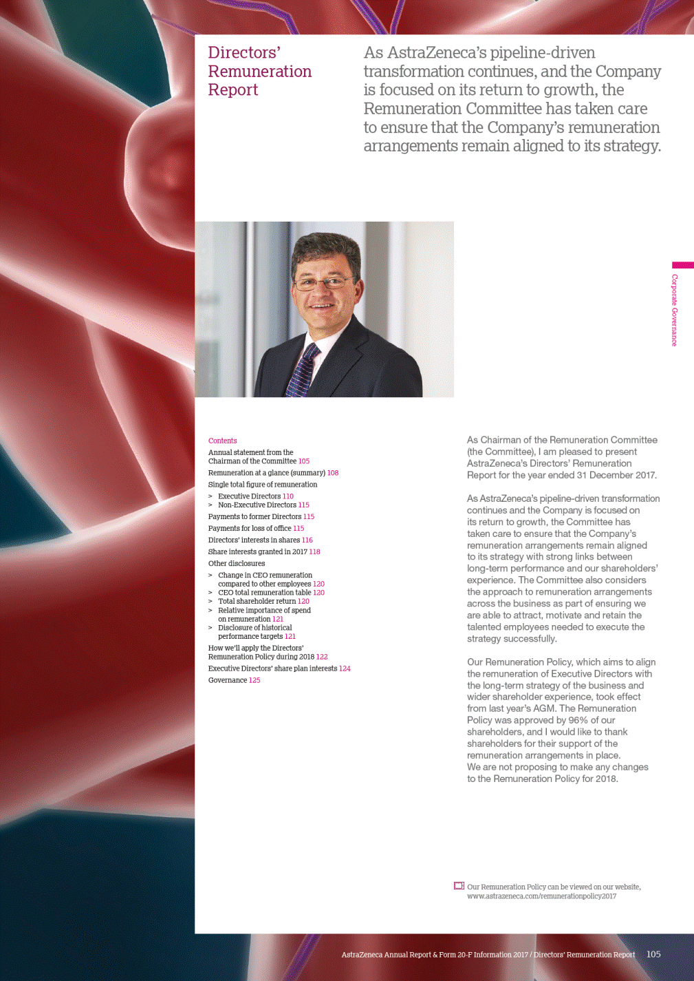 Corporate Governance Chairman’s Introduction 86 Corporate Governance Overview 87 Board of Directors 88 Senior Executive Team 90 Corporate Governance Report 92 Audit Committee Report 100 Directors’ Remuneration Report 105 85 AstraZeneca Annual Report & Form 20-F Information 2017 / Corporate Governance Corporate Governance
