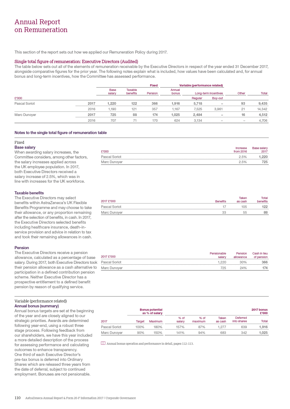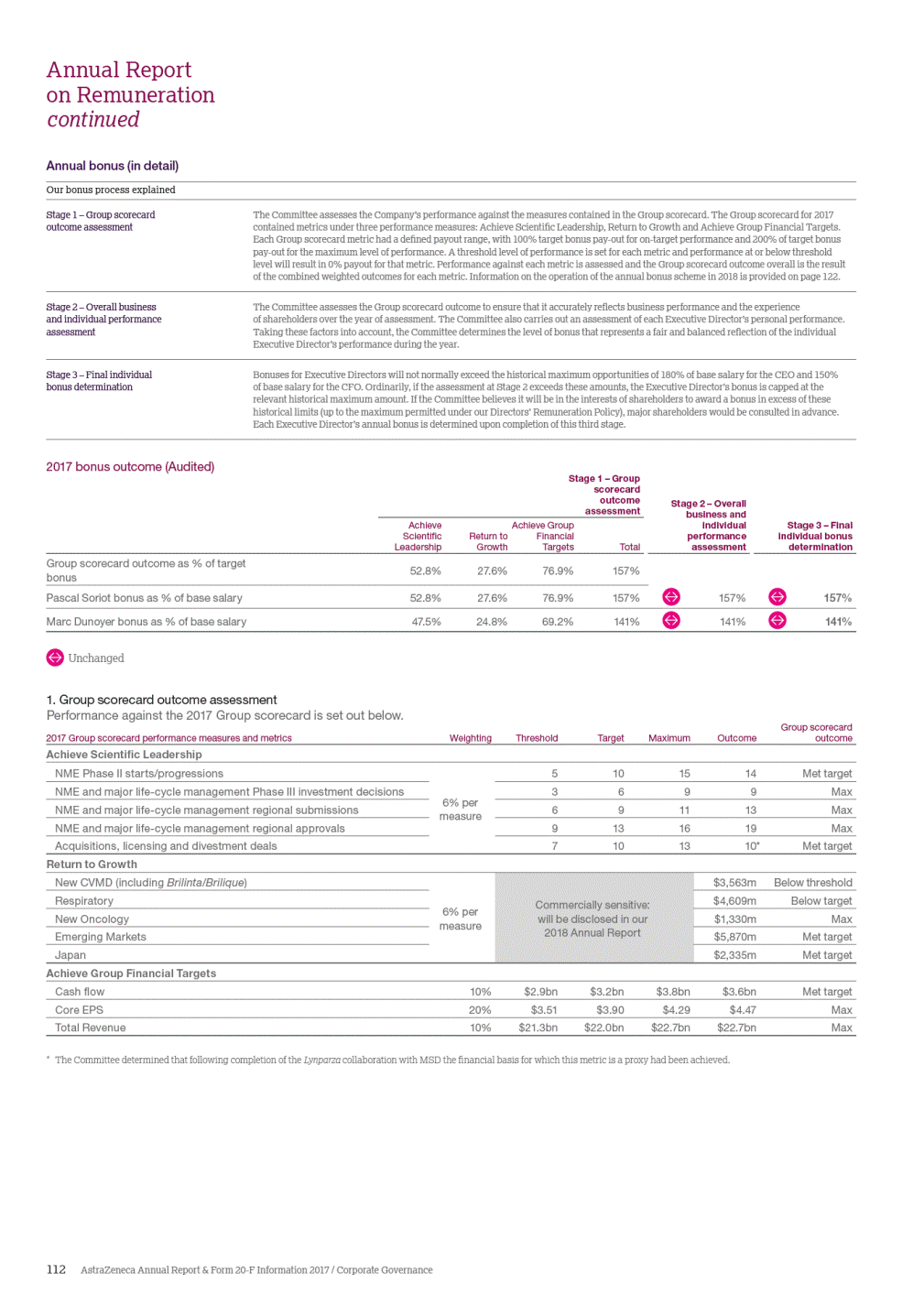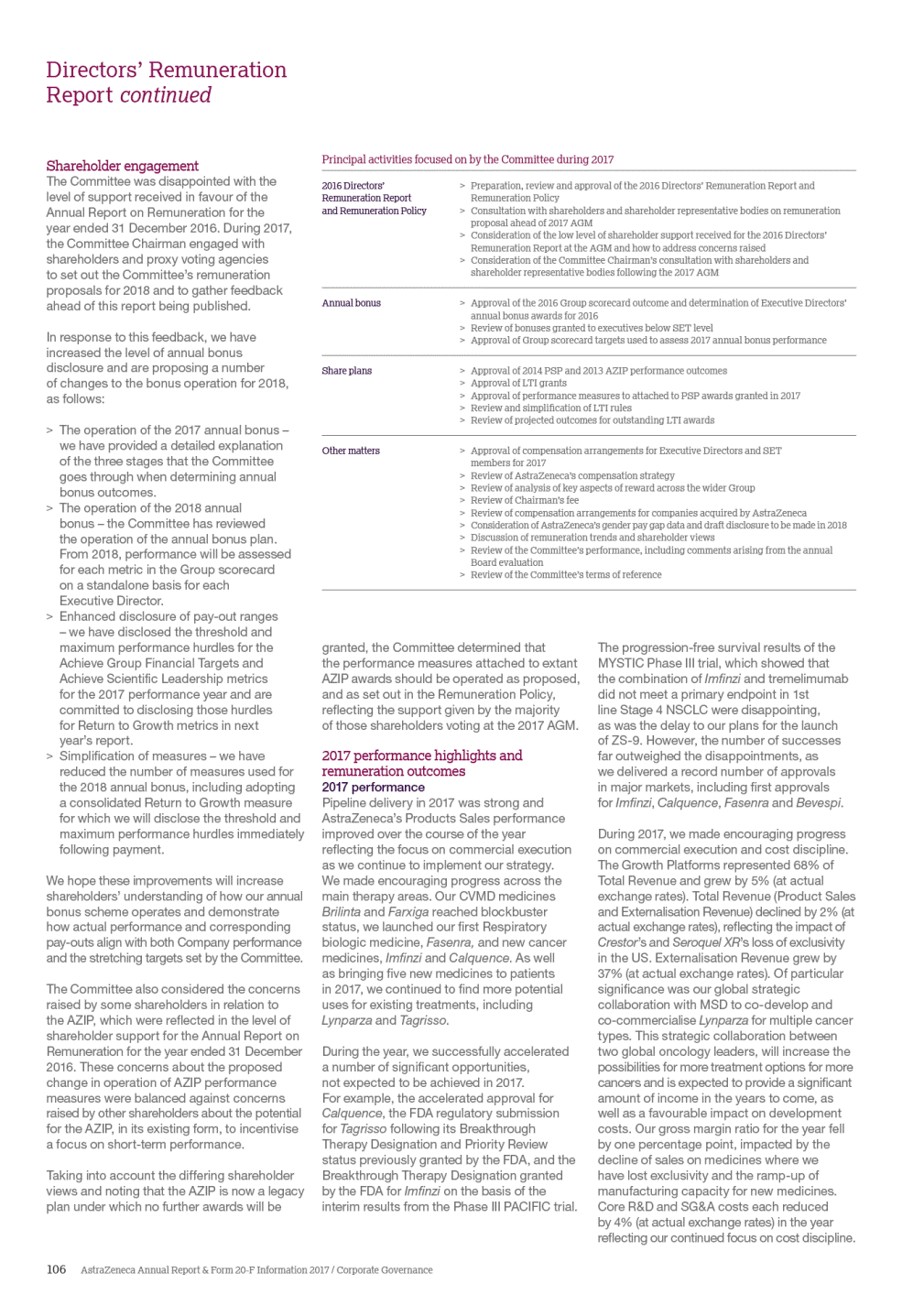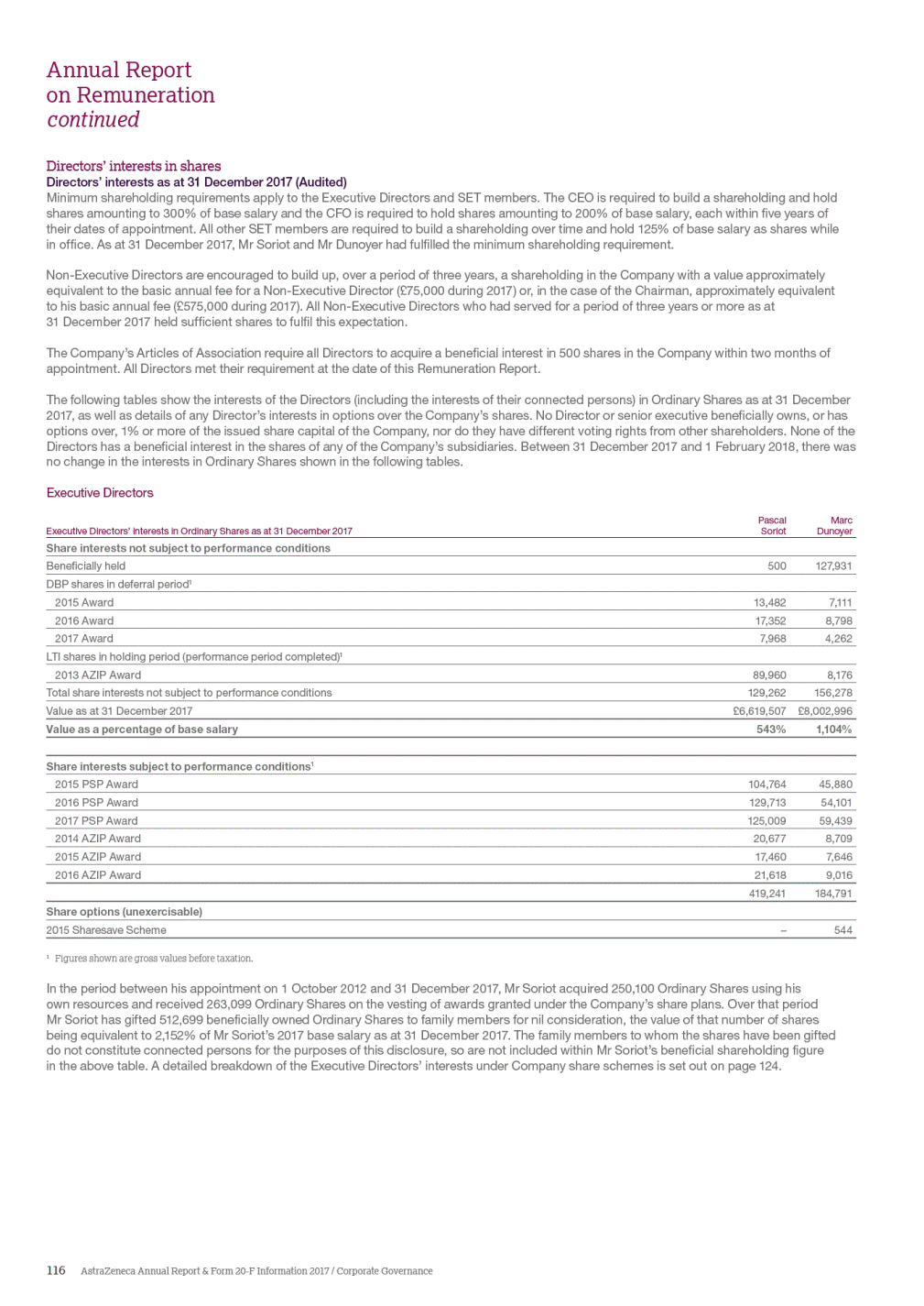 Corporate Governance Report All Directors are collectively responsible for the success of the Group. Leadership and responsibilities The roles of Chairman and CEO are split. Leif Johansson, our Non-Executive Chairman, is responsible for leadership of the Board. Our CEO, Pascal Soriot, leads the SET and has executive responsibility for running our business. The Board comprises 10 Non-Executive Directors, including the Chairman, and two Executive Directors – the CEO, Pascal Soriot, and the CFO, Marc Dunoyer. Its responsibilities are set out in the Corporate Governance Overview on page 87. The CEO is responsible to the Board for the management, development and performance of our business for those matters for which he has been delegated authority from the Board. Although the CEO retains full responsibility for the authority delegated to him by the Board, he has established, and chairs, the SET, which is the vehicle through which he exercises that authority in respect of our business. Corporate governance We have prepared this Annual Report with reference to the UK Corporate Governance Code published by the UK Financial Reporting Council (FRC) in April 2016. This Corporate Governance Report (together with other sections of this Annual Report) describes how we apply the main principles of good governance in the UK Corporate Governance Code. We have complied throughout the accounting period with the provisions of the UK Corporate Governance Code, which is available on the FRC’s website, www.frc.org.uk. The roles of the Board, Board Committees, Chairman and CEO are documented, as are the Board’s reserved powers and delegated authorities. Rudy Markham, who joined the Board as a Non-Executive Director in 2008, was appointed as our senior independent Non-Executive Director in April 2015. The role of the senior independent Non-Executive Director is to serve as a sounding board for the Chairman and as an intermediary for the other Directors when necessary. The senior independent Non-Executive Director is also available to shareholders if they have concerns that contact through the normal channels of Chairman or Executive Directors has failed to resolve, or for which such contact is inappropriate. Operation of the Board The Board discharges its responsibilities as set out in the Corporate Governance Overview on page 87 through a programme of meetings that includes regular reviews of financial performance and critical business issues, and the formal annual strategy review day. The Board also aims to ensure that a good dialogue with our shareholders is maintained and that their issues and concerns are understood and considered. The Board held six meetings in 2017, including its usual annual strategy review. Five took place in London, UK and one at AstraZeneca facilities in Sweden. The Board is currently scheduled to meet six times in 2018 and will meet at such other times as may be required to conduct business. As shown in the Corporate Governance Overview, there are four principal Board Committees. The membership and work of these Committees is described on the following pages. In addition, there may from time to time be constituted ad hoc Board Committees for specific projects or tasks. As part of the business of each Board meeting, the CEO typically submits a progress report, giving details of business performance and progress against the goals the Board has approved. To ensure that the Board has good visibility of the key operating decisions of the business, members of the SET attend Board meetings regularly and Board members meet other senior executives throughout the year. The Board also receives accounting and other management information about our resources, and presentations from internal and external speakers on legal, governance and regulatory developments. At the end of Board meetings, the Non-Executive Directors meet without the Executive Directors present to review and discuss any matters that have arisen during the meeting and/or such other matters as may appear to the Non-Executive Directors to be relevant in properly discharging their duty to act independently. In these cases, the scope and responsibilities of the Committee are documented. The Board provides adequate resources to enable each Committee to undertake its duties. Reserved matters and delegation of authority The Board maintains and periodically reviews a list of matters that are reserved to, and can only be approved by, the Board. These include: the appointment, termination and remuneration of any Director; approval of the annual budget; approval of any item of fixed capital expenditure or any proposal for the acquisition or disposal of an investment or business which exceeds $150 million; the raising of capital or loans by the Company (subject to certain exceptions); the giving of any guarantee in respect of any borrowing of the Company; and allotting shares of the Company. The matters that have not been expressly reserved to the Board are delegated by the Board to its Committees or the CEO. The membership of the Board at 31 December 2017 and information about individual Directors is contained in the Board of Directors section on pages 88 and 89. 92 AstraZeneca Annual Report & Form 20-F Information 2017 / Corporate Governance