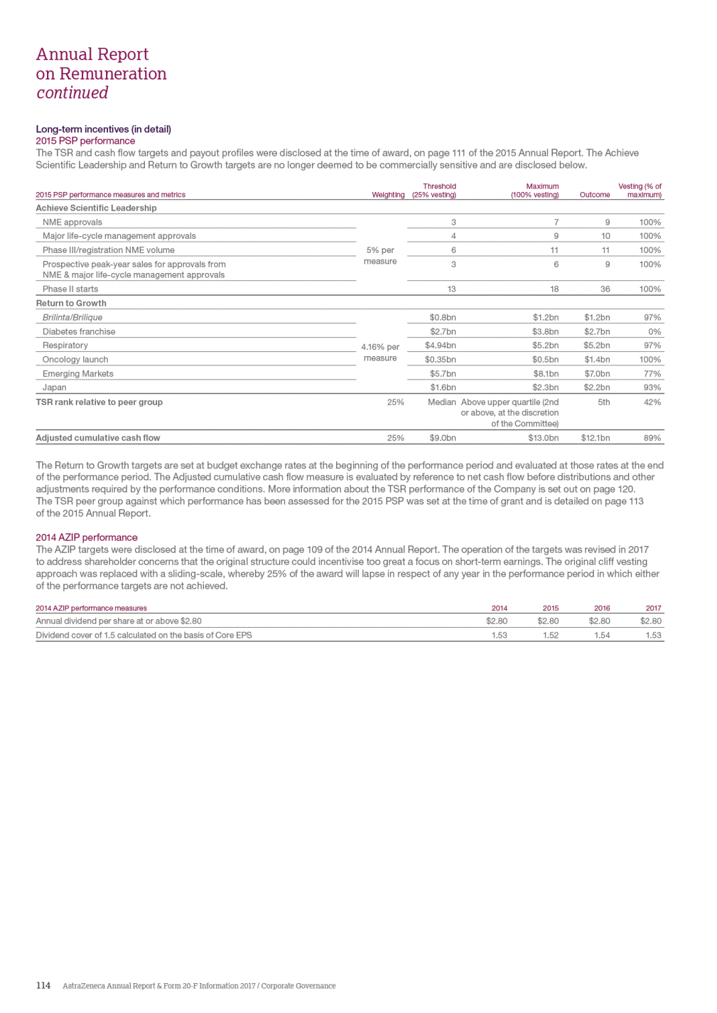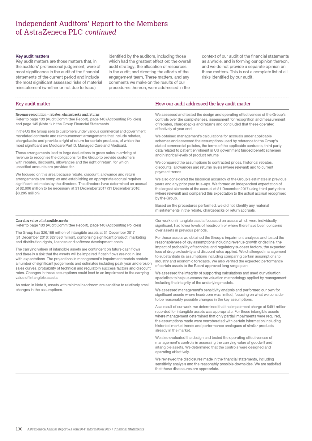 Strategic Report AstraZeneca at a glance 2 Chairman’s Statement 4 Chief Executive Officer’s Review 5 Marketplace 8 Business model and life-cycle of a medicine 14 Strategy and Key Performance Indicators 17 Business Review 22 Therapy Area Review 46 Contents > > Oncology 48 Cardiovascular & Metabolic Diseases 52 Respiratory 56 Other Disease Areas 60 > > Risk Overview 63 Financial Review 66 Financial highlights Total Revenue* down 2% to $22,465 million at actual rate of exchange (down 2% at CER), comprising Product Sales of $20,152 million and Externalisation Revenue of $2,313 million Net cash flow from operating activities down 14% at actual rate of exchange to $3,578 million Corporate Governance Chairman’s Introduction 86 Corporate Governance Overview 87 Board of Directors 88 Senior Executive Team 90 Corporate Governance Report 92 Audit Committee Report 100 Directors’ Remuneration Report 105 $22.5bn $3.6bn Reported operating profit down 25% at actual rate of exchange to $3,677 million (down 28% at CER) Core operating profit up 2% at actual rate of exchange to $6,855 million (unchanged at CER) $3.7bn $6.9bn Financial Statements Auditors’ Report 129 Consolidated Statements 135 Group Accounting Policies 139 Notes to the Group Financial Statements 145 Group Subsidiaries and Holdings 190 Company Statements 194 Company Accounting Policies 196 Notes to the Company Financial Statements 197 Group Financial Record 199 Reported EPS for the full year down 14% at actual rate of exchange to $2.37 (down 15% at CER) Core EPS for the full year down 1% at actual rate of exchange to $4.28 (down 2% at CER) $2.37 $4.28 Financial Review from page 66. * As detailed on page 140, Total Revenue consists of Product Sales and Externalisation Revenue. Additional Information Development Pipeline 202 Patent Expiries of Key Marketed Products 208 Risk 210 Geographical Review 221 Sustainability: supplementary information 227 Shareholder Information 228 Trade Marks 234 Glossary 235 Index 239 For more information within this Annual Report For more information see www.astrazeneca.com This Annual Report is also available on our website, www.astrazeneca.com/annualreport2017 1 AstraZeneca Annual Report & Form 20-F Information 2017 / Contents Strategic Report Corporate Governance Financial Statements Additional Information 2017 $2.37 2016 $2.77 2015 $2.23 2017 $4.28 2016 $4.31 2015 $4.26 2017 $3,677m 2016 $4,902m 2015 $4,114m 2017 $6,855m 2016 $6,721m 2015 $6,902m 2017 $3,578m 2016 $4,145m 2015 $3,324m 2017 $22,465m 2016 $23,002m 2015 $24,708m