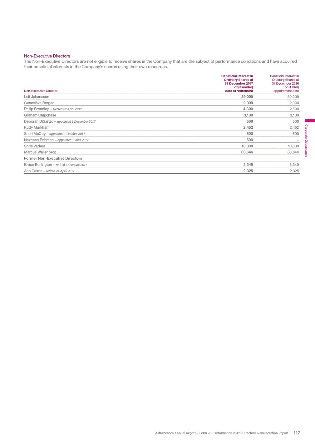 Corporate Governance Report continued Although it has not set any objectives applying specifically to the composition of the Board within a formal policy, the Board intends to continue with its current approach to diversity in all its aspects, while at the same time seeking Board members of the highest calibre, and with the necessary experience and skills to meet the needs of the Company and its shareholders. Rather than adopting quotas or other similar objectives, the Board prefers to adopt a more flexible approach focused on appointing on merit while having due regard to the benefits that can be gained from diversity. This approach has yielded successful results – women make up 42% of the Board, which comfortably exceeds the target of 33% set out in the report from Lord Davies published in October 2015. Information about our approach to diversity in the organisation below Board level can be found in Employees from page 35. However, the Board believes that he has brought, and continues to bring, considerable business experience and makes a valuable contribution to the work of the Board. In April 2010, he was appointed as a member of the Science Committee, reflecting his interest in innovation and R&D, knowledge of the history of the Company and its scientific heritage and culture, and his broad experience of other industries and businesses in which innovation and R&D are important determinants of success. On occasions when a Director is unavoidably absent from a Board or Board Committee meeting, for example where a meeting clashes with their other commitments, they still receive and review the papers for the meeting and typically provide verbal or written input ahead of the meeting, usually through the Chairman of the Board or the Chairman of the relevant Board Committee, so that their views are made known and considered at the meeting. Given the nature of the business to be conducted, some Board meetings are convened at short notice, which can make it difficult for some Directors to attend due to prior commitments. Conflicts of interest The Articles enable the Directors to authorise any situation in which a Director has an interest that conflicts or has the potential to conflict with the Company’s interests and which would otherwise be a breach of the Director’s duty, under Section 175 of the Companies Act 2006. The Board has a formal system in place for Directors to declare such situations to be considered for authorisation by those Directors who have no interest in the matter being considered. In deciding whether to authorise a situation, the non-conflicted Directors must act in the way they consider, in good faith, would be most likely to promote the success of the Company, and they may impose limits or conditions when giving the authorisation, or subsequently, if they think this is appropriate. Situations considered by the Board and authorisations given are recorded in the Board minutes and in a register of conflicts maintained by the Company Secretary, and are reviewed annually by the Board. The Board believes that this system operates effectively. Information and support The Company Secretary is responsible to the Chairman for ensuring that all Board and Board Committee meetings are properly conducted, that the Directors receive appropriate information prior to meetings to enable them to make an effective contribution, and that governance requirements are considered and implemented. Independence of the Non-Executive Directors During 2017, the Board considered the independence of each Non-Executive Director for the purposes of the UK Corporate Governance Code and the corporate governance listing standards of the NYSE (Listing Standards). With the exception of Marcus Wallenberg, the Board considers that all of the Non-Executive Directors are independent. The Board noted that, as of September 2017, Rudy Markham had served on the Board for nine years but determined that he remains independent in character and judgement, as evidenced by the way in which he discharges his duties as a Board and Board Committee member, and as senior independent Non-Executive Director. The Company maintained Directors’ and Officers’ Liability Insurance cover throughout 2017. The Directors are also able to obtain independent legal advice at the expense of the Company, as necessary, in their capacity as Directors. The Company has entered into a deed of indemnity in favour of each Board member since 2006. These deeds of indemnity are still in force and provide that the Company shall indemnify the Directors to the fullest extent permitted by law and the Articles, in respect of all losses arising out of, or in connection with, the execution of their powers, duties and responsibilities as Directors of the Company or any of its subsidiaries. This is in line with current market practice and helps us attract and retain high quality, skilled Directors. Time commitment Our expectation is that Non-Executive Directors should be prepared to commit 15 days a year, as an absolute minimum, to the Group’s business. In practice, Board members’ time commitment exceeds this minimum expectation when all the work that they undertake for the Group is considered, particularly in the case of the Chairman of the Board and the Chairmen of the Board Committees. As well as their work in relation to formal Board and Board Committee meetings, the Non-Executive Directors also commit time throughout the year to meetings and telephone calls with various levels of executive management, visits to AstraZeneca’s sites throughout the world and, for new Non-Executive Directors, induction sessions and site visits. Leif Johansson was considered by the Board to be independent upon his appointment as Chairman. In accordance with the UK Corporate Governance Code, the test of independence is not appropriate in relation to the Chairman after his appointment. Re-election of Directors In accordance with Article 66 of the Articles, all Dir
