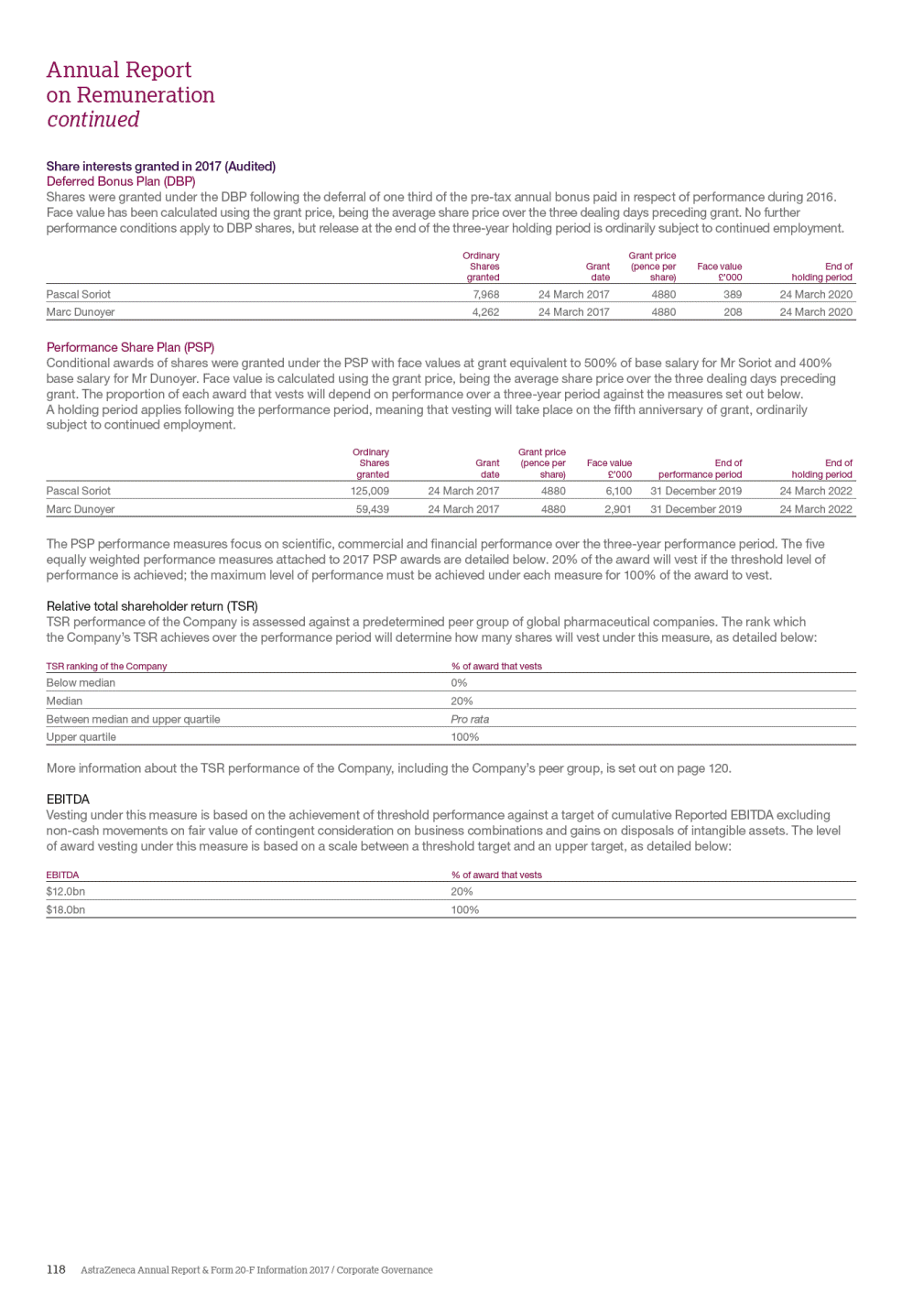 Notes to the Group Financial Statements continued 27 Employee costs and share plans for employees continued Bonus plans The AstraZeneca UK Performance Bonus Plan Employees of participating AstraZeneca UK companies are invited to participate in this bonus plan, which rewards strong individual performance. Bonuses are paid in cash. The AstraZeneca Executive Annual Bonus Scheme This scheme is a performance bonus scheme for Directors and senior employees who do not participate in the AstraZeneca UK Performance Bonus Plan. Annual bonuses are paid in cash and reflect both corporate and individual performance measures. The Remuneration Committee has discretion to reduce or withhold bonuses if business performance falls sufficiently short of expectations in any year such as to make the payment of bonuses inappropriate. The AstraZeneca Deferred Bonus Plan This plan was introduced in 2006 and is used to defer a portion of the bonus earned under the AstraZeneca Executive Annual Bonus Scheme into Ordinary Shares in the Company for a period of three years. The plan currently operates only in respect of Executive Directors and members of the SET. Awards of shares under this plan are typically made in March each year, the first award having been made in February 2006. Sweden In Sweden, an all-employee performance bonus plan is in operation, which rewards strong individual performance. Bonuses are paid 50% into a fund investing in AstraZeneca equities and 50% in cash. The AstraZeneca Executive Annual Bonus Scheme, the AstraZeneca Performance Share Plan and the AstraZeneca Global Restricted Stock Plan all operate in respect of relevant AstraZeneca employees in Sweden. US In the US, there are two all-employee short-term or annual performance bonus plans in operation to differentiate and reward strong individual performance. Annual bonuses are paid in cash. There is also one senior staff long-term incentive scheme, under which 129 participants may be eligible for awards granted as AstraZeneca ADSs. AstraZeneca ADSs necessary to satisfy the awards are purchased in the market or funded via a share trust. The AstraZeneca Performance Share Plan and the AstraZeneca Global Restricted Stock Plan operate in respect of relevant employees in the US. Share plans The charge for share-based payments in respect of share plans is $220m (2016: $241m; 2015: $211m). The plans are equity settled. The AstraZeneca UK All-Employee Share Plan The Company offers UK employees the opportunity to buy Partnership Shares (Ordinary Shares). Employees may invest up to £1,800 over a 12-month accumulation period and purchase Partnership Shares in the Company with the total proceeds at the end of the period. The purchase price for the shares is the lower of the price at the beginning or the end of the 12-month period. In 2010, the Company introduced a Matching Share element, the first award of which was made in 2011. Currently one Matching Share is awarded for every four Partnership Shares purchased. Partnership Shares and Matching Shares are held in the HM Revenue & Customs (HMRC)-approved All-Employee Share Plan. At the Company’s AGM in 2002, shareholders approved the issue of new shares for the purposes of the All-Employee Share Plan. The AstraZeneca 2014 Performance Share Plan (PSP) This plan was approved by shareholders in 2014 for a period of 10 years and replaces the AstraZeneca Performance Share Plan. Generally, awards can be granted at any time, but not during a closed period of the Company. The first grant of awards was made in May 2014. Awards granted under the plan vest after three years, or in the case of Executive Directors and members of the SET, after an additional two-year holding period, and can be subject to the achievement of performance conditions. For awards granted to all participants in 2017, vesting is subject to a combination of measures focused on scientific leadership, revenue growth and financial performance. The Remuneration Committee has responsibility for agreeing any awards under the plan and for setting the policy for the way in which the plan should be operated, including agreeing performance targets and which employees should be invited to participate. The main grant of awards in 2017 under the plan took place in March with further grants in May and August. Shares WAFV1 WAFV1 ’000 pence $ Shares awarded in March 2015 2,223 2381 35.29 Shares awarded in June 2015 36 2087 33.05 Shares awarded in August 2015 152 2123 33.21 Shares awarded in September 2015 8 n/a 32.32 Shares awarded in November 2015 7 2178 33.31 Shares awarded in March 2016 2,673 1962 28.19 Shares awarded in May 2016 24 1935 28.64 Shares awarded in August 2016 67 2536 33.58 Shares awarded in March 2017 2,359 2440 30.88 Shares awarded in May 2017 10 2607 34.20 Shares awarded in August 2017 44 2234 29.11 1 Weighted average fair value. 180 AstraZeneca Annual Report & Form 20-F Information 2017 / Financial Statements