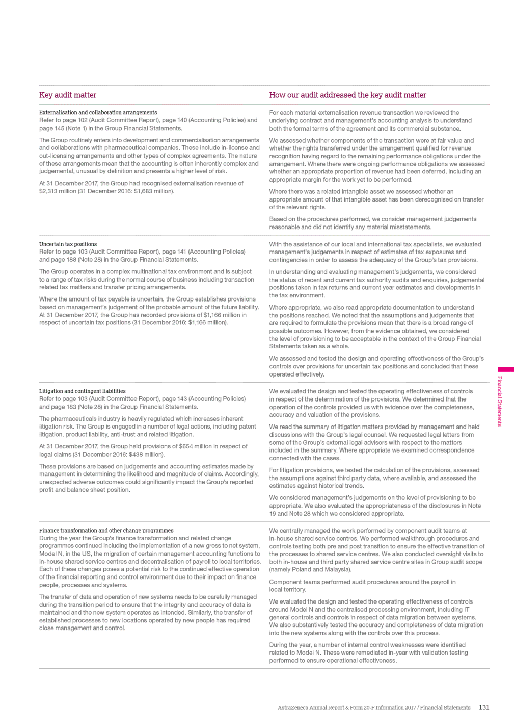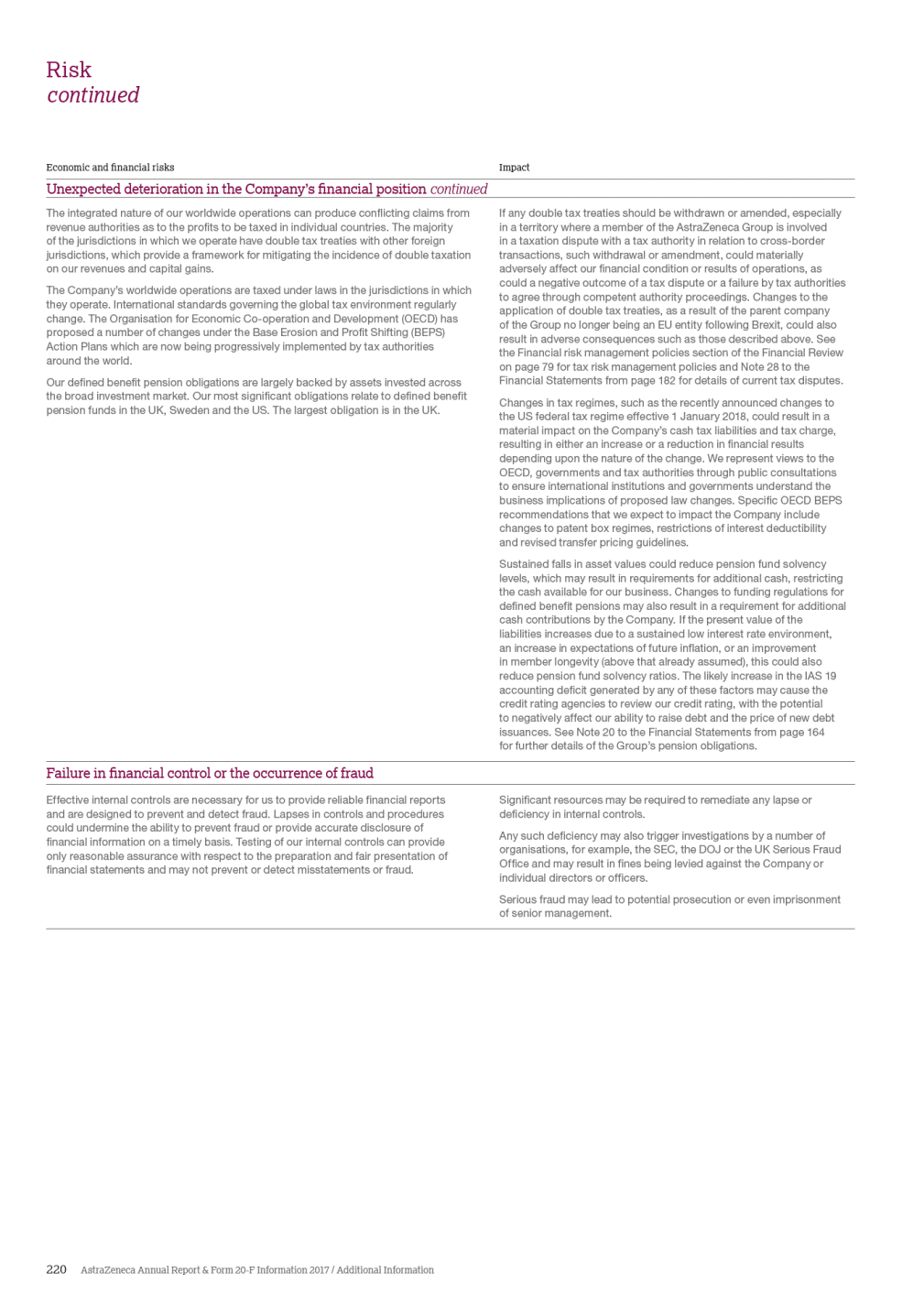 Risk continued Economic and financial risks Impact Unexpected deterioration in the Company’s financial position continued The integrated nature of our worldwide operations can produce conflicting claims from revenue authorities as to the profits to be taxed in individual countries. The majority of the jurisdictions in which we operate have double tax treaties with other foreign jurisdictions, which provide a framework for mitigating the incidence of double taxation on our revenues and capital gains. The Company’s worldwide operations are taxed under laws in the jurisdictions in which they operate. International standards governing the global tax environment regularly change. The Organisation for Economic Co-operation and Development (OECD) has proposed a number of changes under the Base Erosion and Profit Shifting (BEPS) Action Plans which are now being progressively implemented by tax authorities around the world. Our defined benefit pension obligations are largely backed by assets invested across the broad investment market. Our most significant obligations relate to defined benefit pension funds in the UK, Sweden and the US. The largest obligation is in the UK. If any double tax treaties should be withdrawn or amended, especially in a territory where a member of the AstraZeneca Group is involved in a taxation dispute with a tax authority in relation to cross-border transactions, such withdrawal or amendment, could materially adversely affect our financial condition or results of operations, as could a negative outcome of a tax dispute or a failure by tax authorities to agree through competent authority proceedings. Changes to the application of double tax treaties, as a result of the parent company of the Group no longer being an EU entity following Brexit, could also result in adverse consequences such as those described above. See the Financial risk management policies section of the Financial Review on page 79 for tax risk management policies and Note 28 to the Financial Statements from page 182 for details of current tax disputes. Changes in tax regimes, such as the recently announced changes to the US federal tax regime effective 1 January 2018, could result in a material impact on the Company’s cash tax liabilities and tax charge, resulting in either an increase or a reduction in financial results depending upon the nature of the change. We represent views to the OECD, governments and tax authorities through public consultations to ensure international institutions and governments understand the business implications of proposed law changes. Specific OECD BEPS recommendations that we expect to impact the Company include changes to patent box regimes, restrictions of interest deductibility and revised transfer pricing guidelines. Sustained falls in asset values could reduce pension fund solvency levels, which may result in requirements for additional cash, restricting the cash available for our business. Changes to funding regulations for defined benefit pensions may also result in a requirement for additional cash contributions by the Company. If the present value of the liabilities increases due to a sustained low interest rate environment, an increase in expectations of future inflation, or an improvement in member longevity (above that already assumed), this could also reduce pension fund solvency ratios. The likely increase in the IAS 19 accounting deficit generated by any of these factors may cause the credit rating agencies to review our credit rating, with the potential to negatively affect our ability to raise debt and the price of new debt issuances. See Note 20 to the Financial Statements from page 164 for further details of the Group’s pension obligations. Failure in financial control or the occurrence of fraud Effective internal controls are necessary for us to provide reliable financial reports and are designed to prevent and detect fraud. Lapses in controls and procedures could undermine the ability to prevent fraud or provide accurate disclosure of financial information on a timely basis. Testing of our internal controls can provide only reasonable assurance with respect to the preparation and fair presentation of financial statements and may not prevent or detect misstatements or fraud. Significant resources may be required to remediate any lapse or deficiency in internal controls. Any such deficiency may also trigger investigations by a number of organisations, for example, the SEC, the DOJ or the UK Serious Fraud Office and may result in fines being levied against the Company or individual directors or officers. Serious fraud may lead to potential prosecution or even imprisonment of senior management. 220 AstraZeneca Annual Report & Form 20-F Information 2017 / Additional Information