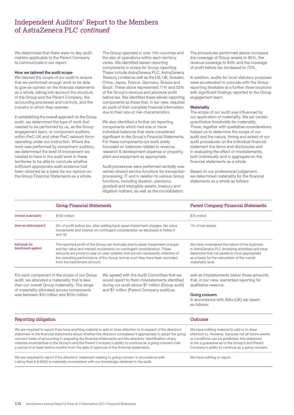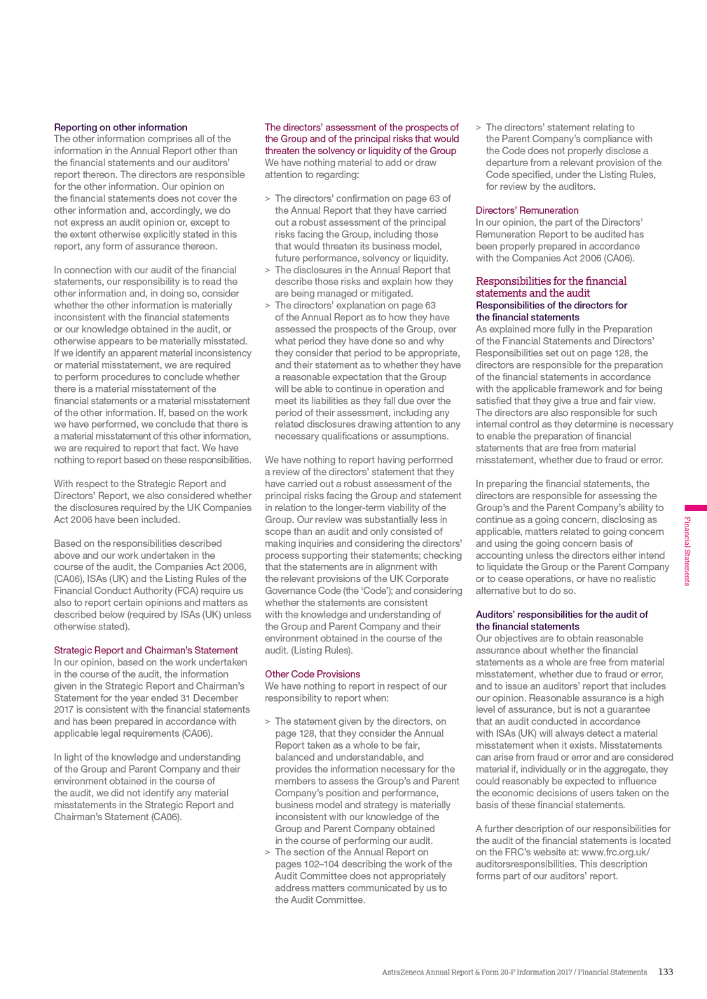 The financial position of the Group, its cash flows, liquidity position and borrowing facilities are described in the Financial Review from page 66. In addition, Note 26 to the Financial Statements from page 175 includes the Group’s objectives, policies and processes for managing capital; financial risk management objectives; details of its financial instruments and hedging activities; and its exposures to credit, market and liquidity risk. Further details of the Group’s cash balances and borrowings are included in Notes 16 and 17 to the Financial Statements from page 160. > make donations to political parties or independent election candidates > make donations to political organisations other than political parties > incur political expenditure, up to an aggregate limit of $250,000. External auditor A resolution will be proposed at the AGM on 18 May 2018 for the re-appointment of PricewaterhouseCoopers LLP (PwC) as auditor of the Company. PwC was first appointed as auditor of the Company in 2017, in succession to KPMG LLP. During 2017, KPMG and PwC undertook various non-audit services. More information about this work and the audit and non-audit fees that we have paid are set out in Note 30 to the Financial Statements on page 189. The external auditor is not engaged by AstraZeneca to carry out any non-audit work in respect of which it might, in the future, be required to express an audit opinion. As explained more fully in the Audit Committee Report from page 100, the Audit Committee has established pre-approval policies and procedures for audit and non-audit work permitted to be carried out by the external auditor and has carefully monitored the objectivity and independence of the external auditor throughout 2017. Corporate political contributions in the US are permitted in defined circumstances under the First Amendment of the US Constitution and are subject to both federal and state laws and regulations. In 2017, the Group’s US legal entities made contributions amounting in aggregate to $1,282,250 (2016: $1,568,250) to national political organisations, state-level political party committees and to campaign committees of various state candidates. No corporate donations were made at the federal level and all contributions were made only where allowed by US federal and state law. We publicly disclose details of our corporate US political contributions, which can be found on our website, www.astrazeneca-us.com/ sustainability/corporate-transparency. The annual corporate contributions budget is reviewed and approved by the US Vice-President, Corporate Affairs and the President of our US business to ensure robust governance and oversight. US citizens or individuals holding valid green cards exercised decision making over the contributions and the funds were not provided or reimbursed by any non-US legal entity. Such contributions do not constitute political donations or political expenditure for the purposes of the Companies Act 2006 and were made without any involvement of persons or entities outside the US. Having assessed the principal risks and other matters considered in connection with the viability statement on page 63, the Directors consider it appropriate to adopt the going concern basis of accounting in preparing the Annual Report and Financial Statements. Changes in share capital Changes in the Company’s Ordinary Share capital during 2017, including details of the allotment of new shares under the Company’s share plans, are given in Note 22 to the Financial Statements on page 171. Directors’ Report The Directors’ Report, which has been prepared in accordance with the requirements of the Companies Act 2006, comprises the following sections: Directors’ shareholdings The Articles require each Director to be the beneficial owner of Ordinary Shares in the Company with an aggregate nominal value of $125 (which currently represents at least 500 shares because each Ordinary Share has a nominal value of $0.25). Such holding must be obtained within two months of the date of the Director’s appointment. At 31 December 2017, all of the Directors complied with this requirement and full details of each Director’s interests in shares of the Company are set out in Directors’ interests in shares on pages 116 and 117, along with information about the shareholding expectations of the Remuneration Committee (in respect of Executive Directors and SET members) and the Board (in respect of Non-Executive Directors). > Chairman’s Statement > Chief Executive Officer’s Review > Business Review > Therapy Area Review > Financial Review: Financial risk management > Corporate Governance: including the Audit Committee Report and Corporate Governance Report > Directors’ Responsibility Statement > Development Pipeline > Sustainability: supplementary information > Shareholder Information Significant agreements There are no significant agreements to which the Company is a party that take effect, alter or terminate on a change of control of the Company following a takeover bid. There are no persons with whom we have contractual or other arrangements, who are deemed by the Directors to be essential to our business. and has been approved by the Board and signed on its behalf. Political donations Neither the Company nor its subsidiaries made any EU political donations or incurred any EU political expenditure in 2017 and they do not intend to do so in the future in respect of which shareholder authority is required, or for which disclosure in this Annual Report is required, under the Companies Act 2006. However, to enable the Company and its subsidiaries to continue to support interest groups or lobbying organisations concerned with the review of government policy or law reform without inadvertently breaching the Companies Act 2006, which defines political donations and other political expenditure in broad terms, a resolution will be put to shareholders at the 2018 AGM, similar to that passed