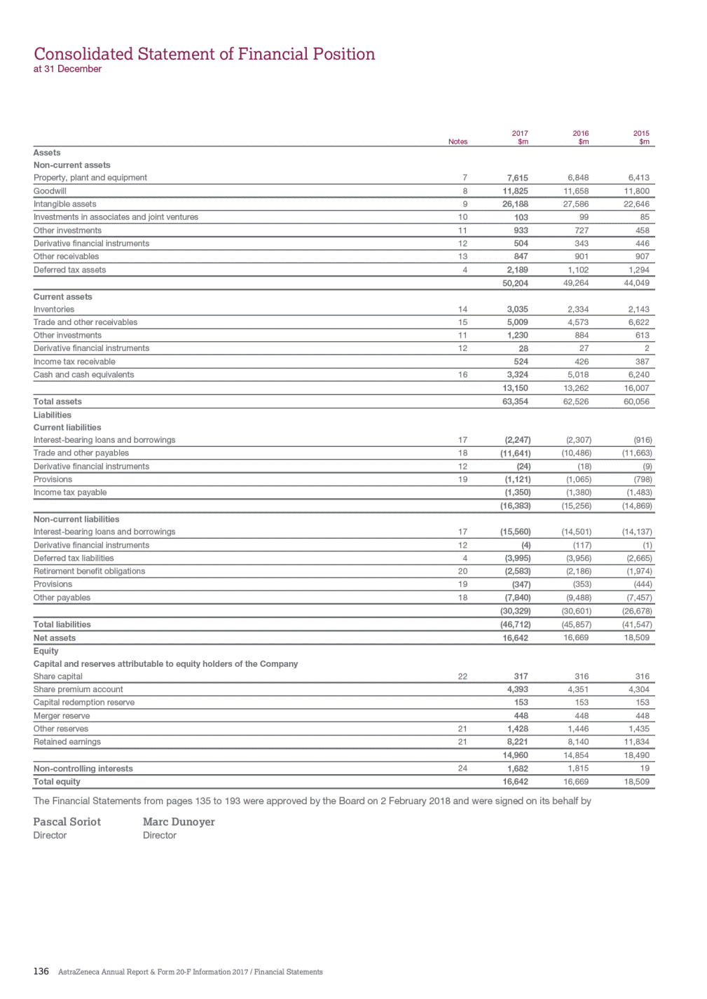 Group Financial Record 2013 2014 2015 2016 2017 For the year ended 31 December $m $m $m $m $m Revenue and profits Product Sales 25,711 26,095 23,641 21,319 20,152 Externalisation Revenue 95 452 1,067 1,683 2,313 Cost of sales (5,261) (5,842) (4,646) (4,126) (4,318) Distribution costs (306) (324) (339) (326) (310) Research and development expense (4,821) (5,579) (5,997) (5,890) (5,757) Selling, general and administrative costs (12,206) (13,000) (11,112) (9,413) (10,233) Other operating income and expense 500 335 1,500 1,655 1,830 Operating profit 3,712 2,137 4,114 4,902 3,677 Finance income 50 78 46 67 113 Finance expense (495) (963) (1,075) (1,384) (1,508) Share of after tax losses in associates and joint ventures – (6) (16) (33) (55) Profit before tax 3,267 1,246 3,069 3,552 2,227 Taxation (696) (11) (243) (146) 641 Profit for the period 2,571 1,235 2,826 3,406 2,868 Other comprehensive income for the period, net of tax (113) (1,506) (338) (1,778) 639 Total comprehensive income for the period 2,458 (271) 2,488 1,628 3,507 Profit attributable to: Owners of the Parent 2,556 1,233 2,825 3,499 3,001 Non-controlling interests 15 2 1 (93) (133) Earnings per share Basic earnings per $0.25 Ordinary Share $2.04 $0.98 $2.23 $2.77 $2.37 Diluted earnings per $0.25 Ordinary Share $2.04 $0.98 $2.23 $2.76 $2.37 Dividends $2.80 $2.80 $2.80 $2.80 $2.80 Return on revenues Operating profit as a percentage of Total Revenue 14.4% 8% 16.7% 21.3% 16.4% Ratio of earnings to fixed charges 9.9 6.1 11.3 8.9 6.3 2013 2014 2015 2016 2017 At 31 December $m $m $m $m $m Statement of Financial Position Property, plant and equipment, goodwill and intangible assets 31,846 38,541 40,859 46,092 45,628 Other investments and non-current receivables 2,513 2,138 1,896 2,070 2,387 Deferred tax assets 1,205 1,219 1,294 1,102 2,189 Current assets 20,335 16,697 16,007 13,262 13,150 Total assets 55,899 58,595 60,056 62,526 63,354 Current liabilities (16,051) (17,330) (14,869) (15,256) (16,383) Deferred tax liabilities (2,827) (1,796) (2,665) (3,956) (3,995) Other non-current liabilities (13,768) (19,823) (24,013) (26,645) (26,334) Net assets 23,253 19,646 18,509 16,669 16,642 Share capital 315 316 316 316 317 Reserves attributable to equity holders of the Company 22,909 19,311 18,174 14,538 14,643 Non-controlling interests 29 19 19 1,815 1,682 Total equity and reserves 23,253 19,646 18,509 16,669 16,642 2013 2014 2015 2016 2017 For the year ended 31 December $m $m $m $m $m Cash flows Net cash inflow/(outflow) from: Operating activities 7,400 7,058 3,324 4,145 3,578 Investing activities (2,889) (7,032) (4,239) (3,969) (2,328) Financing activities (3,047) (2,705) 878 (1,324) (2,936) 1,464 (2,679) (37) (1,148) (1,686) For the purpose of computing the ratio of earnings to fixed charges, earnings consist of the income from continuing ordinary activities before taxation of Group companies and income received from companies owned 50% or less, plus fixed charges. Fixed charges consist of interest on all indebtedness, amortisation of debt discount and expense, and that portion of rental expense representative of the interest factor. AstraZeneca Annual Report & Form 20-F Information 2017 / Group Financial Record 199 Financial Statements