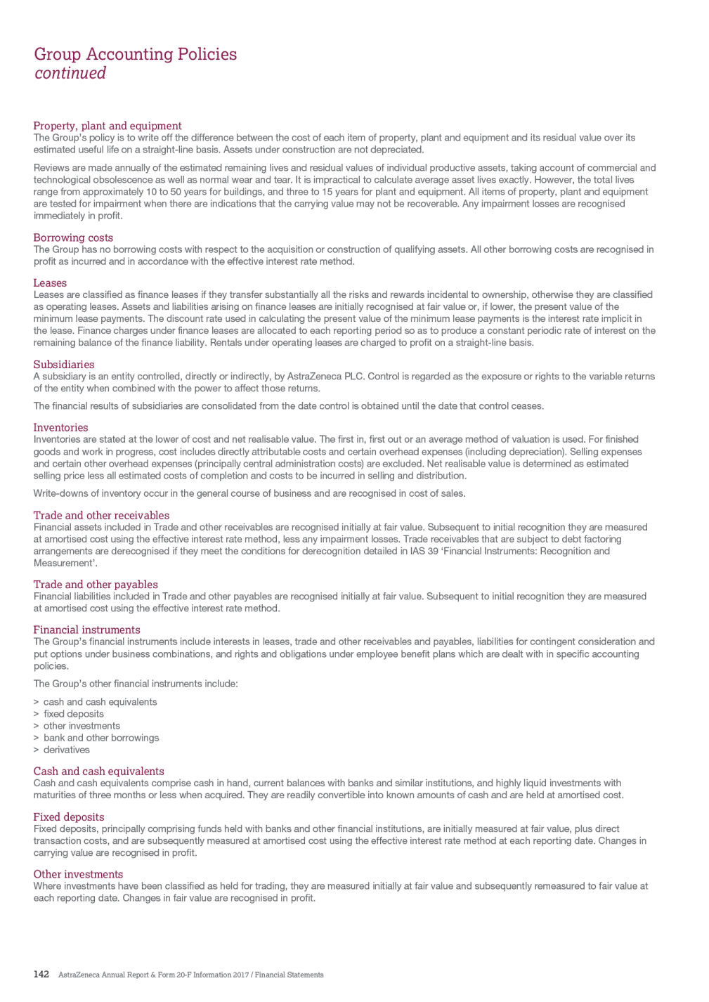 Group Accounting Policies continued Impairment The carrying values of non-financial assets, other than inventories and deferred tax assets, are reviewed at least annually to determine whether there is any indication of impairment. For goodwill, intangible assets under development and for any other assets where such indication exists, the asset’s recoverable amount is estimated based on the greater of its value in use and its fair value less cost to sell. In assessing the recoverable amount, the estimated future cash flows, adjusted for the risks specific to each asset, are discounted to their present value using a discount rate that reflects current market assessments of the time value of money, the general risks affecting the pharmaceutical industry and other risks specific to each asset. For the purpose of impairment testing, assets are grouped together into the smallest group of assets that generates cash inflows from continuing use that are largely independent of the cash flows of other assets. Impairment losses are recognised immediately in profit. International accounting transition On transition to using adopted IFRSs in the year ended 31 December 2005, the Group took advantage of several optional exemptions available in IFRS 1 ‘First-time Adoption of International Financial Reporting Standards’. The major impacts which are of continuing importance are detailed below: ! Business combinations – IFRS 3 ‘Business Combinations’ has been applied from 1 January 2003, the date of transition, rather than being applied fully retrospectively. As a result, the combination of Astra and Zeneca is still accounted for as a merger, rather than through purchase accounting. If purchase accounting had been adopted, Zeneca would have been deemed to have acquired Astra. ! Cumulative exchange differences – the Group chose to set the cumulative exchange difference reserve at 1 January 2003 to nil. Applicable accounting standards and interpretations issued but not yet adopted IFRS 9 ‘Financial Instruments’ is effective for accounting periods beginning on or after 1 January 2018 and will replace existing accounting standards. It is applicable to financial assets and liabilities, and will introduce changes to existing accounting concerning classification and measurement, impairment (introducing an expected-loss method), hedge accounting, and on the treatment of gains arising from the impact of own credit risk on the measurement of liabilities held at fair value. The standard was endorsed by the EU on 22 November 2016. The Group early adopted the treatment of fair value changes arising from changes in own credit risk from 1 January 2017 and will adopt the remainder of the standard from 1 January 2018. The principal impact will be that equity investments currently classified as available for sale will be re-categorised on initial application and the Group will elect to record fair value movements on certain non-current equity investments in Other comprehensive income. Fair value movements on other equity investments will be recorded in profit. The other changes introduced will have an insignificant impact on the Group. In particular, given the general quality and short-term nature of our trade receivables, there will be no material impact on the introduction of an expected-loss impairment method and, following a review of our existing hedging arrangements, these have been assessed as compliant with the new rules. IFRS 15 ‘Revenue from Contracts with Customers’ is effective for accounting periods beginning on or after 1 January 2018 and will replace existing accounting standards. It provides enhanced detail on the principle of recognising revenue to reflect the transfer of goods and services to customers at a value which the Company expects to be entitled to receive. The standard also updates revenue disclosure requirements. The standard was endorsed by the EU on 22 September 2016. The Group will retrospectively apply the standard from 1 January 2018 recognising the cumulative effect of initially applying the standard as an adjustment to the opening balance of retained earnings. The standard will not have a material impact on our revenue streams from the supply of goods and associated rebates and returns provisions. The timing of the recognition of product sales and the basis for our estimates of sales deductions under IAS 18 are consistent with those to be adopted under IFRS 15. Our present accounting for externalisation transactions under IAS 18 includes an analysis of the performance obligations under the arrangement and upfront revenue recognition requires the transfer of substantive rights, for example a licence to use our intellectual property and an appropriate allocation of revenue to the remaining performance obligations. While the basis for such allocation is different in IFRS 15, the impact of the adoption of the new standard on our historical allocations is not material. The licences we grant are typically rights to use our intellectual property, which does not change during the period of the licence. Those licences are generally unique and therefore the basis of allocation of revenue to performance obligations makes use of the residual approach as permitted by IFRS 15. The related sales milestones and royalties to these licences qualify for the royalty exemption available under IFRS 15 and will continue to be recognised as the underlying sales are made. Furthermore, there is no material change to the assessment of whether the performance obligations are distinct from applying the new standard. IFRS 16 ‘Leases’ is effective for accounting periods beginning on or after 1 January 2019 and will replace IAS 17 ‘Leases’. It will eliminate the classification of leases as either operating leases or finance leases and, instead, introduce a single lessee accounting model. The standard was endorsed by the EU on 31 October 2017. The adoption of IFRS 16 will result in the Group r