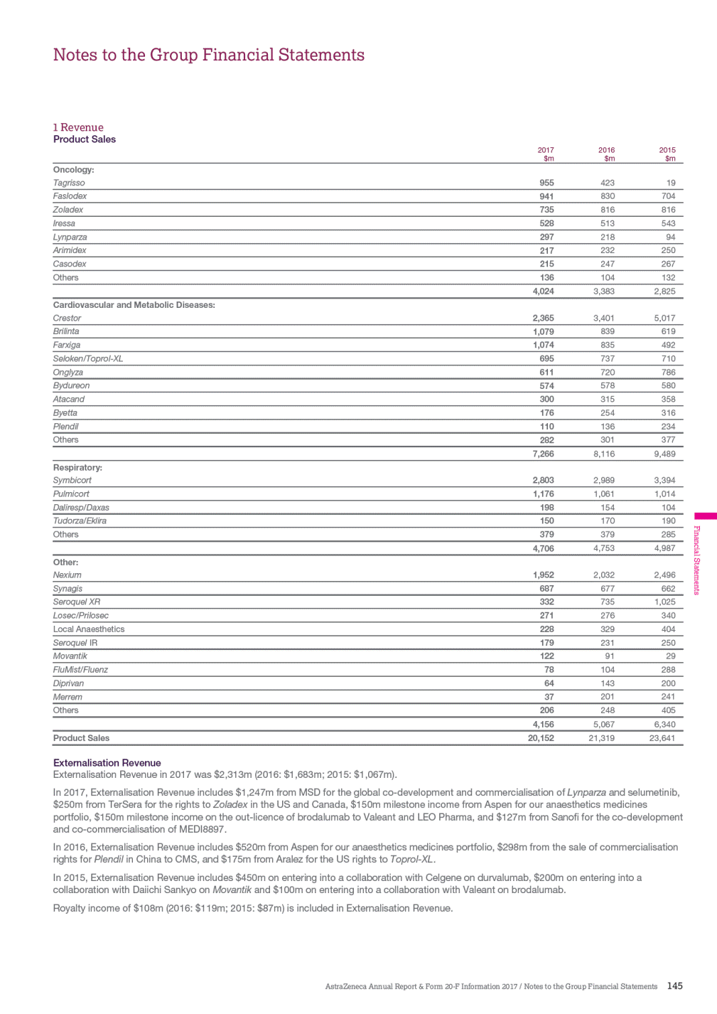Notes to the Group Financial Statements 1 Revenue Product Sales 2017 2016 2015 $m $m $m Oncology: Tagrisso 955 423 19 Faslodex 941 830 704 Zoladex 735 816 816 Iressa 528 513 543 Lynparza 297 218 94 Arimidex 217 232 250 Casodex 215 247 267 Others 136 104 132 4,024 3,383 2,825 Cardiovascular and Metabolic Diseases: Crestor 2,365 3,401 5,017 Brilinta 1,079 839 619 Farxiga 1,074 835 492 Seloken/Toprol-XL 695 737 710 Onglyza 720 786 611 Bydureon 574 578 580 Atacand 300 315 358 Byetta 176 254 316 Plendil 136 234 110 Others 282 301 377 7,266 8,116 9,489 Respiratory: Symbicort 2,803 2,989 3,394 Pulmicort 1,176 1,061 1,014 Daliresp/Daxas 198 154 104 Tudorza/Eklira 150 170 190 Others 379 379 285 4,706 4,753 4,987 Other: Nexium 1,952 2,032 2,496 Synagis 687 677 662 Seroquel XR 332 735 1,025 Losec/Prilosec 271 276 340 Local Anaesthetics 329 404 228 Seroquel IR 179 231 250 Movantik 122 91 29 FluMist/Fluenz 78 104 288 Diprivan 143 200 64 Merrem 37 201 241 Others 206 248 405 4,156 5,067 6,340 Product Sales 20,152 21,319 23,641 Externalisation Revenue Externalisation Revenue in 2017 was $2,313m (2016: $1,683m; 2015: $1,067m). In 2017, Externalisation Revenue includes $1,247m from MSD for the global co-development and commercialisation of Lynparza and selumetinib, $250m from TerSera for the rights to Zoladex in the US and Canada, $150m milestone income from Aspen for our anaesthetics medicines portfolio, $150m milestone income on the out-licence of brodalumab to Valeant and LEO Pharma, and $127m from Sanofi for the co-development and co-commercialisation of MEDI8897. In 2016, Externalisation Revenue includes $520m from Aspen for our anaesthetics medicines portfolio, $298m from the sale of commercialisation rights for Plendil in China to CMS, and $175m from Aralez for the US rights to Toprol-XL. In 2015, Externalisation Revenue includes $450m on entering into a collaboration with Celgene on durvalumab, $200m on entering into a collaboration with Daiichi Sankyo on Movantik and $100m on entering into a collaboration with Valeant on brodalumab. Royalty income of $108m (2016: $119m; 2015: $87m) is included in Externalisation Revenue. AstraZeneca Annual Report & Form 20-F Information 2017 / Notes to the Group Financial Statements 145 Financial Statements