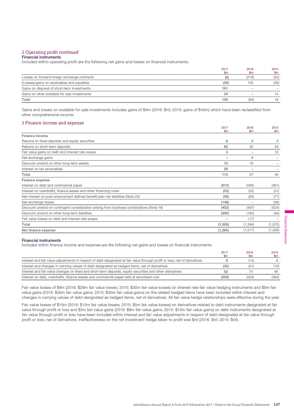 2 Operating prot continued Financial instruments Included within operating profit are the following net gains and losses on financial instruments: 2017 2016 2015 $m $m $m Losses on forward foreign exchange contracts (6) (216) (22) (Losses)/gains on receivables and payables (30) 132 (36) Gains on disposal of short-term investments 161 – – Gains on other available for sale investments 34 – 74 Total 159 (84) 16 Gains and losses on available for sale investments includes gains of $4m (2016: $nil; 2015: gains of $43m) which have been reclassified from other comprehensive income. 3 Finance income and expense 2017 2016 2015 $m $m $m Finance income Returns on fixed deposits and equity securities 8 8 8 Returns on short-term deposits 62 35 28 Fair value gains on debt and interest rate swaps – 10 4 Net exchange gains – 8 – Discount unwind on other long-term assets 10 16 – Interest on tax receivables 29 – – Total 113 67 46 Finance expense Interest on debt and commercial paper (612) (565) (361) Interest on overdrafts, finance leases and other financing costs (52) (52) (31) Net interest on post-employment defined benefit plan net liabilities (Note 20) (49) (63) (77) Net exchange losses (148) – (36) Discount unwind on contingent consideration arising from business combinations (Note 18) (402) (497) (524) Discount unwind on other long-term liabilities (245) (190) (46) Fair value losses on debt and interest rate swaps – (17) – Total (1,508) (1,384) (1,075) Net finance expense (1,395) (1,317) (1,029) Financial instruments Included within finance income and expense are the following net gains and losses on financial instruments: 2017 2016 2015 $m $m $m Interest and fair value adjustments in respect of debt designated at fair value through profit or loss, net of derivatives 8 (14) 6 Interest and changes in carrying values of debt designated as hedged items, net of derivatives (35) (21) (10) Interest and fair value changes on fixed and short-term deposits, equity securities and other derivatives 52 74 46 Interest on debt, overdrafts, finance leases and commercial paper held at amortised cost (559) (553) (384) Fair value losses of $9m (2016: $29m fair value losses; 2015: $30m fair value losses) on interest rate fair value hedging instruments and $9m fair value gains (2016: $30m fair value gains; 2015: $30m fair value gains) on the related hedged items have been included within interest and changes in carrying values of debt designated as hedged items, net of derivatives. All fair value hedge relationships were effective during the year. Fair value losses of $10m (2016: $12m fair value losses; 2015: $5m fair value losses) on derivatives related to debt instruments designated at fair value through profit or loss and $3m fair value gains (2016: $9m fair value gains; 2015: $15m fair value gains) on debt instruments designated at fair value through profit or loss have been included within interest and fair value adjustments in respect of debt designated at fair value through profit or loss, net of derivatives. Ineffectiveness on the net investment hedge taken to profit was $nil (2016: $nil; 2015: $nil). AstraZeneca Annual Report & Form 20-F Information 2017 / Notes to the Group Financial Statements 147 Financial Statements
