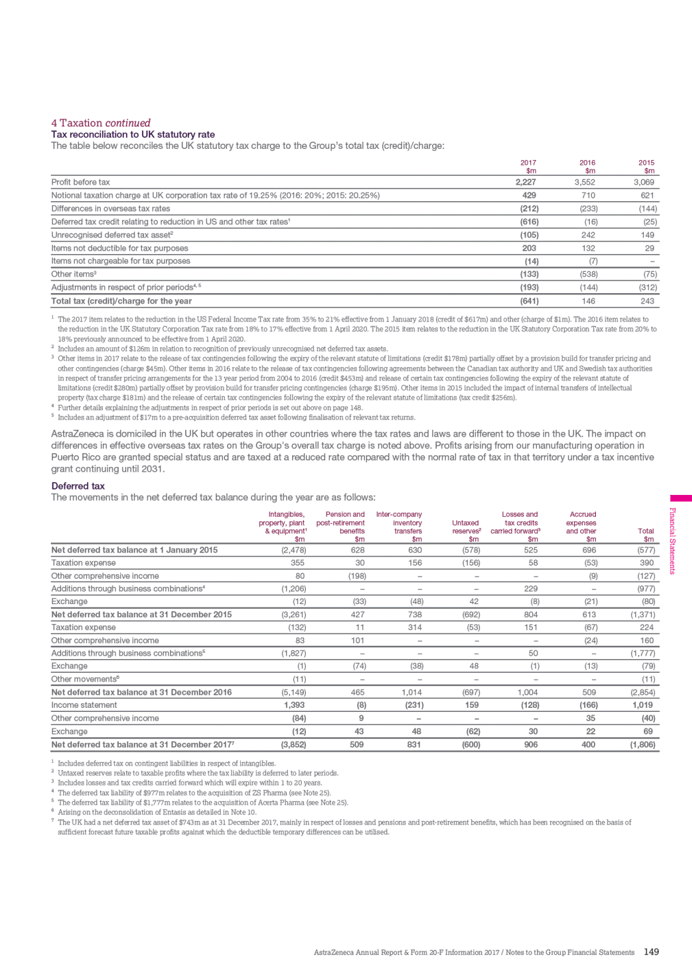 4 Taxation continued Tax reconciliation to UK statutory rate The table below reconciles the UK statutory tax charge to the Group’s total tax (credit)/charge: 2017 2016 2015 $m $m $m Profit before tax 2,227 3,552 3,069 Notional taxation charge at UK corporation tax rate of 19.25% (2016: 20%; 2015: 20.25%) 429 710 621 Differences in overseas tax rates (212) (233) (144) Deferred tax credit relating to reduction in US and other tax rates1 (616) (16) (25) Unrecognised deferred tax asset2 (105) 242 149 Items not deductible for tax purposes 203 132 29 Items not chargeable for tax purposes (14) (7) – Other items3 (538) (75) (133) Adjustments in respect of prior periods4, 5 (193) (144) (312) Total tax (credit)/charge for the year (641) 146 243 1 The 2017 item relates to the reduction in the US Federal Income Tax rate from 35% to 21% effective from 1 January 2018 (credit of $617m) and other (charge of $1m). The 2016 item relates to the reduction in the UK Statutory Corporation Tax rate from 18% to 17% effective from 1 April 2020. The 2015 item relates to the reduction in the UK Statutory Corporation Tax rate from 20% to 18% previously announced to be effective from 1 April 2020. 2 Includes an amount of $126m in relation to recognition of previously unrecognised net deferred tax assets. 3 Other items in 2017 relate to the release of tax contingencies following the expiry of the relevant statute of limitations (credit $178m) partially offset by a provision build for transfer pricing and other contingencies (charge $45m). Other items in 2016 relate to the release of tax contingencies following agreements between the Canadian tax authority and UK and Swedish tax authorities in respect of transfer pricing arrangements for the 13 year period from 2004 to 2016 (credit $453m) and release of certain tax contingencies following the expiry of the relevant statute of limitations (credit $280m) partially offset by provision build for transfer pricing contingencies (charge $195m). Other items in 2015 included the impact of internal transfers of intellectual property (tax charge $181m) and the release of certain tax contingencies following the expiry of the relevant statute of limitations (tax credit $256m). 4 Further details explaining the adjustments in respect of prior periods is set out above on page 148. 5 Includes an adjustment of $17m to a pre-acquisition deferred tax asset following finalisation of relevant tax returns. AstraZeneca is domiciled in the UK but operates in other countries where the tax rates and laws are different to those in the UK. The impact on differences in effective overseas tax rates on the Group's overall tax charge is noted above. Profits arising from our manufacturing operation in Puerto Rico are granted special status and are taxed at a reduced rate compared with the normal rate of tax in that territory under a tax incentive grant continuing until 2031. Deferred tax The movements in the net deferred tax balance during the year are as follows: Intangibles, property, plant & equipment1 Pension and post-retirement benefits Inter-company inventory transfers Losses and Untaxed tax credits reserves2 carried forward3 Accrued expenses and other Total $m $m $m $m $m $m $m Net deferred tax balance at 1 January 2015 (2,478) 628 630 (578) 525 696 (577) Taxation expense 355 30 156 (156) 58 (53) 390 Other comprehensive income 80 (198) – – – (9) (127) Additions through business combinations4 (1,206) – – – 229 – (977) Exchange (12) (33) (48) 42 (8) (21) (80) Net deferred tax balance at 31 December 2015 (3,261) 427 738 (692) 804 613 (1,371) Taxation expense (132) 11 314 (53) 151 (67) 224 Other comprehensive income 83 101 – – – (24) 160 Additions through business combinations5 (1,827) – – – 50 – (1,777) Exchange (1) (74) (38) 48 (1) (13) (79) Other movements6 (11) – – – – – (11) Net deferred tax balance at 31 December 2016 (5,149) 465 1,014 (697) 1,004 509 (2,854) Income statement 1,393 (8) (231) 159 (128) (166) 1,019 Other comprehensive income (84) 9 – – – 35 (40) Exchange (12) 43 48 (62) 30 22 69 Net deferred tax balance at 31 December 20177 (3,852) 509 831 (600) 906 400 (1,806) 1 Includes deferred tax on contingent liabilities in respect of intangibles. 2 Untaxed reserves relate to taxable profits where the tax liability is deferred to later periods. 3 Includes losses and tax credits carried forward which will expire within 1 to 20 years. 4 The deferred tax liability of $977m relates to the acquisition of ZS Pharma (see Note 25). 5 The deferred tax liability of $1,777m relates to the acquisition of Acerta Pharma (see Note 25). 6 Arising on the deconsolidation of Entasis as detailed in Note 10. 7 The UK had a net deferred tax asset of $743m as at 31 December 2017, mainly in respect of losses and pensions and post-retirement benefits, which has been recognised on the basis of sufficient forecast future taxable profits against which the deductible temporary differences can be utilised. AstraZeneca Annual Report & Form 20-F Information 2017 / Notes to the Group Financial Statements 149 Financial Statements