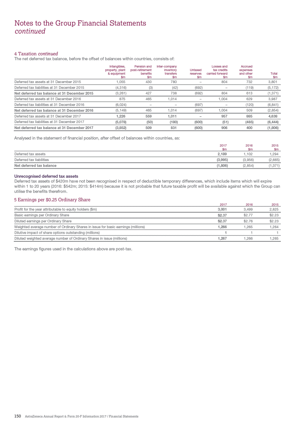 Notes to the Group Financial Statements continued 4 Taxation continued The net deferred tax balance, before the offset of balances within countries, consists of: Intangibles, property, plant & equipment Pension and post-retirement benefits Inter-company inventory transfers Losses and Untaxed tax credits reserves carried forward Accrued expenses and other Total $m $m $m $m $m $m $m Deferred tax assets at 31 December 2015 1,055 430 780 – 804 732 3,801 Deferred tax liabilities at 31 December 2015 (4,316) (3) (42) (692) – (119) (5,172) Net deferred tax balance at 31 December 2015 (3,261) 427 738 (692) 804 613 (1,371) Deferred tax assets at 31 December 2016 875 465 1,014 – 1,004 629 3,987 Deferred tax liabilities at 31 December 2016 (6,024) – – (697) – (120) (6,841) Net deferred tax balance at 31 December 2016 (5,149) 465 1,014 (697) 1,004 509 (2,854) Deferred tax assets at 31 December 2017 1,226 559 1,011 – 957 885 4,638 Deferred tax liabilities at 31 December 2017 (5,078) (50) (180) (600) (51) (485) (6,444) Net deferred tax balance at 31 December 2017 (3,852) 509 831 (600) 906 400 (1,806) Analysed in the statement of financial position, after offset of balances within countries, as: 2017 2016 2015 $m $m $m Deferred tax assets 2,189 1,102 1,294 Deferred tax liabilities (3,995) (3,956) (2,665) Net deferred tax balance (1,806) (2,854) (1,371) Unrecognised deferred tax assets Deferred tax assets of $420m have not been recognised in respect of deductible temporary differences, which include items which will expire within 1 to 20 years (2016: $542m; 2015: $414m) because it is not probable that future taxable profit will be available against which the Group can utilise the benefits therefrom. 5 Earnings per $0.25 Ordinary Share 2017 2016 2015 Profit for the year attributable to equity holders ($m) 3,001 3,499 2,825 Basic earnings per Ordinary Share $2.37 $2.77 $2.23 Diluted earnings per Ordinary Share $2.37 $2.76 $2.23 Weighted average number of Ordinary Shares in issue for basic earnings (millions) 1,266 1,265 1,264 Dilutive impact of share options outstanding (millions) 1 1 1 Diluted weighted average number of Ordinary Shares in issue (millions) 1,267 1,266 1,265 The earnings figures used in the calculations above are post-tax. 150 AstraZeneca Annual Report & Form 20-F Information 2017 / Financial Statements