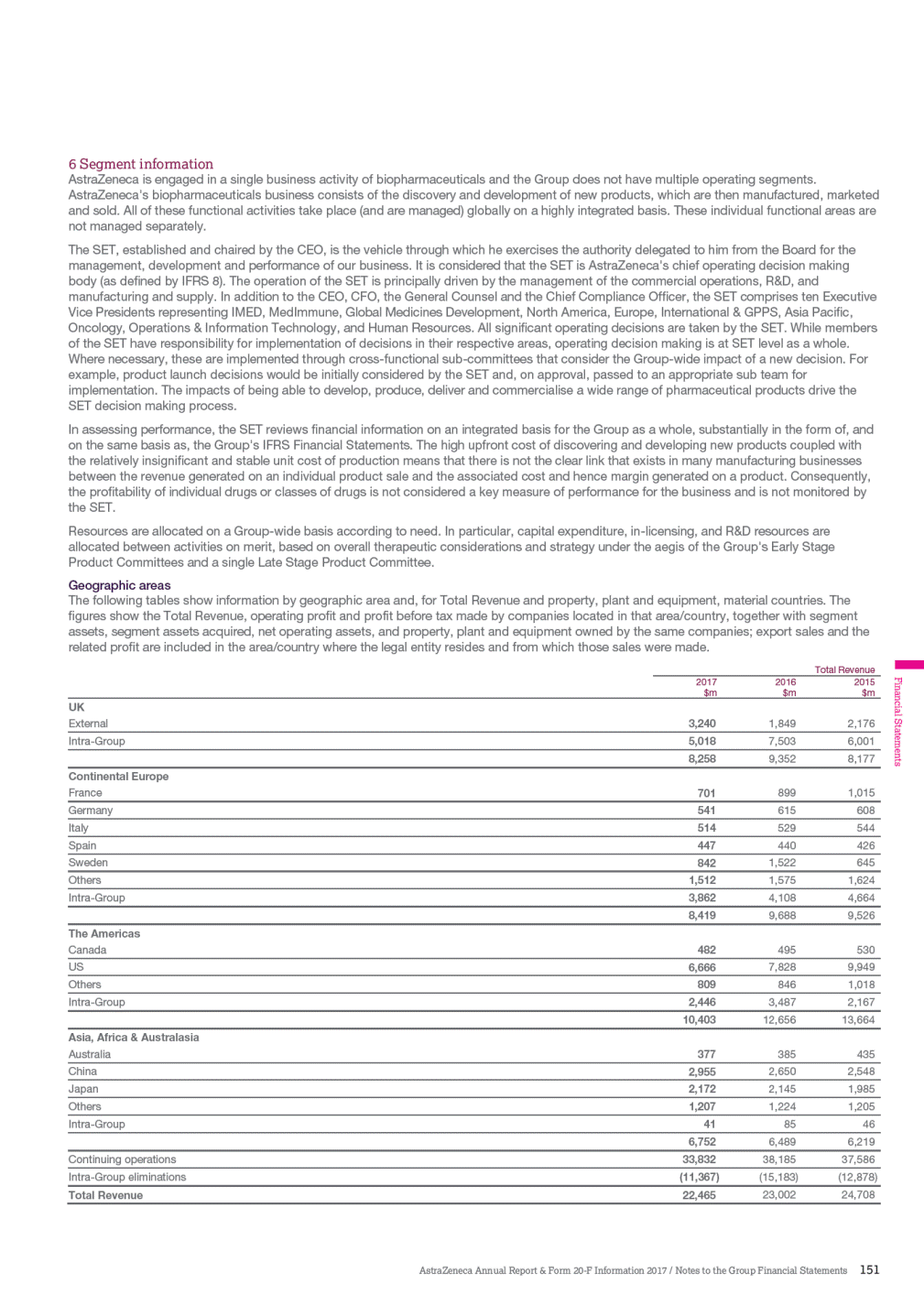 6 Segment information AstraZeneca is engaged in a single business activity of biopharmaceuticals and the Group does not have multiple operating segments. AstraZeneca's biopharmaceuticals business consists of the discovery and development of new products, which are then manufactured, marketed and sold. All of these functional activities take place (and are managed) globally on a highly integrated basis. These individual functional areas are not managed separately. The SET, established and chaired by the CEO, is the vehicle through which he exercises the authority delegated to him from the Board for the management, development and performance of our business. It is considered that the SET is AstraZeneca's chief operating decision making body (as defined by IFRS 8). The operation of the SET is principally driven by the management of the commercial operations, R&D, and manufacturing and supply. In addition to the CEO, CFO, the General Counsel and the Chief Compliance Officer, the SET comprises ten Executive Vice Presidents representing IMED, MedImmune, Global Medicines Development, North America, Europe, International & GPPS, Asia Pacific, Oncology, Operations & Information Technology, and Human Resources. All significant operating decisions are taken by the SET. While members of the SET have responsibility for implementation of decisions in their respective areas, operating decision making is at SET level as a whole. Where necessary, these are implemented through cross-functional sub-committees that consider the Group-wide impact of a new decision. For example, product launch decisions would be initially considered by the SET and, on approval, passed to an appropriate sub team for implementation. The impacts of being able to develop, produce, deliver and commercialise a wide range of pharmaceutical products drive the SET decision making process. In assessing performance, the SET reviews financial information on an integrated basis for the Group as a whole, substantially in the form of, and on the same basis as, the Group's IFRS Financial Statements. The high upfront cost of discovering and developing new products coupled with the relatively insignificant and stable unit cost of production means that there is not the clear link that exists in many manufacturing businesses between the revenue generated on an individual product sale and the associated cost and hence margin generated on a product. Consequently, the profitability of individual drugs or classes of drugs is not considered a key measure of performance for the business and is not monitored by the SET. Resources are allocated on a Group-wide basis according to need. In particular, capital expenditure, in-licensing, and R&D resources are allocated between activities on merit, based on overall therapeutic considerations and strategy under the aegis of the Group's Early Stage Product Committees and a single Late Stage Product Committee. Geographic areas The following tables show information by geographic area and, for Total Revenue and property, plant and equipment, material countries. The figures show the Total Revenue, operating profit and profit before tax made by companies located in that area/country, together with segment assets, segment assets acquired, net operating assets, and property, plant and equipment owned by the same companies; export sales and the related profit are included in the area/country where the legal entity resides and from which those sales were made. Total Revenue 2017 2016 2015 $m $m $m UK External 3,240 1,849 2,176 Intra-Group 5,018 7,503 6,001 9,352 8,177 8,258 Continental Europe France 899 1,015 701 Germany 541 615 608 Italy 514 529 544 Spain 447 440 426 Sweden 842 1,522 645 Others 1,512 1,575 1,624 Intra-Group 3,862 4,108 4,664 8,419 9,688 9,526 The Americas Canada 482 495 530 US 6,666 7,828 9,949 Others 809 846 1,018 Intra-Group 2,446 3,487 2,167 10,403 12,656 13,664 Asia, Africa & Australasia Australia 377 385 435 China 2,955 2,650 2,548 Japan 2,172 2,145 1,985 Others 1,207 1,224 1,205 Intra-Group 85 46 41 6,752 6,489 6,219 Continuing operations 38,185 37,586 33,832 Intra-Group eliminations (11,367) (15,183) (12,878) Total Revenue 22,465 23,002 24,708 AstraZeneca Annual Report & Form 20-F Information 2017 / Notes to the Group Financial Statements 151 Financial Statements