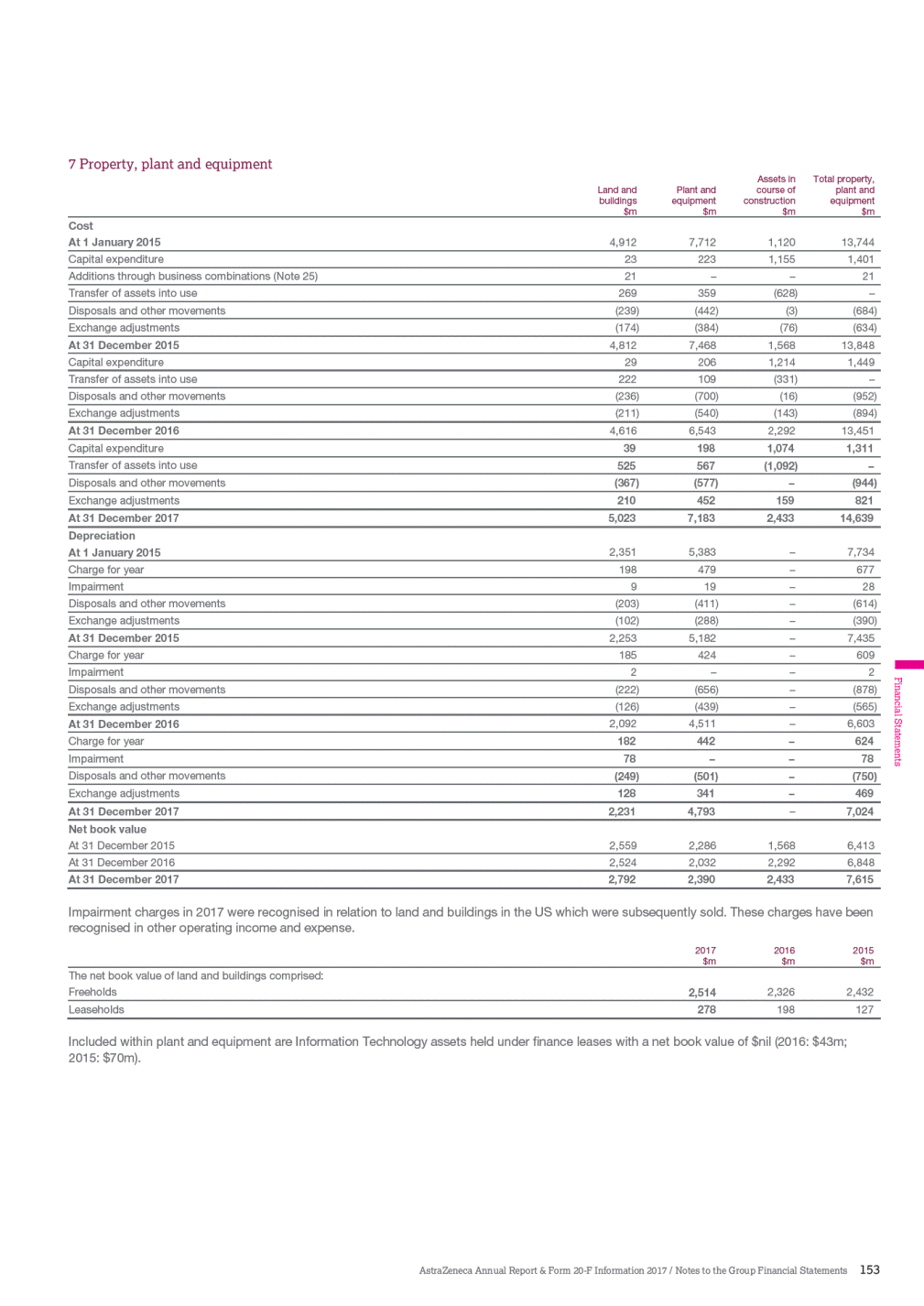 7 Property, plant and equipment Assets in course of construction Total property, plant and equipment Land and buildings Plant and equipment $m $m $m $m Cost At 1 January 2015 4,912 7,712 1,120 13,744 Capital expenditure 23 223 1,155 1,401 Additions through business combinations (Note 25) 21 – – 21 Transfer of assets into use 269 359 (628) – Disposals and other movements (239) (442) (3) (684) Exchange adjustments (174) (384) (76) (634) At 31 December 2015 4,812 7,468 1,568 13,848 Capital expenditure 29 206 1,214 1,449 Transfer of assets into use 222 109 (331) – Disposals and other movements (236) (700) (16) (952) Exchange adjustments (211) (540) (143) (894) At 31 December 2016 4,616 6,543 2,292 13,451 Capital expenditure 39 198 1,074 1,311 Transfer of assets into use 525 567 (1,092) – Disposals and other movements (367) (577) – (944) Exchange adjustments 210 452 159 821 At 31 December 2017 5,023 7,183 2,433 14,639 Depreciation At 1 January 2015 2,351 5,383 – 7,734 Charge for year 198 479 – 677 Impairment 9 19 – 28 Disposals and other movements (203) (411) – (614) Exchange adjustments (102) (288) – (390) At 31 December 2015 2,253 5,182 – 7,435 Charge for year 185 424 – 609 Impairment 2 – – 2 Disposals and other movements (222) (656) – (878) Exchange adjustments (126) (439) – (565) At 31 December 2016 2,092 4,511 – 6,603 Charge for year 182 442 – 624 Impairment 78 – – 78 Disposals and other movements (249) (501) – (750) Exchange adjustments 128 341 – 469 At 31 December 2017 2,231 4,793 – 7,024 Net book value At 31 December 2015 2,559 2,286 1,568 6,413 At 31 December 2016 2,524 2,032 2,292 6,848 At 31 December 2017 2,792 2,390 2,433 7,615 Impairment charges in 2017 were recognised in relation to land and buildings in the US which were subsequently sold. These charges have been recognised in other operating income and expense. 2017 2016 2015 $m $m $m The net book value of land and buildings comprised: Freeholds 2,514 2,326 2,432 Leaseholds 278 198 127 Included within plant and equipment are Information Technology assets held under finance leases with a net book value of $nil (2016: $43m; 2015: $70m). AstraZeneca Annual Report & Form 20-F Information 2017 / Notes to the Group Financial Statements 153 Financial Statements
