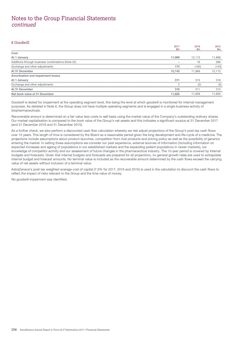 Notes to the Group Financial Statements continued 8 Goodwill 2017 2016 2015 $m $m $m Cost At 1 January 11,969 12,113 11,868 Additions through business combinations (Note 25) – 19 388 Exchange and other adjustments 174 (163) (143) At 31 December 12,143 11,969 12,113 Amortisation and impairment losses At 1 January 311 313 318 Exchange and other adjustments 7 (2) (5) At 31 December 318 311 313 Net book value at 31 December 11,825 11,658 11,800 Goodwill is tested for impairment at the operating segment level, this being the level at which goodwill is monitored for internal management purposes. As detailed in Note 6, the Group does not have multiple operating segments and is engaged in a single business activity of biopharmaceuticals. Recoverable amount is determined on a fair value less costs to sell basis using the market value of the Company’s outstanding ordinary shares. Our market capitalisation is compared to the book value of the Group’s net assets and this indicates a significant surplus at 31 December 2017 (and 31 December 2016 and 31 December 2015). As a further check, we also perform a discounted cash flow calculation whereby we risk adjust projections of the Group’s post-tax cash flows over 10 years. This length of time is considered by the Board as a reasonable period given the long development and life-cycle of a medicine. The projections include assumptions about product launches, competition from rival products and pricing policy as well as the possibility of generics entering the market. In setting these assumptions we consider our past experience, external sources of information (including information on expected increases and ageing of populations in our established markets and the expanding patient populations in newer markets), our knowledge of competitor activity and our assessment of future changes in the pharmaceutical industry. The 10-year period is covered by internal budgets and forecasts. Given that internal budgets and forecasts are prepared for all projections, no general growth rates are used to extrapolate internal budget and forecast amounts. No terminal value is included as the recoverable amount determined by the cash flows exceed the carrying value of net assets without inclusion of a terminal value. AstraZeneca’s post-tax weighted average cost of capital (7.0% for 2017, 2016 and 2015) is used in the calculation to discount the cash flows to reflect the impact of risks relevant to the Group and the time value of money. No goodwill impairment was identified. 154 AstraZeneca Annual Report & Form 20-F Information 2017 / Financial Statements