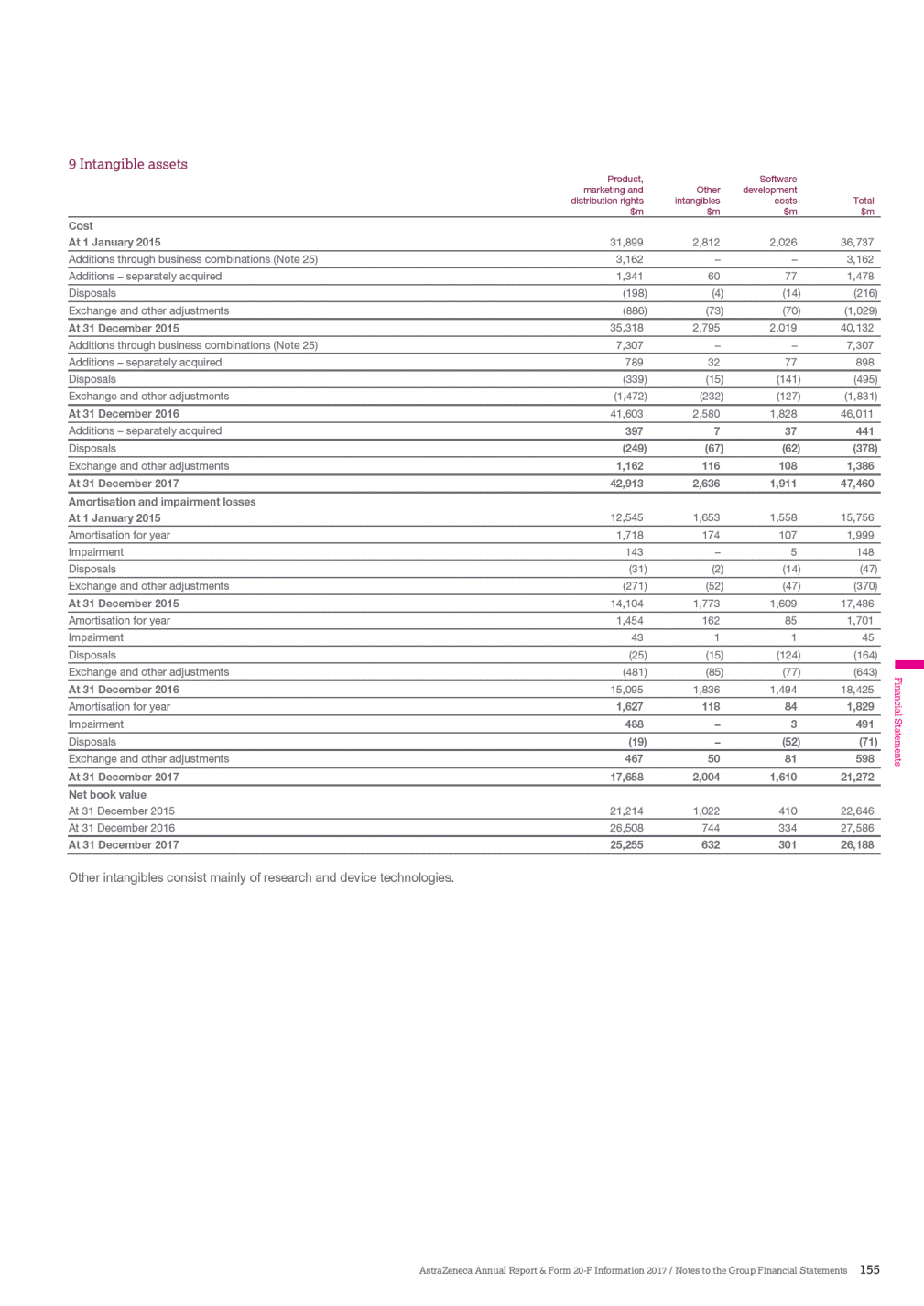 9 Intangible assets Product, marketing and distribution rights Software development costs Other intangibles Total $m $m $m $m Cost At 1 January 2015 31,899 2,812 2,026 36,737 Additions through business combinations (Note 25) 3,162 – – 3,162 Additions – separately acquired 1,341 60 77 1,478 Disposals (198) (4) (14) (216) Exchange and other adjustments (886) (73) (70) (1,029) At 31 December 2015 35,318 2,795 2,019 40,132 Additions through business combinations (Note 25) 7,307 – – 7,307 Additions – separately acquired 789 32 77 898 Disposals (339) (15) (141) (495) Exchange and other adjustments (1,472) (232) (127) (1,831) At 31 December 2016 41,603 2,580 1,828 46,011 Additions – separately acquired 397 7 37 441 Disposals (249) (67) (62) (378) Exchange and other adjustments 1,162 116 108 1,386 At 31 December 2017 42,913 2,636 1,911 47,460 Amortisation and impairment losses At 1 January 2015 12,545 1,653 1,558 15,756 Amortisation for year 1,718 174 107 1,999 Impairment 143 – 5 148 Disposals (31) (2) (14) (47) Exchange and other adjustments (271) (52) (47) (370) 14,104 1,773 1,609 17,486 At 31 December 2015 Amortisation for year 1,454 162 85 1,701 Impairment 43 1 1 45 Disposals (25) (15) (124) (164) Exchange and other adjustments (481) (85) (77) (643) At 31 December 2016 15,095 1,836 1,494 18,425 Amortisation for year 1,627 118 84 1,829 Impairment 488 – 3 491 Disposals (19) – (52) (71) Exchange and other adjustments 467 50 81 598 At 31 December 2017 17,658 2,004 1,610 21,272 Net book value At 31 December 2015 21,214 1,022 410 22,646 At 31 December 2016 26,508 744 334 27,586 At 31 December 2017 25,255 632 301 26,188 Other intangibles consist mainly of research and device technologies. AstraZeneca Annual Report & Form 20-F Information 2017 / Notes to the Group Financial Statements 155 Financial Statements