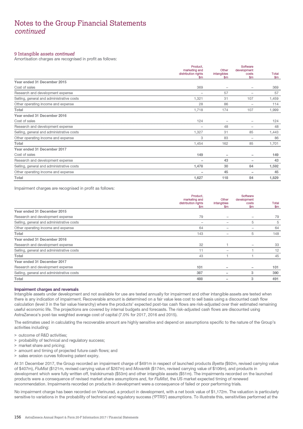 Notes to the Group Financial Statements continued 9 Intangible assets continued Amortisation charges are recognised in profit as follows: Product, marketing and distribution rights Software development costs Other intangibles Total $m $m $m $m Year ended 31 December 2015 Cost of sales 369 – – 369 Research and development expense – 57 – 57 Selling, general and administrative costs 1,321 31 107 1,459 Other operating income and expense 28 86 – 114 Total 1,718 174 107 1,999 Year ended 31 December 2016 Cost of sales 124 – – 124 Research and development expense – 48 – 48 Selling, general and administrative costs 1,327 31 85 1,443 Other operating income and expense 3 83 – 86 Total 1,454 162 85 1,701 Year ended 31 December 2017 Cost of sales 149 – – 149 Research and development expense – 43 – 43 Selling, general and administrative costs 1,478 30 84 1,592 Other operating income and expense – 45 – 45 Total 1,627 118 84 1,829 Impairment charges are recognised in profit as follows: Product, marketing and distribution rights Software development costs Other intangibles Total $m $m $m $m Year ended 31 December 2015 Research and development expense 79 – – 79 Selling, general and administrative costs – – 5 5 Other operating income and expense 64 – – 64 Total 143 – 5 148 Year ended 31 December 2016 Research and development expense 32 1 – 33 Selling, general and administrative costs 11 – 1 12 Total 43 1 1 45 Year ended 31 December 2017 Research and development expense 101 – – 101 Selling, general and administrative costs 387 – 3 390 Total 488 – 3 491 Impairment charges and reversals Intangible assets under development and not available for use are tested annually for impairment and other intangible assets are tested when there is any indication of impairment. Recoverable amount is determined on a fair value less cost to sell basis using a discounted cash flow calculation (level 3 in the fair value hierarchy) where the products’ expected post-tax cash flows are risk-adjusted over their estimated remaining useful economic life. The projections are covered by internal budgets and forecasts. The risk-adjusted cash flows are discounted using AstraZeneca’s post-tax weighted average cost of capital (7.0% for 2017, 2016 and 2015). The estimates used in calculating the recoverable amount are highly sensitive and depend on assumptions specific to the nature of the Group’s activities including: ! outcome of R&D activities; ! probability of technical and regulatory success; ! market share and pricing; ! amount and timing of projected future cash flows; and ! sales erosion curves following patent expiry. At 31 December 2017, the Group recorded an impairment charge of $491m in respect of launched products Byetta ($92m, revised carrying value of $407m), FluMist ($121m, revised carrying value of $267m) and Movantik ($174m, revised carrying value of $106m), and products in development which were fully written off, tralokinumab ($53m) and other intangible assets ($51m). The impairments recorded on the launched products were a consequence of revised market share assumptions and, for FluMist, the US market expected timing of renewed recommendation. Impairments recorded on products in development were a consequence of failed or poor performing trials. No impairment charge has been recorded on Verinurad, a product in development, with a net book value of $1,172m. The valuation is particularly sensitive to variations in the probability of technical and regulatory success (‘PTRS’) assumptions. To illustrate this, sensitivities performed at the 156 AstraZeneca Annual Report & Form 20-F Information 2017 / Financial Statements