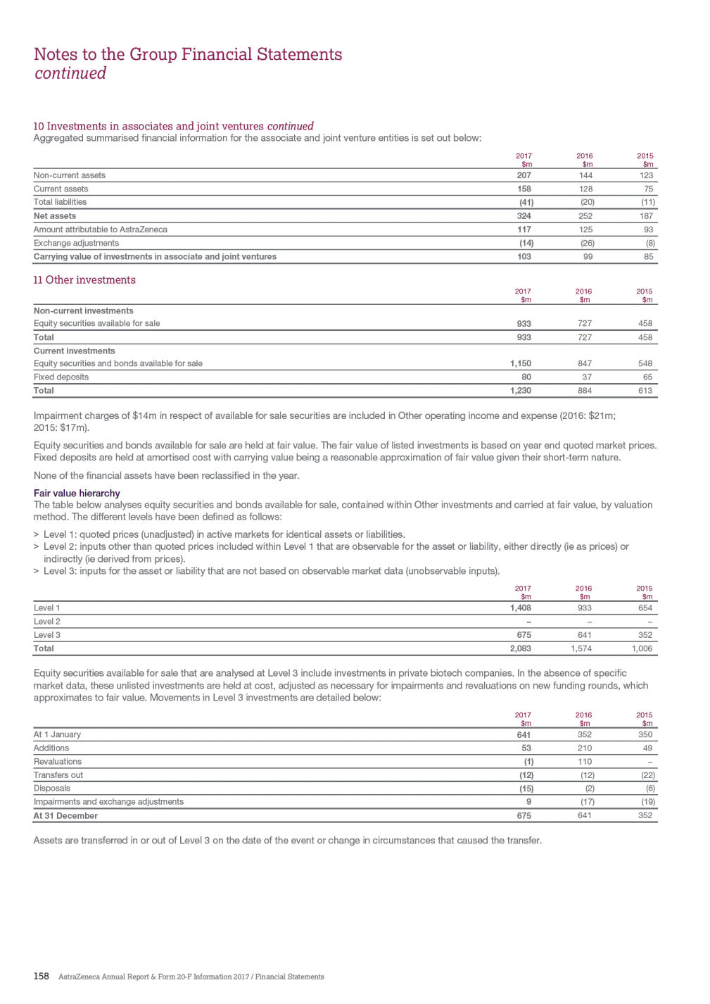 Notes to the Group Financial Statements continued 10 Investments in associates and joint ventures continued Aggregated summarised financial information for the associate and joint venture entities is set out below: 2017 2016 2015 $m $m $m Non-current assets 207 144 123 Current assets 158 128 75 Total liabilities (41) (20) (11) Net assets 324 252 187 Amount attributable to AstraZeneca 117 125 93 Exchange adjustments (26) (8) (14) Carrying value of investments in associate and joint ventures 103 99 85 11 Other investments 2017 2016 2015 $m $m $m Non-current investments Equity securities available for sale 933 727 458 Total 933 727 458 Current investments Equity securities and bonds available for sale 1,150 847 548 Fixed deposits 80 37 65 Total 1,230 884 613 Impairment charges of $14m in respect of available for sale securities are included in Other operating income and expense (2016: $21m; 2015: $17m). Equity securities and bonds available for sale are held at fair value. The fair value of listed investments is based on year end quoted market prices. Fixed deposits are held at amortised cost with carrying value being a reasonable approximation of fair value given their short-term nature. None of the financial assets have been reclassified in the year. Fair value hierarchy The table below analyses equity securities and bonds available for sale, contained within Other investments and carried at fair value, by valuation method. The different levels have been defined as follows: ! Level 1: quoted prices (unadjusted) in active markets for identical assets or liabilities. ! Level 2: inputs other than quoted prices included within Level 1 that are observable for the asset or liability, either directly (ie as prices) or indirectly (ie derived from prices). ! Level 3: inputs for the asset or liability that are not based on observable market data (unobservable inputs). 2017 2016 2015 $m $m $m Level 1 1,408 933 654 Level 2 – – – Level 3 675 641 352 Total 2,083 1,574 1,006 Equity securities available for sale that are analysed at Level 3 include investments in private biotech companies. In the absence of specific market data, these unlisted investments are held at cost, adjusted as necessary for impairments and revaluations on new funding rounds, which approximates to fair value. Movements in Level 3 investments are detailed below: 2017 2016 2015 $m $m $m At 1 January 641 352 350 Additions 53 210 49 Revaluations (1) 110 – Transfers out (12) (12) (22) Disposals (15) (2) (6) Impairments and exchange adjustments 9 (17) (19) At 31 December 675 641 352 Assets are transferred in or out of Level 3 on the date of the event or change in circumstances that caused the transfer. 158 AstraZeneca Annual Report & Form 20-F Information 2017 / Financial Statements