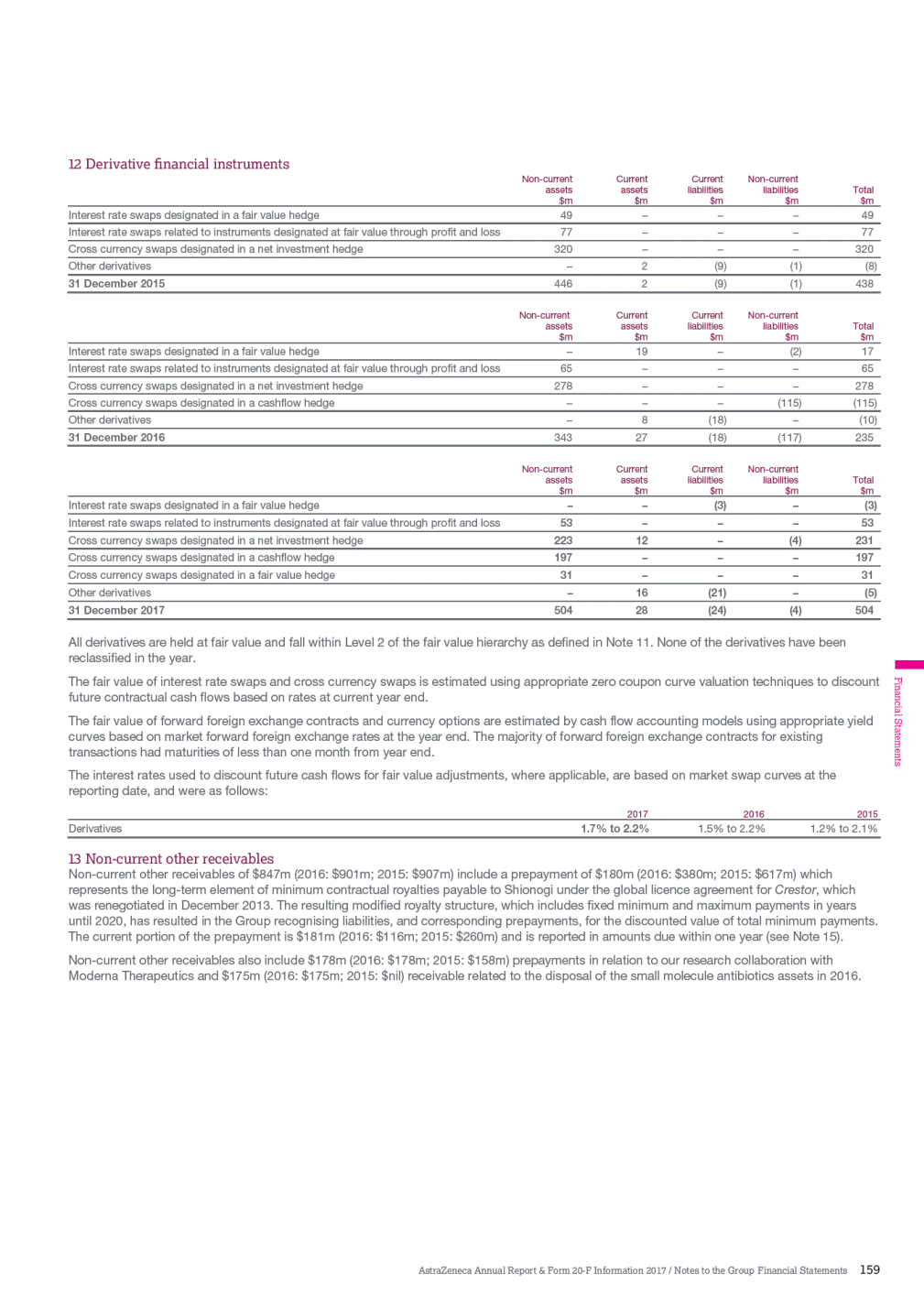 12 Derivative nancial instruments Non-current assets Current assets Current liabilities Non-current liabilities Total $m $m $m $m $m Interest rate swaps designated in a fair value hedge 49 – – – 49 Interest rate swaps related to instruments designated at fair value through profit and loss 77 – – – 77 Cross currency swaps designated in a net investment hedge 320 – – – 320 Other derivatives – 2 (9) (1) (8) 31 December 2015 446 2 (9) (1) 438 Non-current assets Current assets Current liabilities Non-current liabilities Total $m $m $m $m $m Interest rate swaps designated in a fair value hedge – 19 – (2) 17 Interest rate swaps related to instruments designated at fair value through profit and loss 65 – – – 65 Cross currency swaps designated in a net investment hedge 278 – – – 278 Cross currency swaps designated in a cashflow hedge – – – (115) (115) Other derivatives – 8 (18) – (10) 343 27 (18) (117) 235 31 December 2016 Non-current assets Current assets Current liabilities Non-current liabilities Total $m $m $m $m $m Interest rate swaps designated in a fair value hedge – – (3) – (3) Interest rate swaps related to instruments designated at fair value through profit and loss 53 – – – 53 Cross currency swaps designated in a net investment hedge 223 12 – (4) 231 Cross currency swaps designated in a cashflow hedge 197 – – – 197 Cross currency swaps designated in a fair value hedge 31 – – – 31 Other derivatives – 16 (21) – (5) 31 December 2017 504 28 (24) (4) 504 All derivatives are held at fair value and fall within Level 2 of the fair value hierarchy as defined in Note 11. None of the derivatives have been reclassified in the year. The fair value of interest rate swaps and cross currency swaps is estimated using appropriate zero coupon curve valuation techniques to discount future contractual cash flows based on rates at current year end. The fair value of forward foreign exchange contracts and currency options are estimated by cash flow accounting models using appropriate yield curves based on market forward foreign exchange rates at the year end. The majority of forward foreign exchange contracts for existing transactions had maturities of less than one month from year end. The interest rates used to discount future cash flows for fair value adjustments, where applicable, are based on market swap curves at the reporting date, and were as follows: 2017 2016 2015 Derivatives 1.7% to 2.2% 1.5% to 2.2% 1.2% to 2.1% 13 Non-current other receivables Non-current other receivables of $847m (2016: $901m; 2015: $907m) include a prepayment of $180m (2016: $380m; 2015: $617m) which represents the long-term element of minimum contractual royalties payable to Shionogi under the global licence agreement for Crestor, which was renegotiated in December 2013. The resulting modified royalty structure, which includes fixed minimum and maximum payments in years until 2020, has resulted in the Group recognising liabilities, and corresponding prepayments, for the discounted value of total minimum payments. The current portion of the prepayment is $181m (2016: $116m; 2015: $260m) and is reported in amounts due within one year (see Note 15). Non-current other receivables also include $178m (2016: $178m; 2015: $158m) prepayments in relation to our research collaboration with Moderna Therapeutics and $175m (2016: $175m; 2015: $nil) receivable related to the disposal of the small molecule antibiotics assets in 2016. AstraZeneca Annual Report & Form 20-F Information 2017 / Notes to the Group Financial Statements 159 Financial Statements