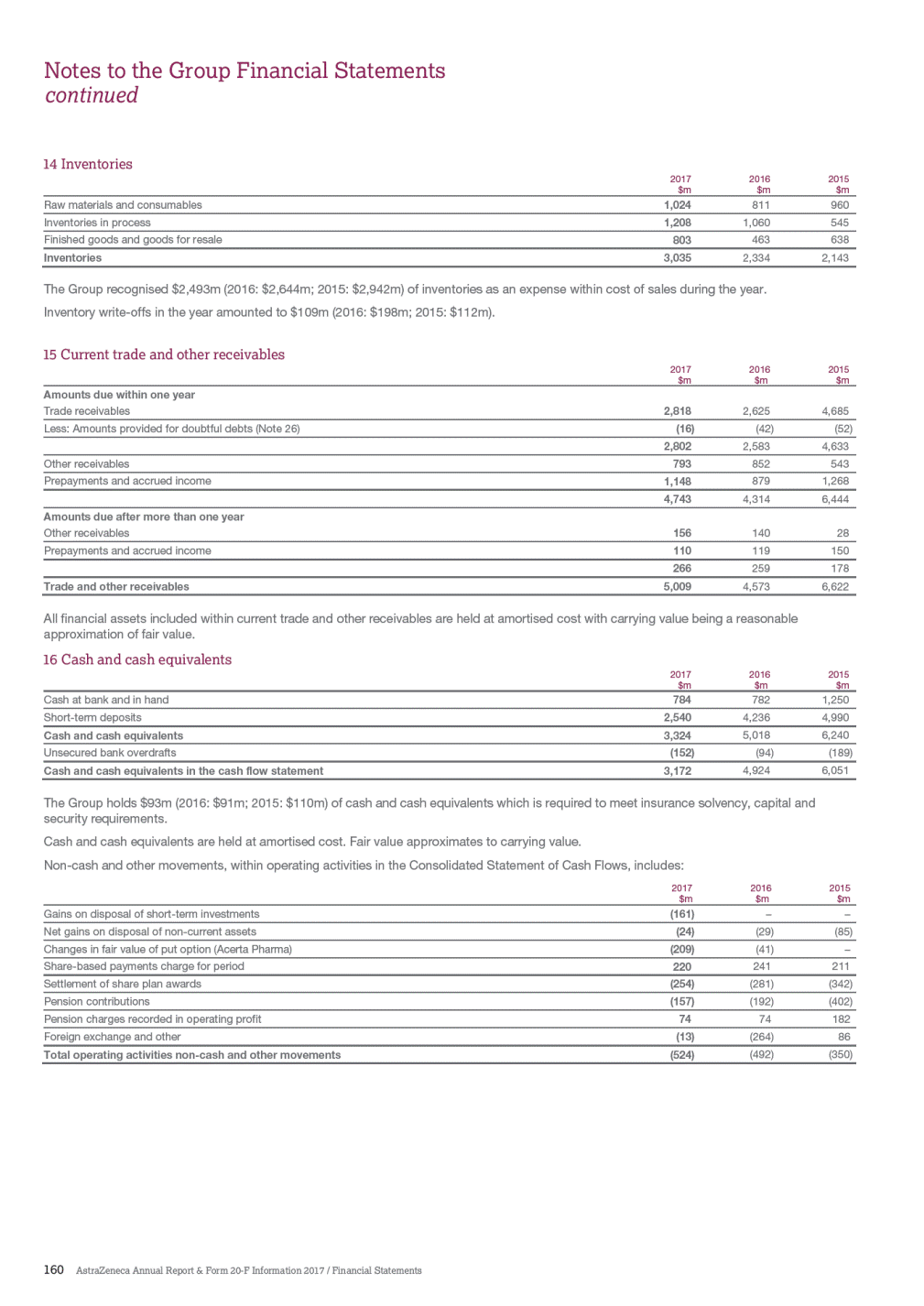 Notes to the Group Financial Statements continued 14 Inventories 2017 2016 2015 $m $m $m Raw materials and consumables 1,024 811 960 Inventories in process 1,208 1,060 545 Finished goods and goods for resale 803 463 638 Inventories 3,035 2,334 2,143 The Group recognised $2,493m (2016: $2,644m; 2015: $2,942m) of inventories as an expense within cost of sales during the year. Inventory write-offs in the year amounted to $109m (2016: $198m; 2015: $112m). 15 Current trade and other receivables 2017 2016 2015 $m $m $m Amounts due within one year Trade receivables 2,818 2,625 4,685 Less: Amounts provided for doubtful debts (Note 26) (16) (42) (52) 2,802 2,583 4,633 Other receivables 852 543 793 Prepayments and accrued income 1,148 879 1,268 4,743 4,314 6,444 Amounts due after more than one year Other receivables 156 140 28 Prepayments and accrued income 119 150 110 266 259 178 Trade and other receivables 5,009 4,573 6,622 All financial assets included within current trade and other receivables are held at amortised cost with carrying value being a reasonable approximation of fair value. 16 Cash and cash equivalents 2017 2016 2015 $m $m $m Cash at bank and in hand 784 782 1,250 Short-term deposits 2,540 4,236 4,990 Cash and cash equivalents 3,324 5,018 6,240 Unsecured bank overdrafts (152) (94) (189) Cash and cash equivalents in the cash flow statement 3,172 4,924 6,051 The Group holds $93m (2016: $91m; 2015: $110m) of cash and cash equivalents which is required to meet insurance solvency, capital and security requirements. Cash and cash equivalents are held at amortised cost. Fair value approximates to carrying value. Non-cash and other movements, within operating activities in the Consolidated Statement of Cash Flows, includes: 2017 2016 2015 $m $m $m Gains on disposal of short-term investments (161) – – Net gains on disposal of non-current assets (24) (29) (85) Changes in fair value of put option (Acerta Pharma) (209) (41) – Share-based payments charge for period 220 241 211 Settlement of share plan awards (281) (342) (254) Pension contributions (157) (192) (402) Pension charges recorded in operating profit 74 74 182 Foreign exchange and other (13) (264) 86 Total operating activities non-cash and other movements (524) (492) (350) 160 AstraZeneca Annual Report & Form 20-F Information 2017 / Financial Statements