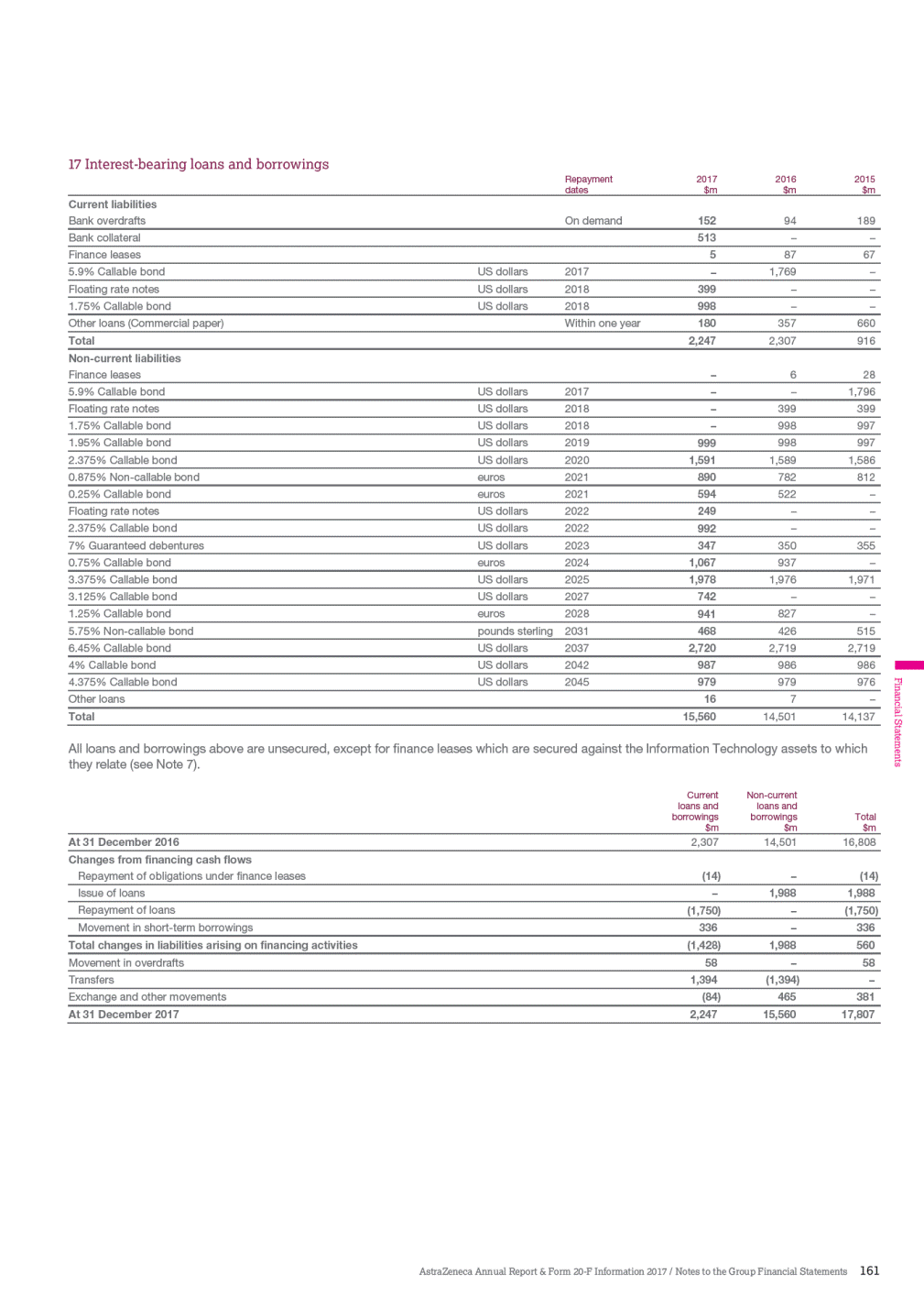 17 Interest-bearing loans and borrowings Repayment 2017 2016 2015 dates $m $m $m Current liabilities Bank overdrafts On demand 152 94 189 Bank collateral 513 – – Finance leases 5 87 67 5.9% Callable bond US dollars 2017 – 1,769 – Floating rate notes US dollars 2018 399 – – 1.75% Callable bond US dollars 2018 998 – – Other loans (Commercial paper) Within one year 180 357 660 Total 2,247 2,307 916 Non-current liabilities Finance leases – 6 28 5.9% Callable bond US dollars 2017 – – 1,796 Floating rate notes US dollars 2018 – 399 399 1.75% Callable bond US dollars 2018 – 998 997 1.95% Callable bond US dollars 2019 999 998 997 2.375% Callable bond US dollars 2020 1,591 1,589 1,586 0.875% Non-callable bond euros 2021 890 782 812 0.25% Callable bond euros 2021 594 522 – Floating rate notes US dollars 2022 249 – – 2.375% Callable bond US dollars 2022 992 – – 7% Guaranteed debentures US dollars 2023 347 350 355 0.75% Callable bond euros 2024 1,067 937 – 3.375% Callable bond US dollars 2025 1,978 1,976 1,971 3.125% Callable bond US dollars 2027 742 – – 1.25% Callable bond euros 2028 941 827 – 5.75% Non-callable bond pounds sterling 2031 468 426 515 6.45% Callable bond US dollars 2037 2,720 2,719 2,719 4% Callable bond US dollars 2042 987 986 986 4.375% Callable bond US dollars 2045 979 979 976 Other loans 16 7 – Total 15,560 14,501 14,137 All loans and borrowings above are unsecured, except for finance leases which are secured against the Information Technology assets to which they relate (see Note 7). Current loans and borrowings Non-current loans and borrowings Total $m $m $m At 31 December 2016 2,307 14,501 16,808 Changes from financing cash flows Repayment of obligations under finance leases (14) – (14) Issue of loans – 1,988 1,988 Repayment of loans (1,750) – (1,750) Movement in short-term borrowings 336 – 336 Total changes in liabilities arising on financing activities (1,428) 1,988 560 Movement in overdrafts 58 – 58 Transfers 1,394 (1,394) – Exchange and other movements (84) 465 381 At 31 December 2017 2,247 15,560 17,807 AstraZeneca Annual Report & Form 20-F Information 2017 / Notes to the Group Financial Statements 161 Financial Statements