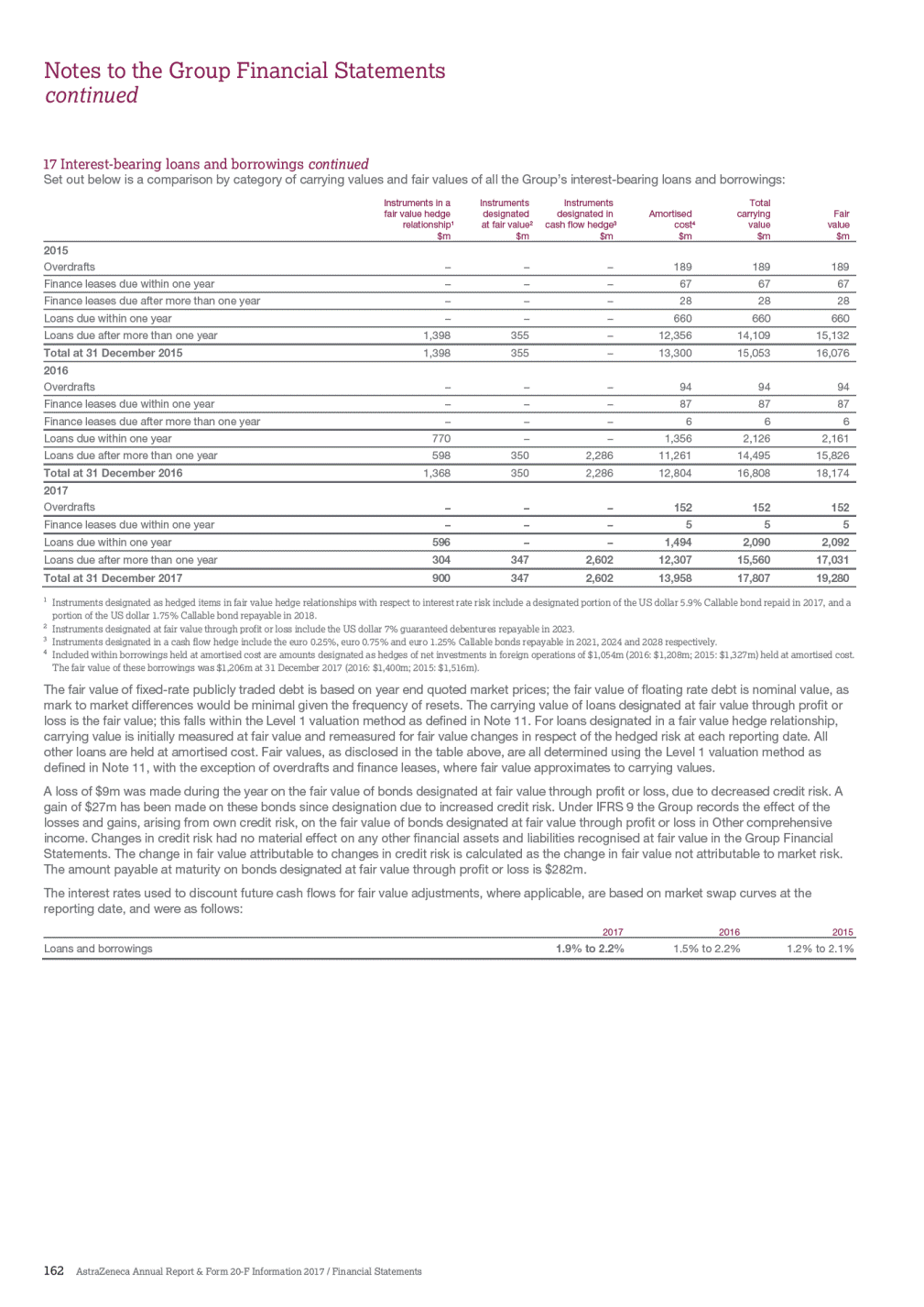 Notes to the Group Financial Statements continued 17 Interest-bearing loans and borrowings continued Set out below is a comparison by category of carrying values and fair values of all the Group’s interest-bearing loans and borrowings: Instruments in a fair value hedge relationship1 Instruments designated at fair value2 Instruments designated in cash flow hedge3 Total carrying value Amortised cost4 Fair value $m $m $m $m $m $m 2015 Overdrafts – – – 189 189 189 Finance leases due within one year – – – 67 67 67 Finance leases due after more than one year – – – 28 28 28 Loans due within one year – – – 660 660 660 Loans due after more than one year 1,398 355 – 12,356 14,109 15,132 Total at 31 December 2015 1,398 355 – 13,300 15,053 16,076 2016 Overdrafts – – – 94 94 94 Finance leases due within one year – – – 87 87 87 Finance leases due after more than one year – – – 6 6 6 Loans due within one year 770 – – 1,356 2,126 2,161 Loans due after more than one year 598 350 2,286 11,261 14,495 15,826 Total at 31 December 2016 1,368 350 2,286 12,804 16,808 18,174 2017 Overdrafts – – – 152 152 152 Finance leases due within one year – – – 5 5 5 Loans due within one year 596 – – 1,494 2,090 2,092 Loans due after more than one year 304 347 2,602 12,307 15,560 17,031 Total at 31 December 2017 900 347 2,602 13,958 17,807 19,280 1 Instruments designated as hedged items in fair value hedge relationships with respect to interest rate risk include a designated portion of the US dollar 5.9% Callable bond repaid in 2017, and a portion of the US dollar 1.75% Callable bond repayable in 2018. 2 Instruments designated at fair value through profit or loss include the US dollar 7% guaranteed debentures repayable in 2023. 3 Instruments designated in a cash flow hedge include the euro 0.25%, euro 0.75% and euro 1.25% Callable bonds repayable in 2021, 2024 and 2028 respectively. 4 Included within borrowings held at amortised cost are amounts designated as hedges of net investments in foreign operations of $1,054m (2016: $1,208m; 2015: $1,327m) held at amortised cost. The fair value of these borrowings was $1,206m at 31 December 2017 (2016: $1,400m; 2015: $1,516m). The fair value of fixed-rate publicly traded debt is based on year end quoted market prices; the fair value of floating rate debt is nominal value, as mark to market differences would be minimal given the frequency of resets. The carrying value of loans designated at fair value through profit or loss is the fair value; this falls within the Level 1 valuation method as defined in Note 11. For loans designated in a fair value hedge relationship, carrying value is initially measured at fair value and remeasured for fair value changes in respect of the hedged risk at each reporting date. All other loans are held at amortised cost. Fair values, as disclosed in the table above, are all determined using the Level 1 valuation method as defined in Note 11, with the exception of overdrafts and finance leases, where fair value approximates to carrying values. A loss of $9m was made during the year on the fair value of bonds designated at fair value through profit or loss, due to decreased credit risk. A gain of $27m has been made on these bonds since designation due to increased credit risk. Under IFRS 9 the Group records the effect of the losses and gains, arising from own credit risk, on the fair value of bonds designated at fair value through profit or loss in Other comprehensive income. Changes in credit risk had no material effect on any other financial assets and liabilities recognised at fair value in the Group Financial Statements. The change in fair value attributable to changes in credit risk is calculated as the change in fair value not attributable to market risk. The amount payable at maturity on bonds designated at fair value through profit or loss is $282m. The interest rates used to discount future cash flows for fair value adjustments, where applicable, are based on market swap curves at the reporting date, and were as follows: 2017 2016 2015 Loans and borrowings 1.9% to 2.2% 1.5% to 2.2% 1.2% to 2.1% 162 AstraZeneca Annual Report & Form 20-F Information 2017 / Financial Statements