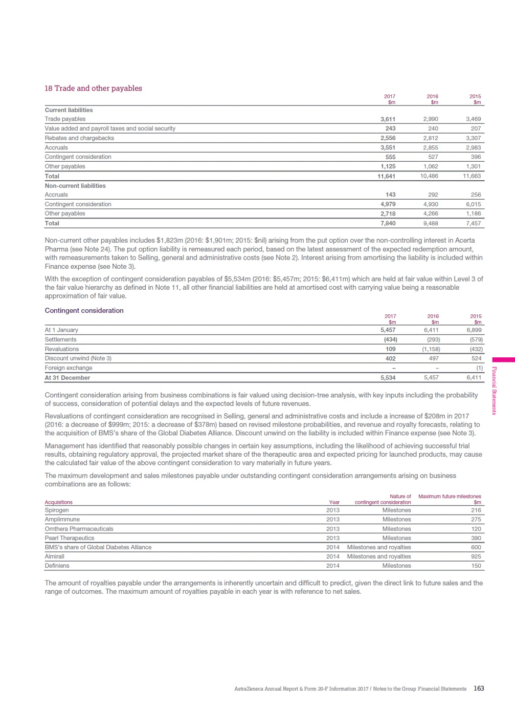 18 Trade and other payables 2017 2016 2015 $m $m $m Current liabilities Trade payables 3,611 2,990 3,469 Value added and payroll taxes and social security 243 240 207 Rebates and chargebacks 2,812 3,307 2,556 Accruals 3,551 2,855 2,983 Contingent consideration 555 527 396 Other payables 1,125 1,062 1,301 Total 11,641 10,486 11,663 Non-current liabilities Accruals 143 292 256 Contingent consideration 4,979 4,930 6,015 Other payables 2,718 4,266 1,186 Total 7,840 9,488 7,457 Non-current other payables includes $1,823m (2016: $1,901m; 2015: $nil) arising from the put option over the non-controlling interest in Acerta Pharma (see Note 24). The put option liability is remeasured each period, based on the latest assessment of the expected redemption amount, with remeasurements taken to Selling, general and administrative costs (see Note 2). Interest arising from amortising the liability is included within Finance expense (see Note 3). With the exception of contingent consideration payables of $5,534m (2016: $5,457m; 2015: $6,411m) which are held at fair value within Level 3 of the fair value hierarchy as defined in Note 11, all other financial liabilities are held at amortised cost with carrying value being a reasonable approximation of fair value. Contingent consideration 2017 2016 2015 $m $m $m At 1 January 5,457 6,411 6,899 Settlements (434) (293) (579) Revaluations 109 (1,158) (432) Discount unwind (Note 3) 402 497 524 Foreign exchange – – (1) At 31 December 5,534 5,457 6,411 Contingent consideration arising from business combinations is fair valued using decision-tree analysis, with key inputs including the probability of success, consideration of potential delays and the expected levels of future revenues. Revaluations of contingent consideration are recognised in Selling, general and administrative costs and include a increase of $208m in 2017 (2016: a decrease of $999m; 2015: a decrease of $378m) based on revised milestone probabilities, and revenue and royalty forecasts, relating to the acquisition of BMS’s share of the Global Diabetes Alliance. Discount unwind on the liability is included within Finance expense (see Note 3). Management has identified that reasonably possible changes in certain key assumptions, including the likelihood of achieving successful trial results, obtaining regulatory approval, the projected market share of the therapeutic area and expected pricing for launched products, may cause the calculated fair value of the above contingent consideration to vary materially in future years. The maximum development and sales milestones payable under outstanding contingent consideration arrangements arising on business combinations are as follows: Nature of Maximum future milestones Acquisitions Year contingent consideration $m Spirogen 2013 Milestones 216 Amplimmune 2013 Milestones 275 Omthera Pharmaceuticals 2013 Milestones 120 Pearl Therapeutics 2013 Milestones 390 BMS’s share of Global Diabetes Alliance 2014 Milestones and royalties 600 Almirall 2014 Milestones and royalties 925 Definiens 2014 Milestones 150 The amount of royalties payable under the arrangements is inherently uncertain and difficult to predict, given the direct link to future sales and the range of outcomes. The maximum amount of royalties payable in each year is with reference to net sales. AstraZeneca Annual Report & Form 20-F Information 2017 / Notes to the Group Financial Statements 163 Financial Statements