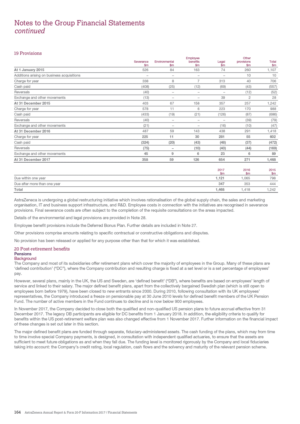 Notes to the Group Financial Statements continued 19 Provisions Employee benefits Other provisions Severance Environmental Legal Total $m $m $m $m $m $m At 1 January 2015 526 84 163 74 260 1,107 Additions arising on business acquisitions – – – – 10 10 Charge for year 338 8 7 313 40 706 Cash paid (408) (25) (12) (69) (43) (557) Reversals (40) – – – (12) (52) Exchange and other movements (13) – – 39 2 28 At 31 December 2015 403 67 158 357 257 1,242 Charge for year 578 11 6 223 170 988 Cash paid (433) (19) (21) (126) (87) (686) Reversals (40) – – – (39) (79) Exchange and other movements (21) – – (16) (10) (47) At 31 December 2016 487 59 143 438 291 1,418 Charge for year 225 11 30 281 55 602 Cash paid (324) (20) (43) (48) (37) (472) Reversals (75) – (10) (40) (44) (169) Exchange and other movements 45 9 6 23 6 89 At 31 December 2017 358 59 126 654 271 1,468 2017 2016 2015 $m $m $m Due within one year 1,121 1,065 798 Due after more than one year 353 444 347 Total 1,468 1,418 1,242 AstraZeneca is undergoing a global restructuring initiative which involves rationalisation of the global supply chain, the sales and marketing organisation, IT and business support infrastructure, and R&D. Employee costs in connection with the initiatives are recognised in severance provisions. Final severance costs are often subject to the completion of the requisite consultations on the areas impacted. Details of the environmental and legal provisions are provided in Note 28. Employee benefit provisions include the Deferred Bonus Plan. Further details are included in Note 27. Other provisions comprise amounts relating to specific contractual or constructive obligations and disputes. No provision has been released or applied for any purpose other than that for which it was established. 20 Post-retirement benets Pensions Background The Company and most of its subsidiaries offer retirement plans which cover the majority of employees in the Group. Many of these plans are ‘defined contribution’ (“DC”), where the Company contribution and resulting charge is fixed at a set level or is a set percentage of employees’ pay. However, several plans, mainly in the UK, the US and Sweden, are ‘defined benefit’ (“DB”), where benefits are based on employees’ length of service and linked to their salary. The major defined benefit plans, apart from the collectively bargained Swedish plan (which is still open to employees born before 1979), have been closed to new entrants since 2000. During 2010, following consultation with its UK employees’ representatives, the Company introduced a freeze on pensionable pay at 30 June 2010 levels for defined benefit members of the UK Pension Fund. The number of active members in the Fund continues to decline and is now below 900 employees. In November 2017, the Company decided to close both the qualified and non-qualified US pension plans to future accrual effective from 31 December 2017. The legacy DB participants are eligible for DC benefits from 1 January 2018. In addition, the eligibility criteria to qualify for benefits within the US post-retirement welfare plan was also changed effective from 1 November 2017. Further information on the financial impact of these changes is set out later in this section. The major defined benefit plans are funded through separate, fiduciary-administered assets. The cash funding of the plans, which may from time to time involve special Company payments, is designed, in consultation with independent qualified actuaries, to ensure that the assets are sufficient to meet future obligations as and when they fall due. The funding level is monitored rigorously by the Company and local fiduciaries taking into account: the Company’s credit rating, local regulation, cash flows and the solvency and maturity of the relevant pension scheme. 164 AstraZeneca Annual Report & Form 20-F Information 2017 / Financial Statements