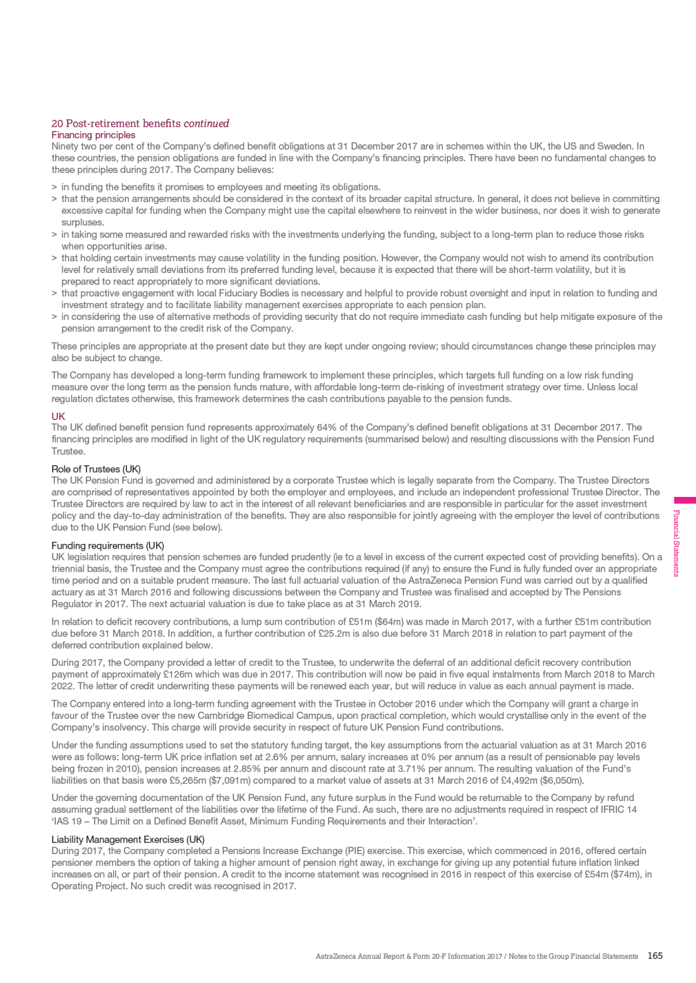 20 Post-retirement benets continued Financing principles Ninety two per cent of the Company’s defined benefit obligations at 31 December 2017 are in schemes within the UK, the US and Sweden. In these countries, the pension obligations are funded in line with the Company’s financing principles. There have been no fundamental changes to these principles during 2017. The Company believes: ! in funding the benefits it promises to employees and meeting its obligations. ! that the pension arrangements should be considered in the context of its broader capital structure. In general, it does not believe in committing excessive capital for funding when the Company might use the capital elsewhere to reinvest in the wider business, nor does it wish to generate surpluses. ! in taking some measured and rewarded risks with the investments underlying the funding, subject to a long-term plan to reduce those risks when opportunities arise. ! that holding certain investments may cause volatility in the funding position. However, the Company would not wish to amend its contribution level for relatively small deviations from its preferred funding level, because it is expected that there will be short-term volatility, but it is prepared to react appropriately to more significant deviations. ! that proactive engagement with local Fiduciary Bodies is necessary and helpful to provide robust oversight and input in relation to funding and investment strategy and to facilitate liability management exercises appropriate to each pension plan. ! in considering the use of alternative methods of providing security that do not require immediate cash funding but help mitigate exposure of the pension arrangement to the credit risk of the Company. These principles are appropriate at the present date but they are kept under ongoing review; should circumstances change these principles may also be subject to change. The Company has developed a long-term funding framework to implement these principles, which targets full funding on a low risk funding measure over the long term as the pension funds mature, with affordable long-term de-risking of investment strategy over time. Unless local regulation dictates otherwise, this framework determines the cash contributions payable to the pension funds. UK The UK defined benefit pension fund represents approximately 64% of the Company’s defined benefit obligations at 31 December 2017. The financing principles are modified in light of the UK regulatory requirements (summarised below) and resulting discussions with the Pension Fund Trustee. Role of Trustees (UK) The UK Pension Fund is governed and administered by a corporate Trustee which is legally separate from the Company. The Trustee Directors are comprised of representatives appointed by both the employer and employees, and include an independent professional Trustee Director. The Trustee Directors are required by law to act in the interest of all relevant beneficiaries and are responsible in particular for the asset investment policy and the day-to-day administration of the benefits. They are also responsible for jointly agreeing with the employer the level of contributions due to the UK Pension Fund (see below). Funding requirements (UK) UK legislation requires that pension schemes are funded prudently (ie to a level in excess of the current expected cost of providing benefits). On a triennial basis, the Trustee and the Company must agree the contributions required (if any) to ensure the Fund is fully funded over an appropriate time period and on a suitable prudent measure. The last full actuarial valuation of the AstraZeneca Pension Fund was carried out by a qualified actuary as at 31 March 2016 and following discussions between the Company and Trustee was finalised and accepted by The Pensions Regulator in 2017. The next actuarial valuation is due to take place as at 31 March 2019. In relation to deficit recovery contributions, a lump sum contribution of £51m ($64m) was made in March 2017, with a further £51m contribution due before 31 March 2018. In addition, a further contribution of £25.2m is also due before 31 March 2018 in relation to part payment of the deferred contribution explained below. During 2017, the Company provided a letter of credit to the Trustee, to underwrite the deferral of an additional deficit recovery contribution payment of approximately £126m which was due in 2017. This contribution will now be paid in five equal instalments from March 2018 to March 2022. The letter of credit underwriting these payments will be renewed each year, but will reduce in value as each annual payment is made. The Company entered into a long-term funding agreement with the Trustee in October 2016 under which the Company will grant a charge in favour of the Trustee over the new Cambridge Biomedical Campus, upon practical completion, which would crystallise only in the event of the Company’s insolvency. This charge will provide security in respect of future UK Pension Fund contributions. Under the funding assumptions used to set the statutory funding target, the key assumptions from the actuarial valuation as at 31 March 2016 were as follows: long-term UK price inflation set at 2.6% per annum, salary increases at 0% per annum (as a result of pensionable pay levels being frozen in 2010), pension increases at 2.85% per annum and discount rate at 3.71% per annum. The resulting valuation of the Fund’s liabilities on that basis were £5,265m ($7,091m) compared to a market value of assets at 31 March 2016 of £4,492m ($6,050m). Under the governing documentation of the UK Pension Fund, any future surplus in the Fund would be returnable to the Company by refund assuming gradual settlement of the liabilities over the lifetime of the Fund. As such, there are no adjustments required in respect of IFRIC 14 ‘IAS 19 – The Limit on a Defined Benefit Asset, Minimum Funding Requirements and their Interaction’. Liability Manag